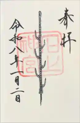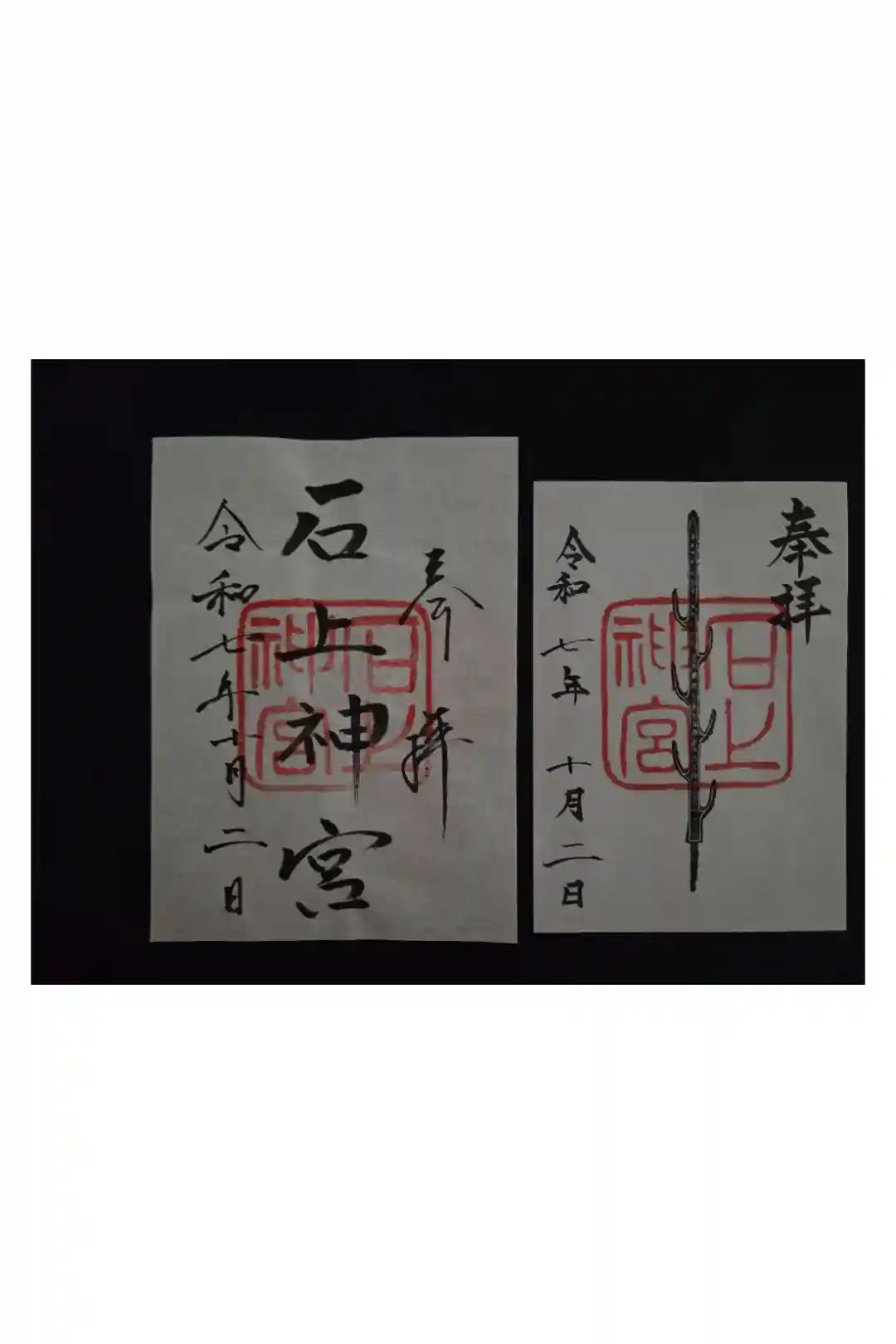 真ん中に「石上神宮」と墨書きされ、神社印が重ねられているものと、社宝の「七支刀」が描かれている2種類の御朱印を拝受できます。 | |||