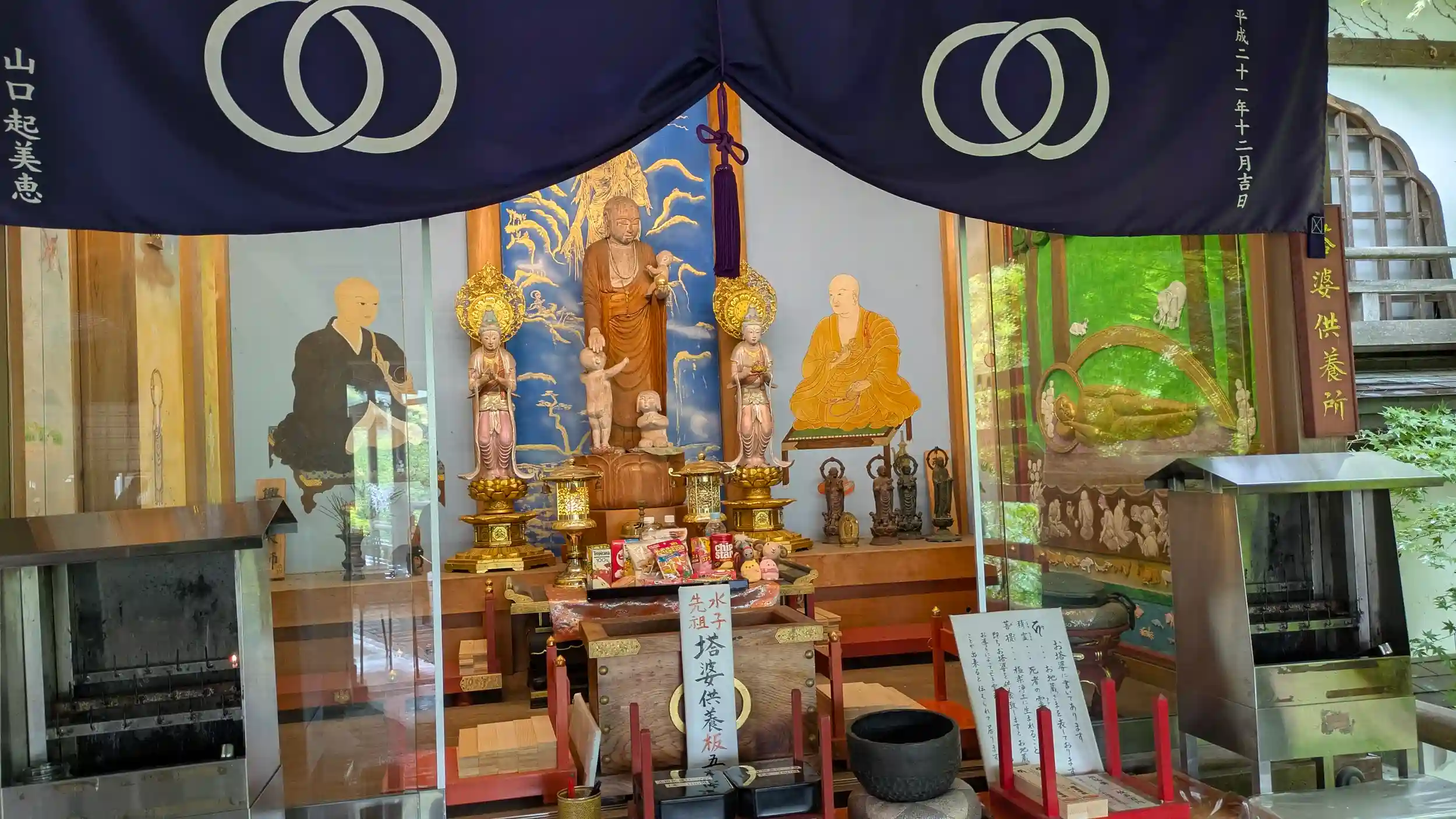 地蔵堂内の水子地藏と両大師。右手には釈迦涅槃像も