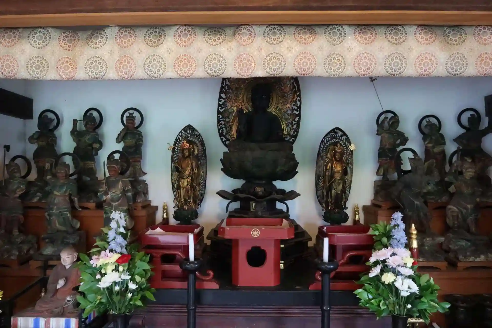 本堂を出てから薬師堂の扉の鍵も開けて頂いて薬師堂の中に入らせて頂きました。中尊の薬師如来坐像、両脇に日光、月光菩薩、その脇に6躯ずつの十二神将。薬師如来は院派の作、他は江戸時代の作。堂内は暗くわかり辛かったのですが、ご住職から「フラッシュを点けて撮るとよりよく写るから。」と言われてフラッシュ撮影(本堂内はフラッシュ未使用)。確かによくわかりますね。