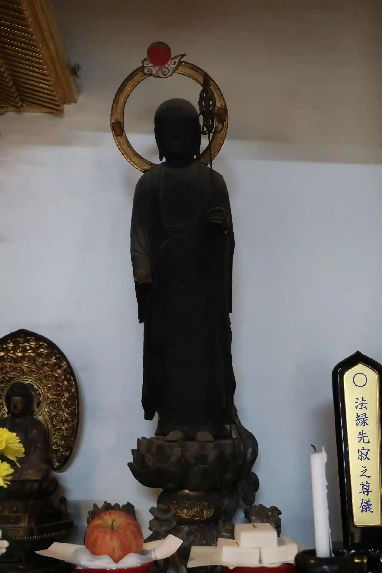 須弥壇に阿弥陀三尊。本尊の阿弥陀如来坐像は⾼さ約88cm、両脇侍は高さ約62cm、鎌倉時代の作で県指定⽂化財。右側の観音菩薩は片ヒザを立てて、左側の勢至菩薩はひざまずき、臨終の際に阿弥陀三尊が迎えに来る場⾯を表現しています。横から撮った写真を載せておきましたが、観音菩薩の衣が後ろへ流れている様に作られていて、「速く、直ぐに」という感じが伝わってきます。