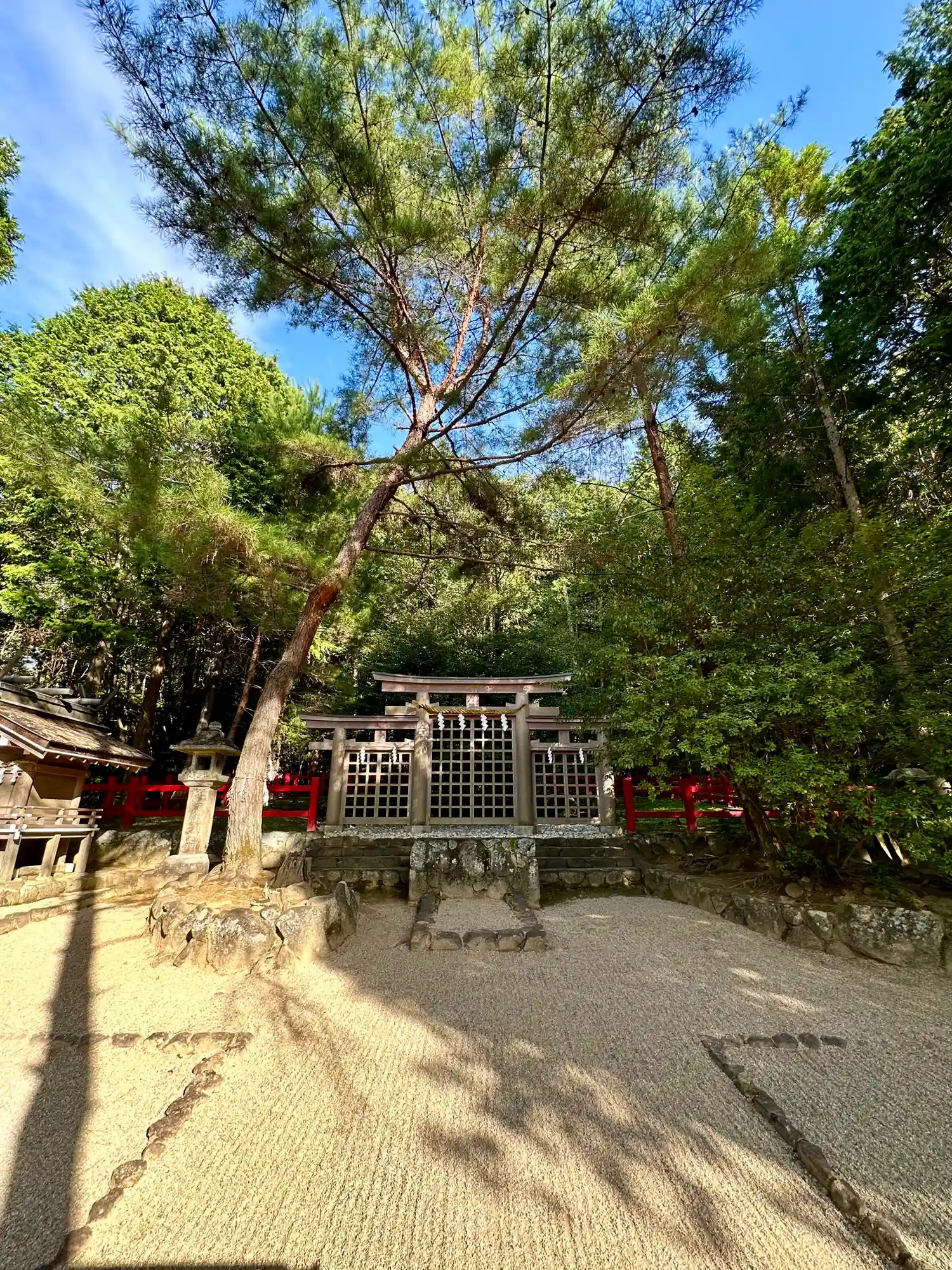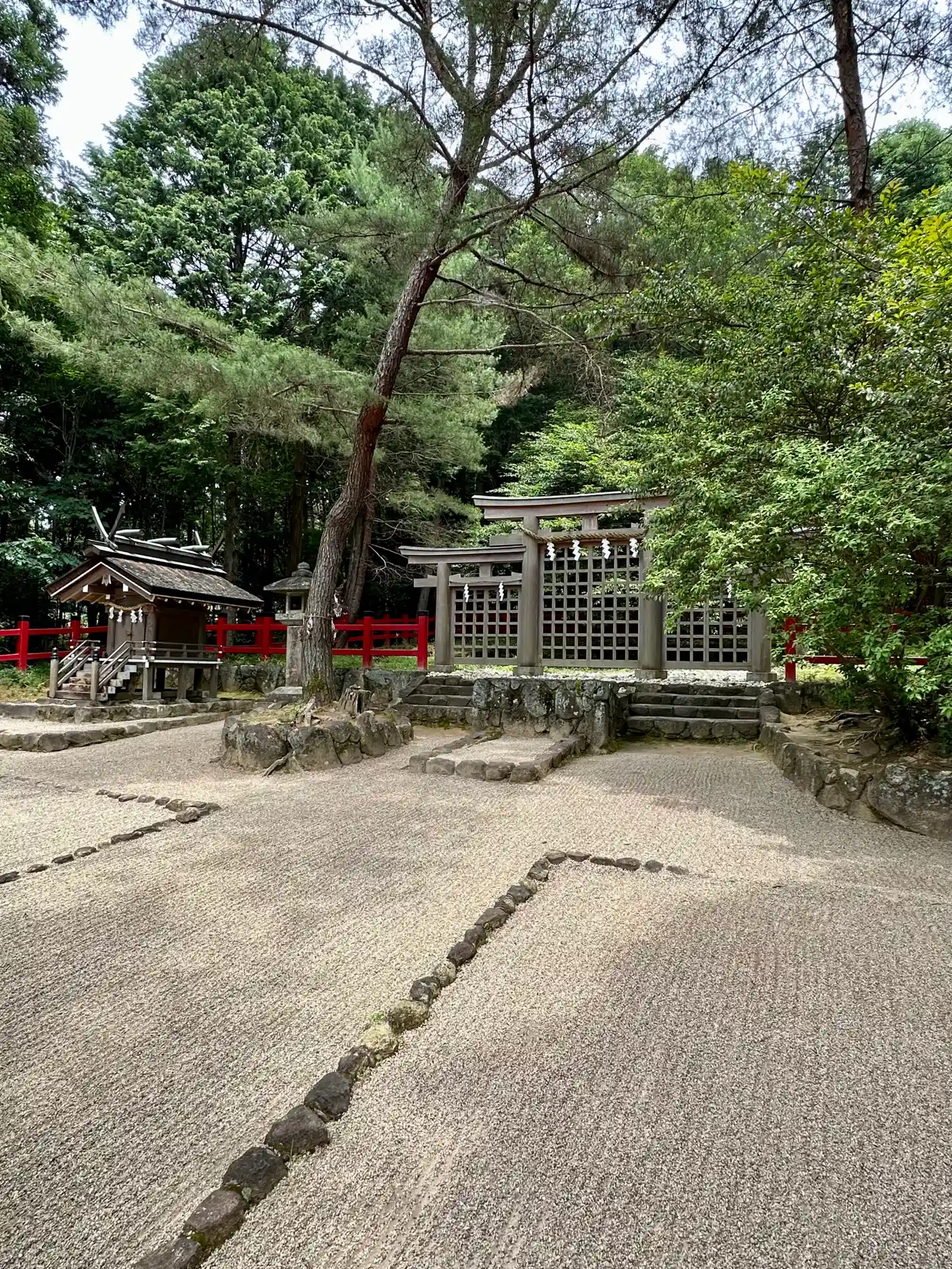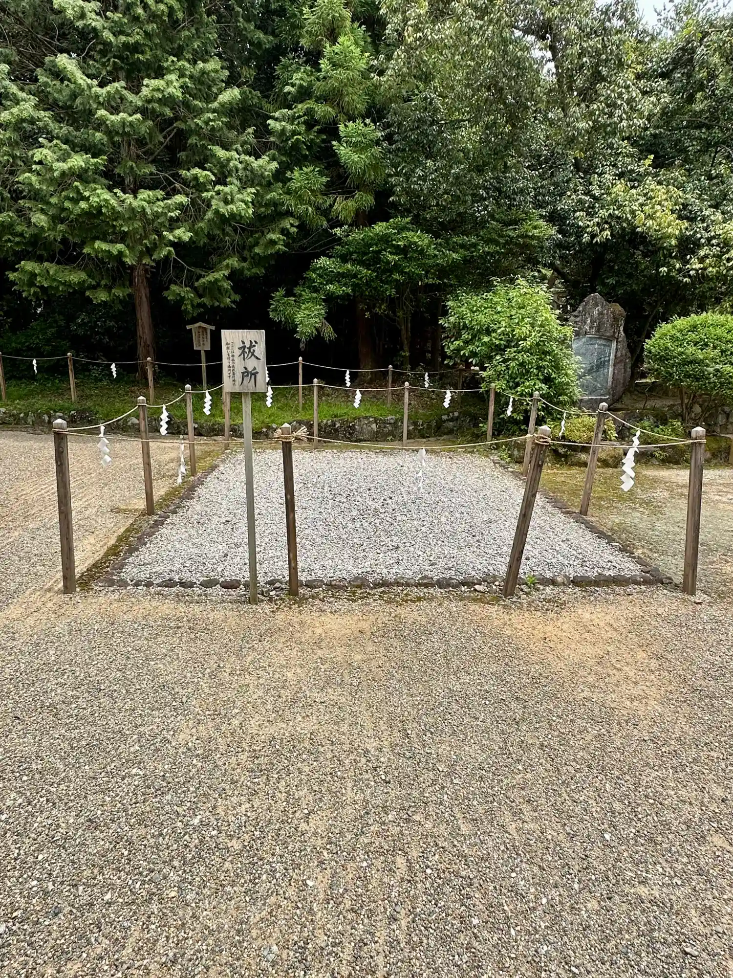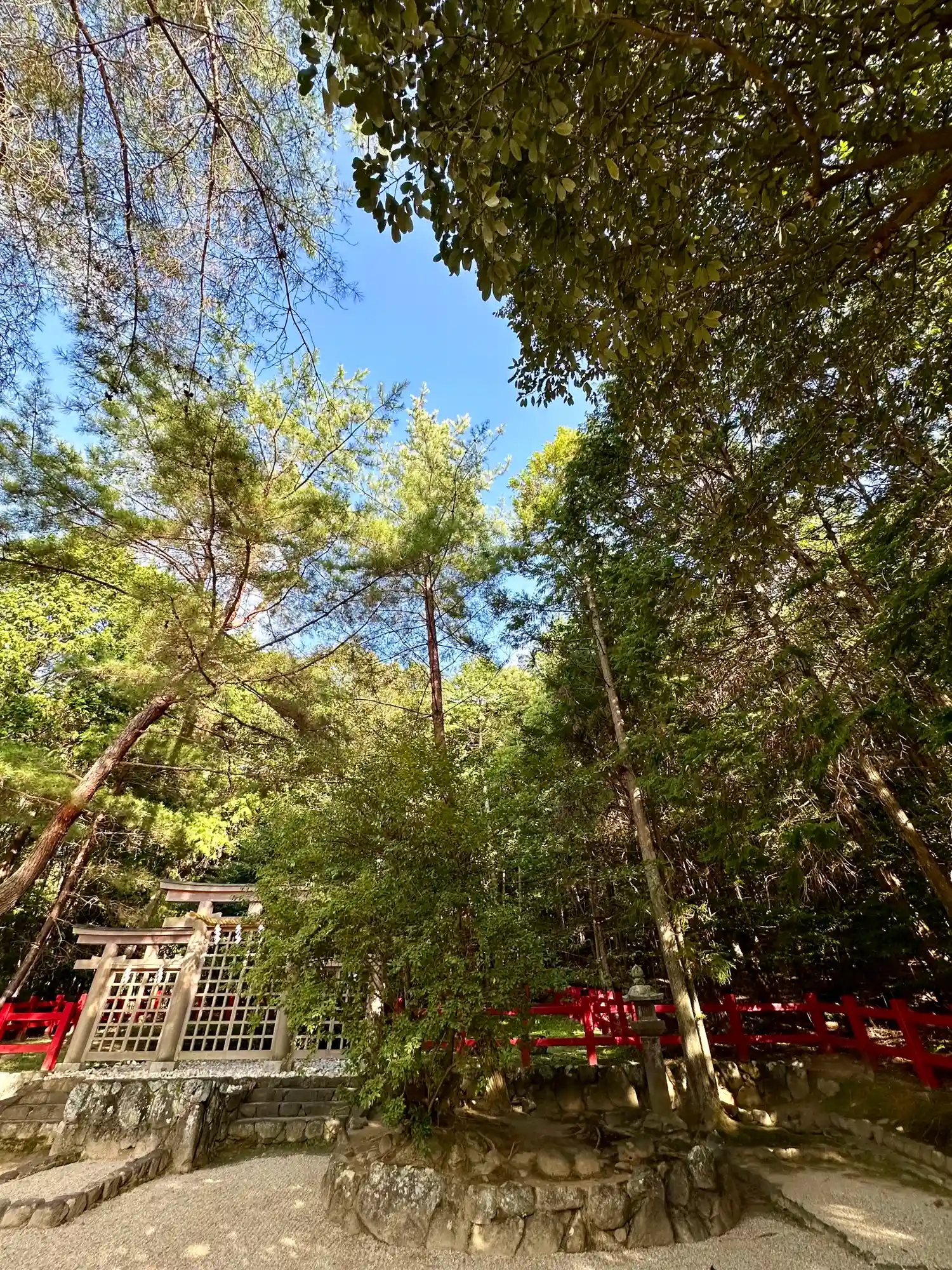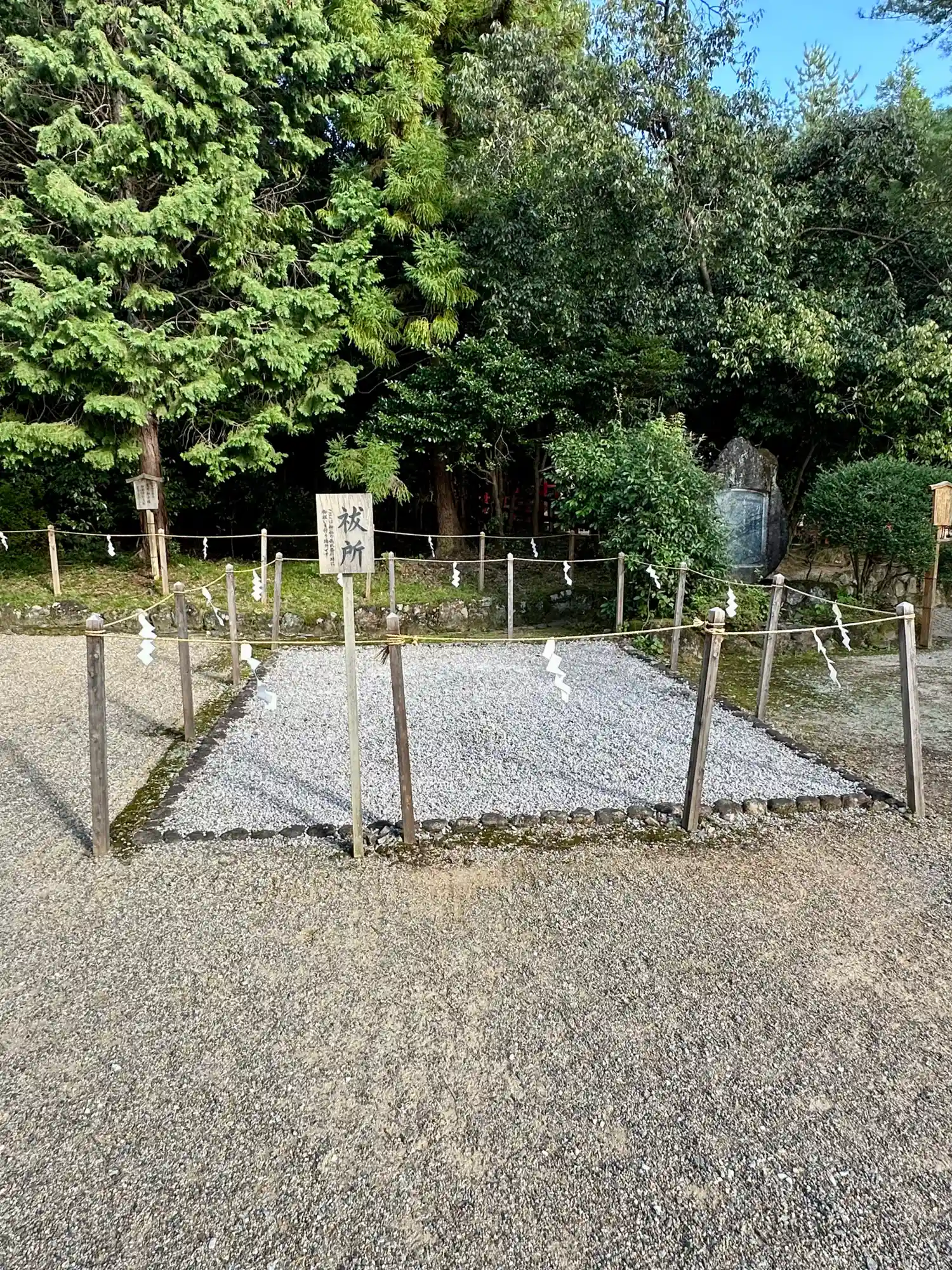 大神神社と同じく社殿はなく遥拝所として三輪鳥居が置かれており、その後ろには神籬となっている樹木が植ってるだけの庭上祭祀の一番原始的な形をとっています。