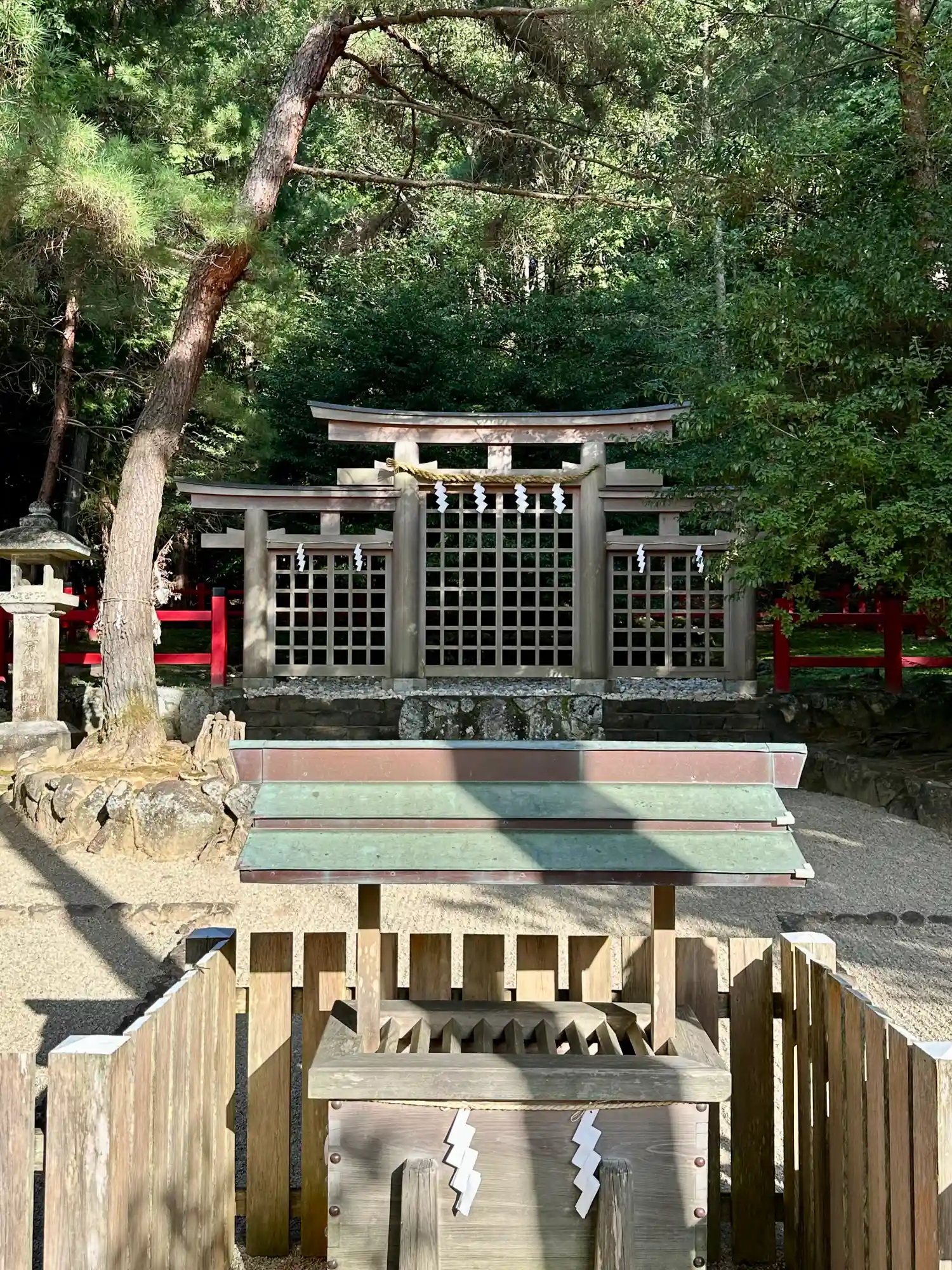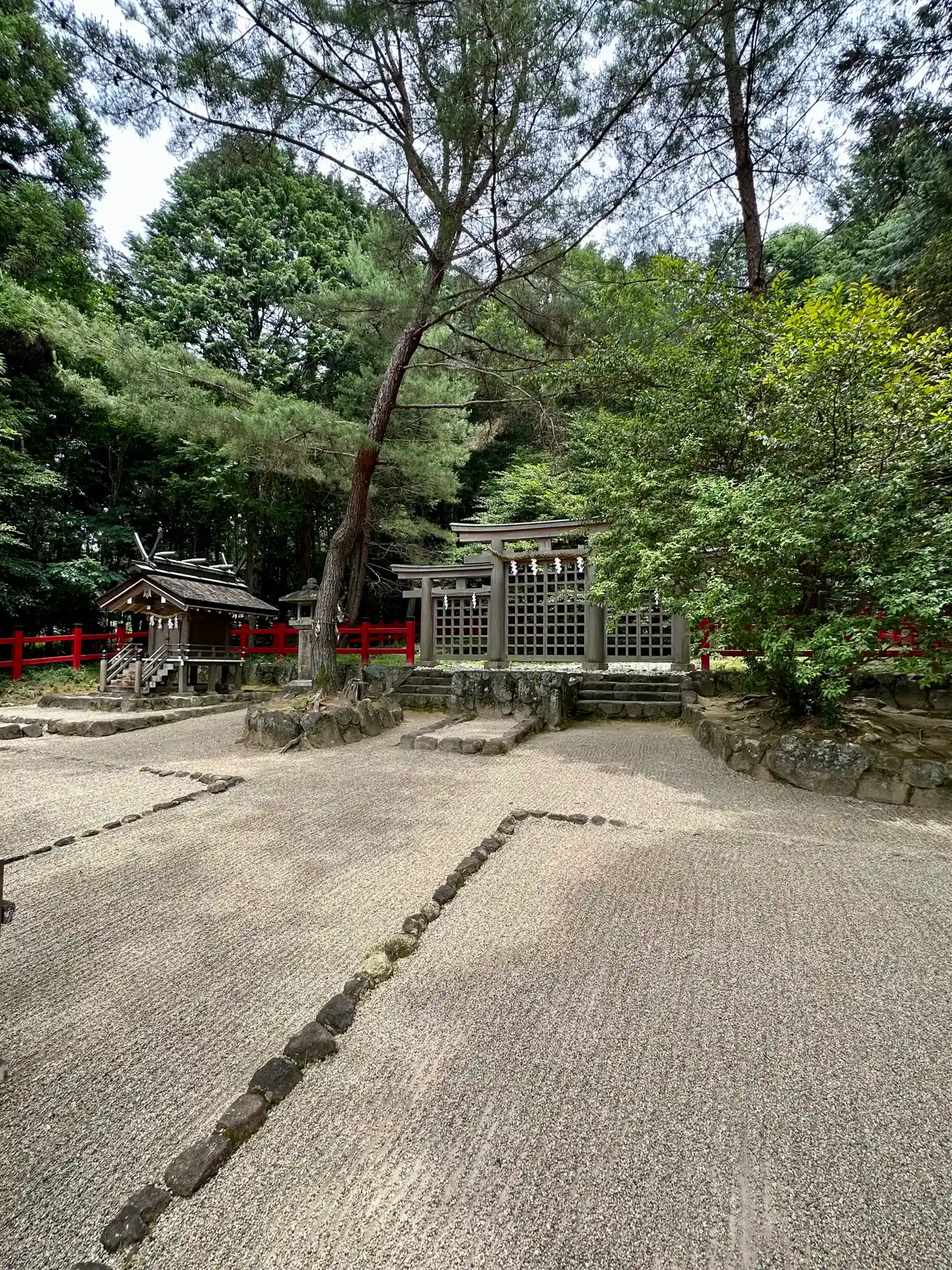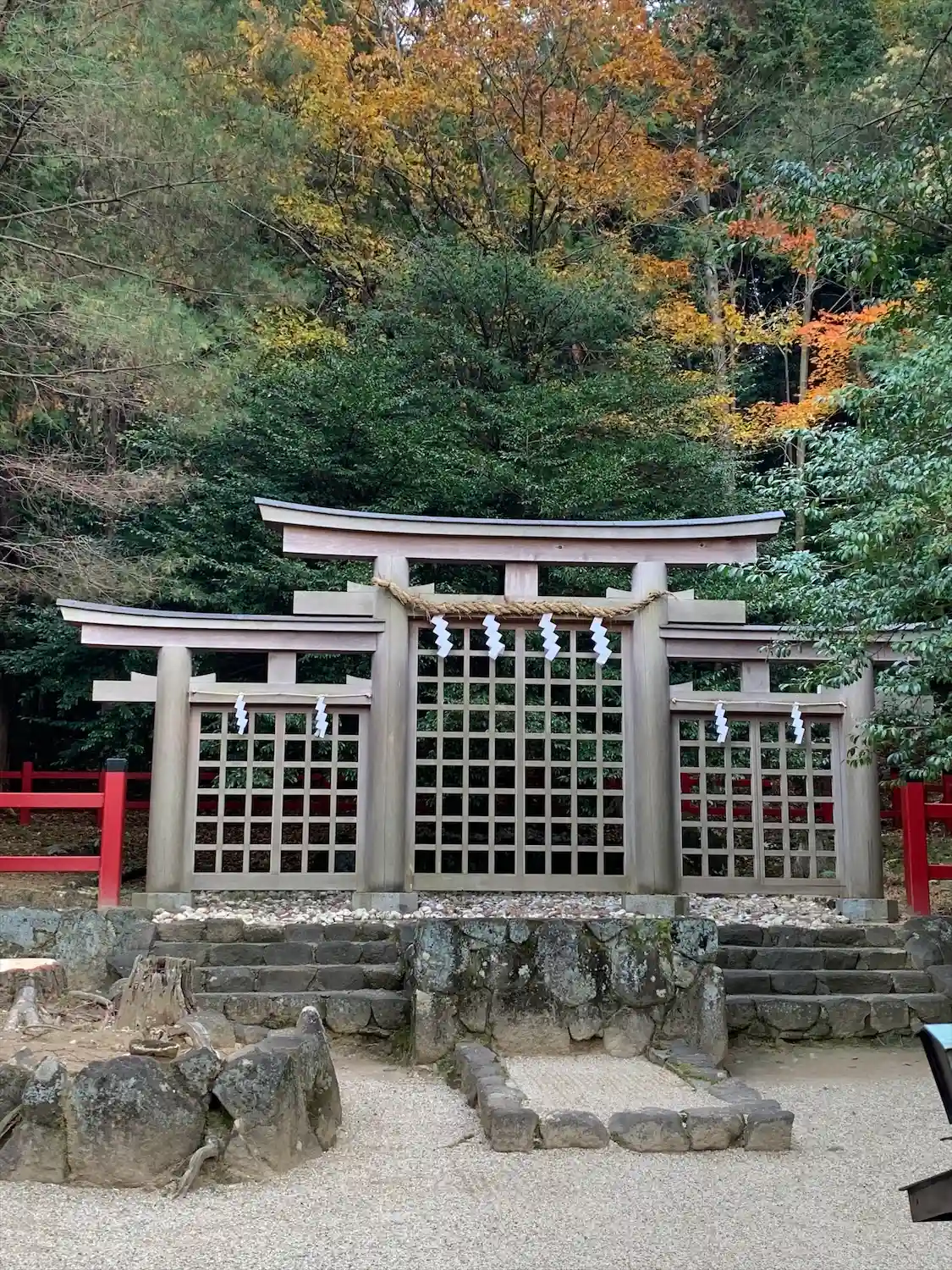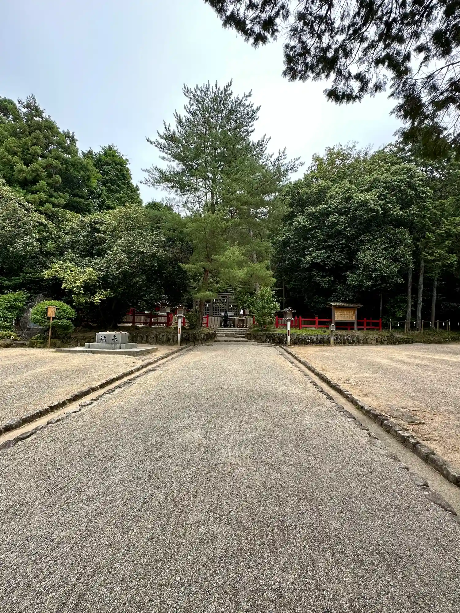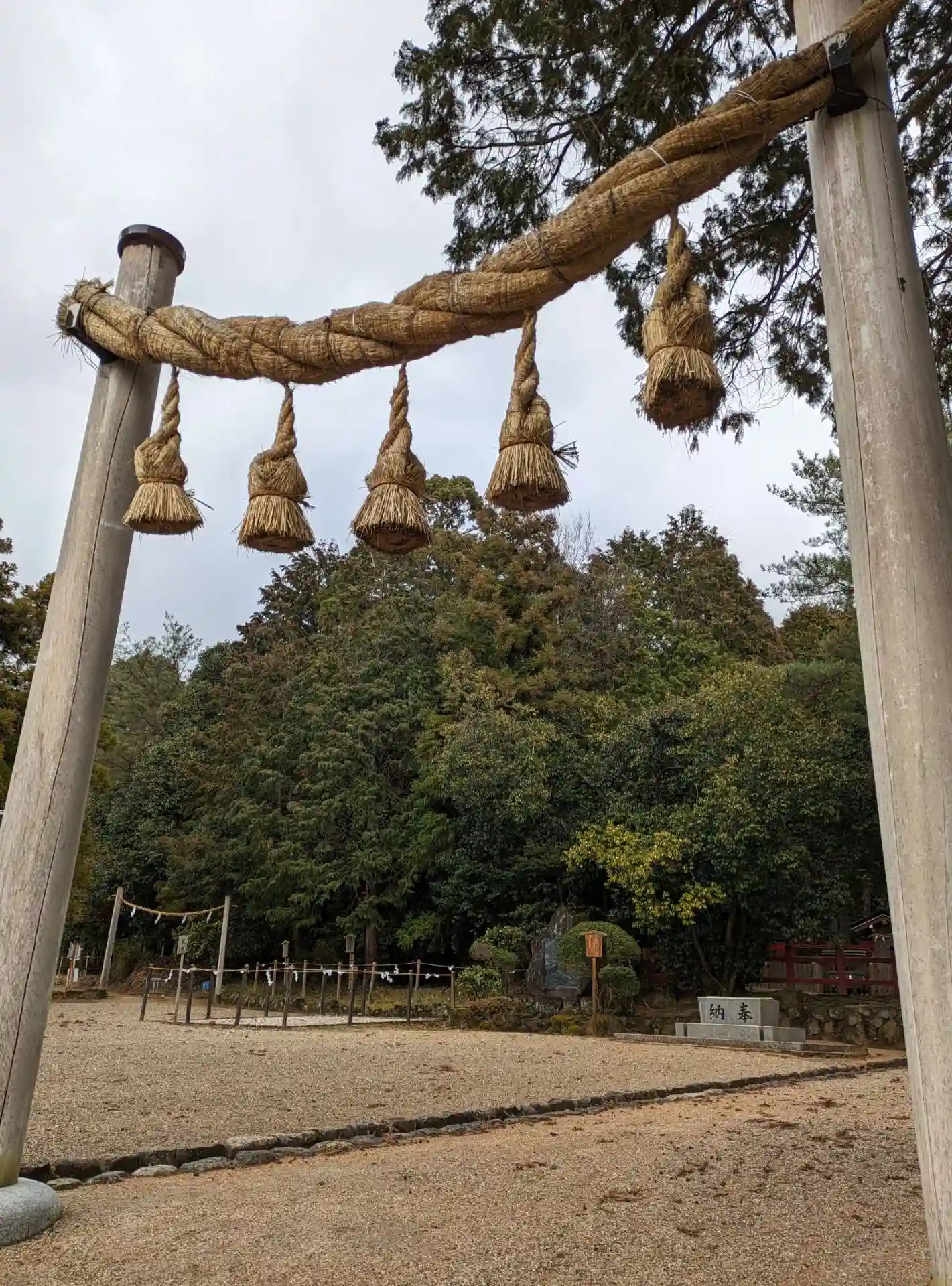 大神神社と同じく社殿はなく遥拝所として三輪鳥居が置かれており、その後ろには神籬となっている樹木が植ってるだけの庭上祭祀の一番原始的な形をとっています。