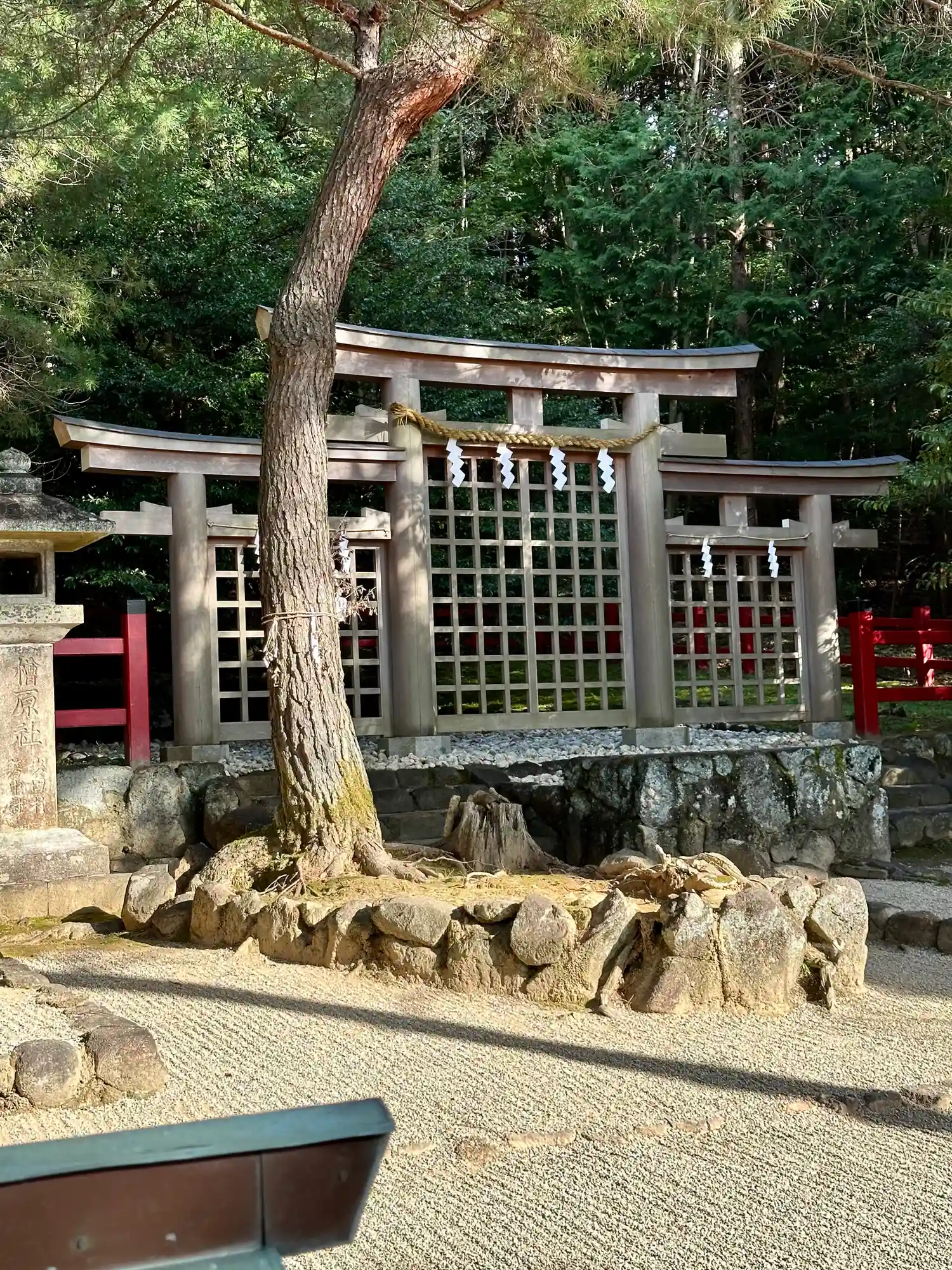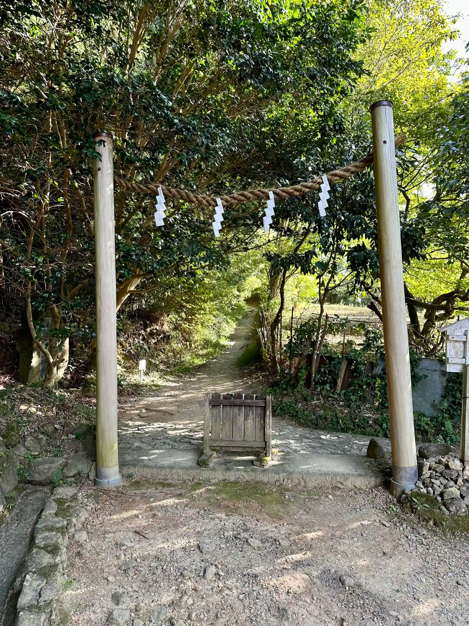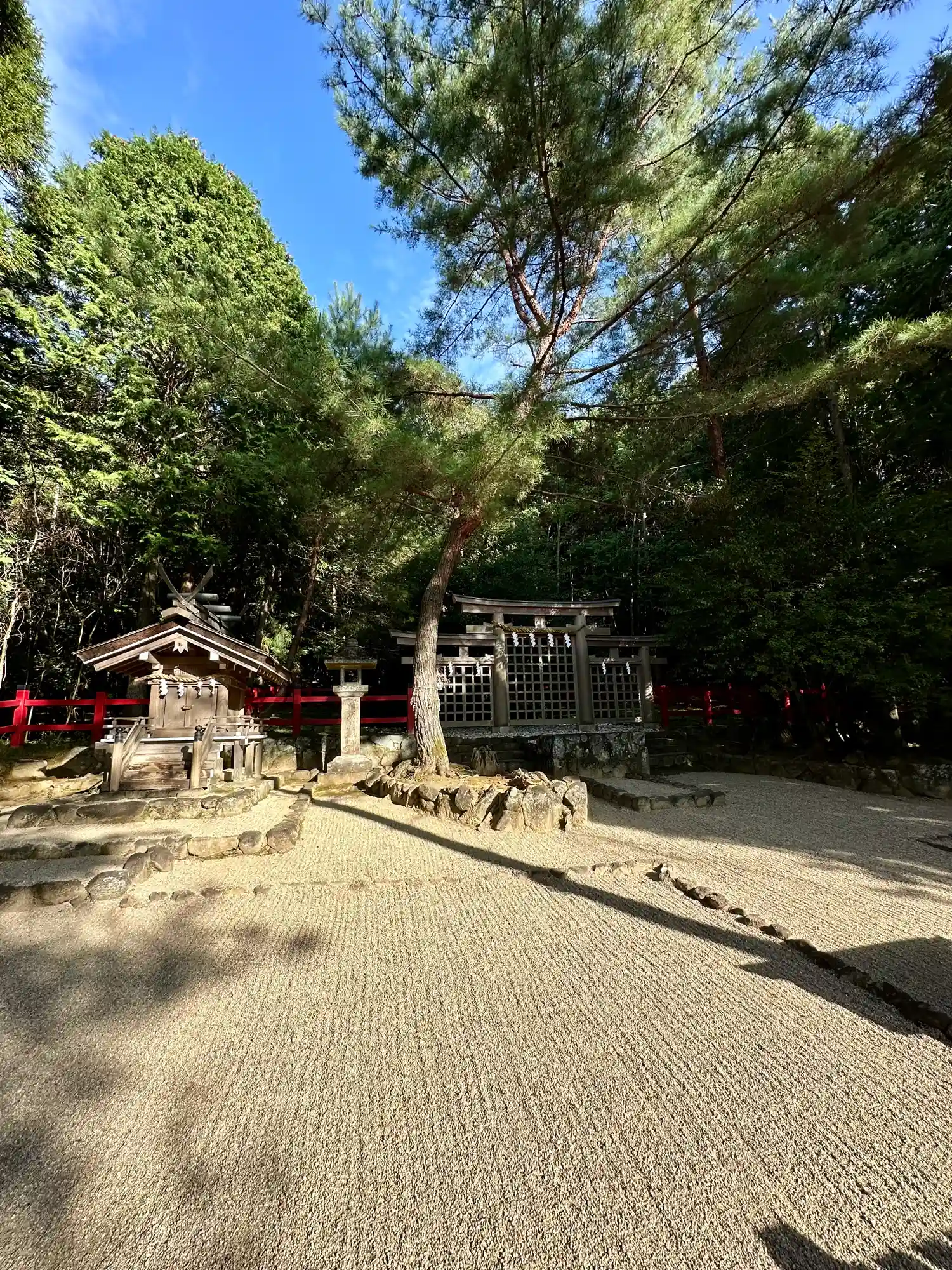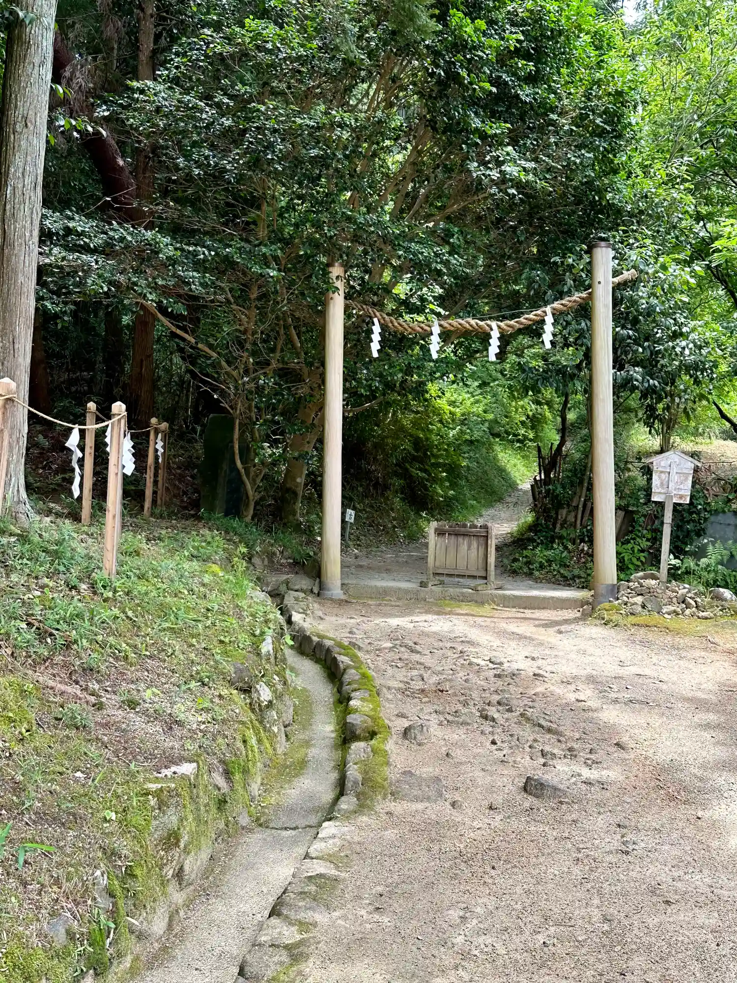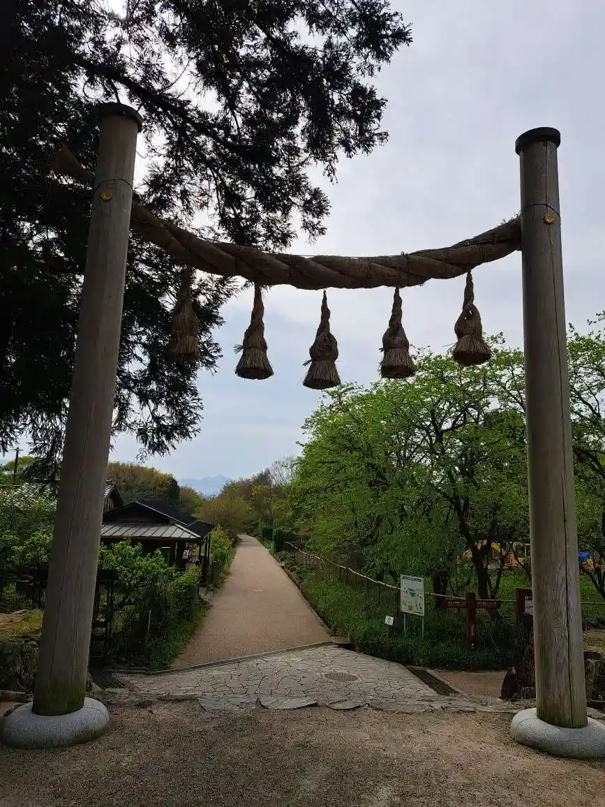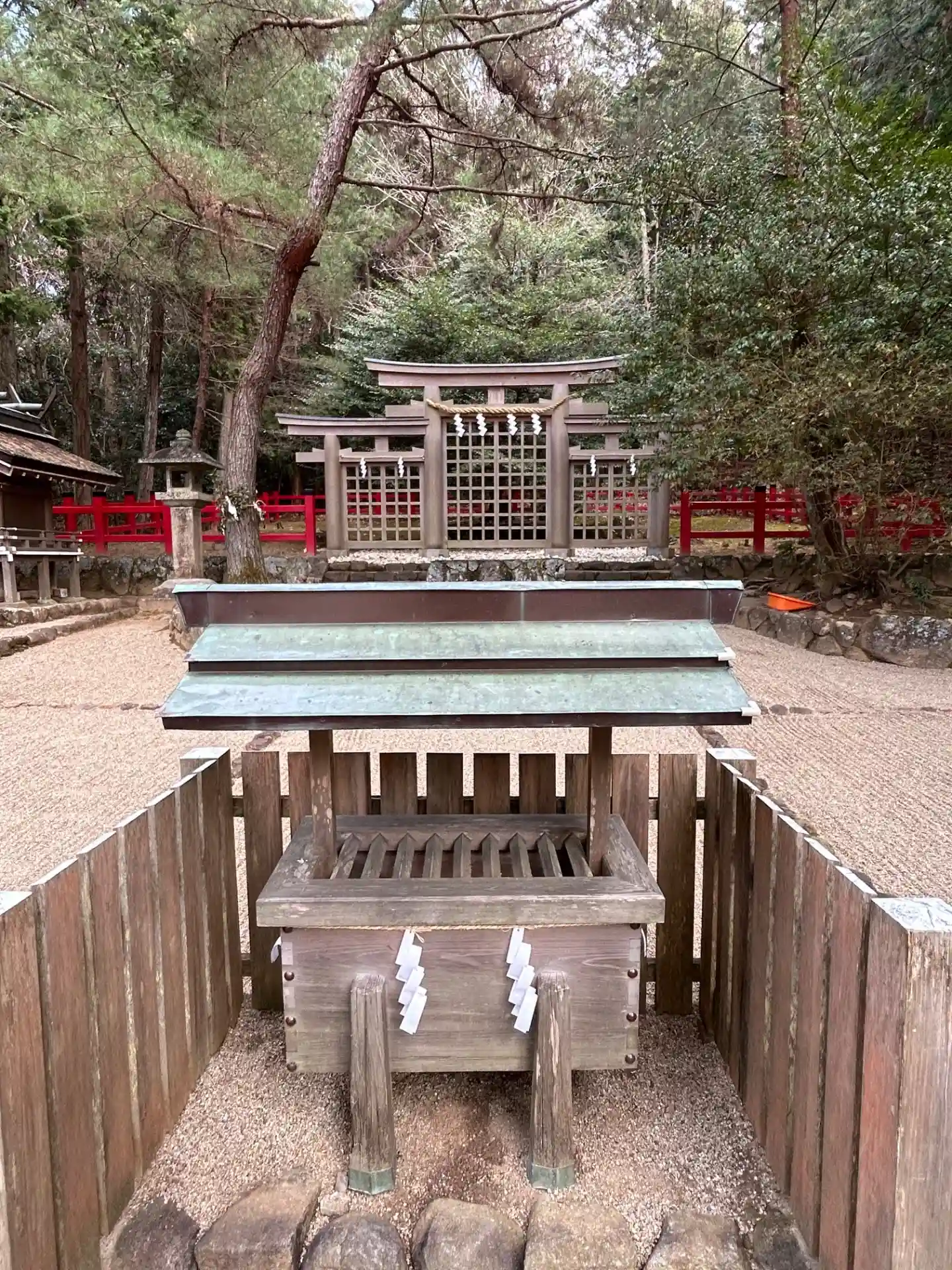大神神社と同じく社殿はなく遥拝所として三輪鳥居が置かれており、その後ろには神籬となっている樹木が植ってるだけの庭上祭祀の一番原始的な形をとっています。
