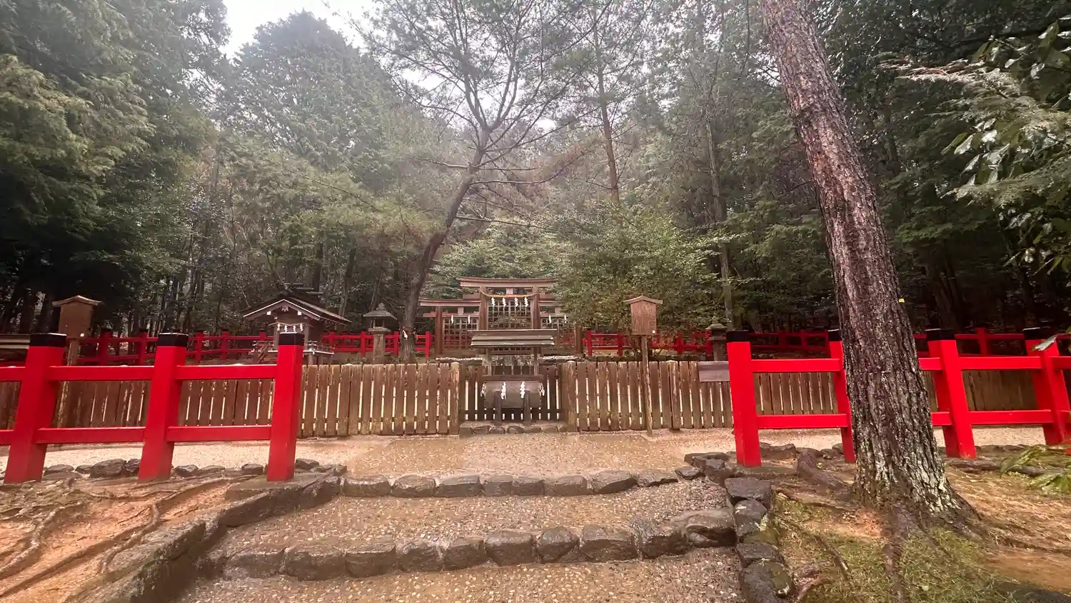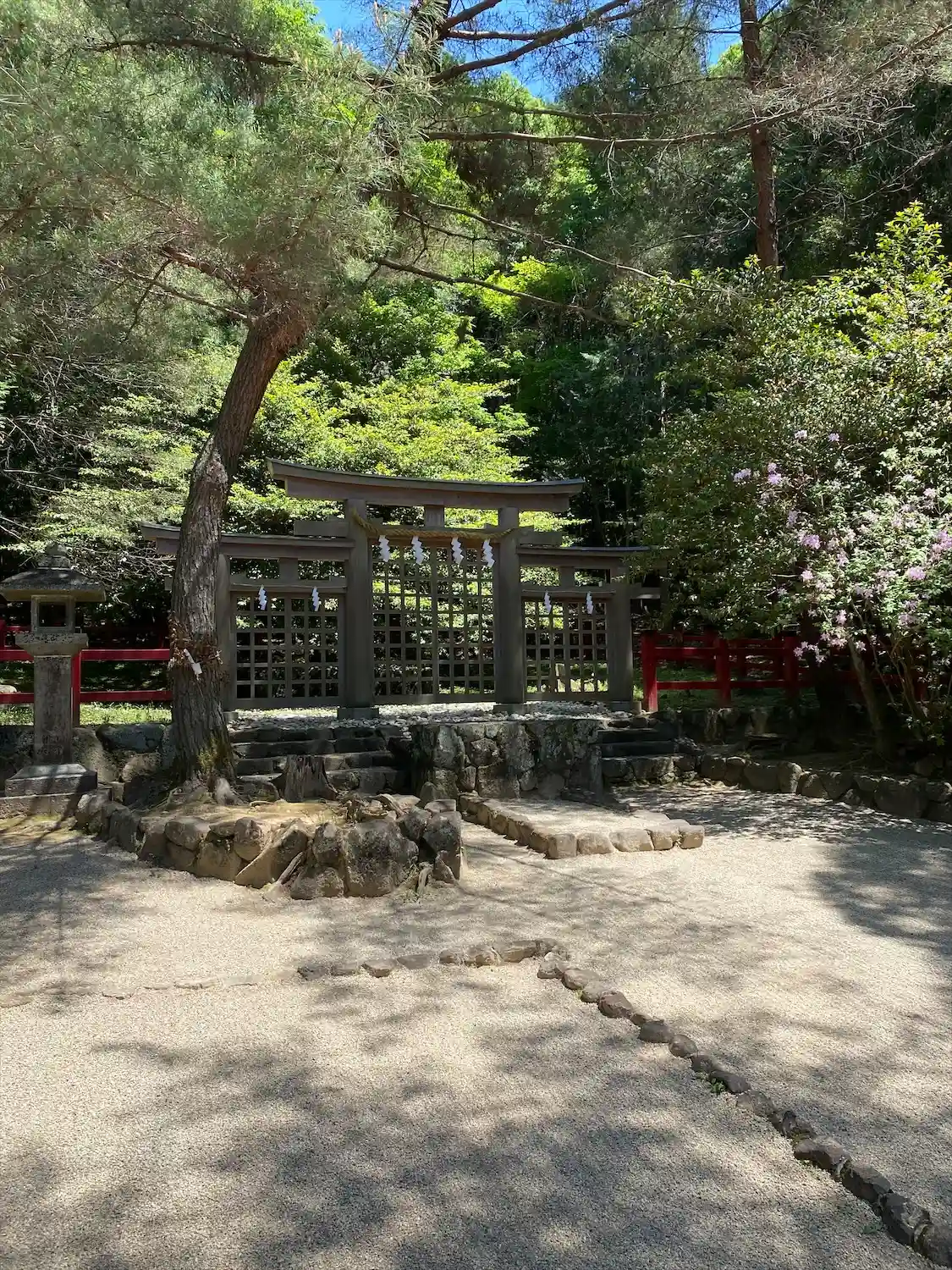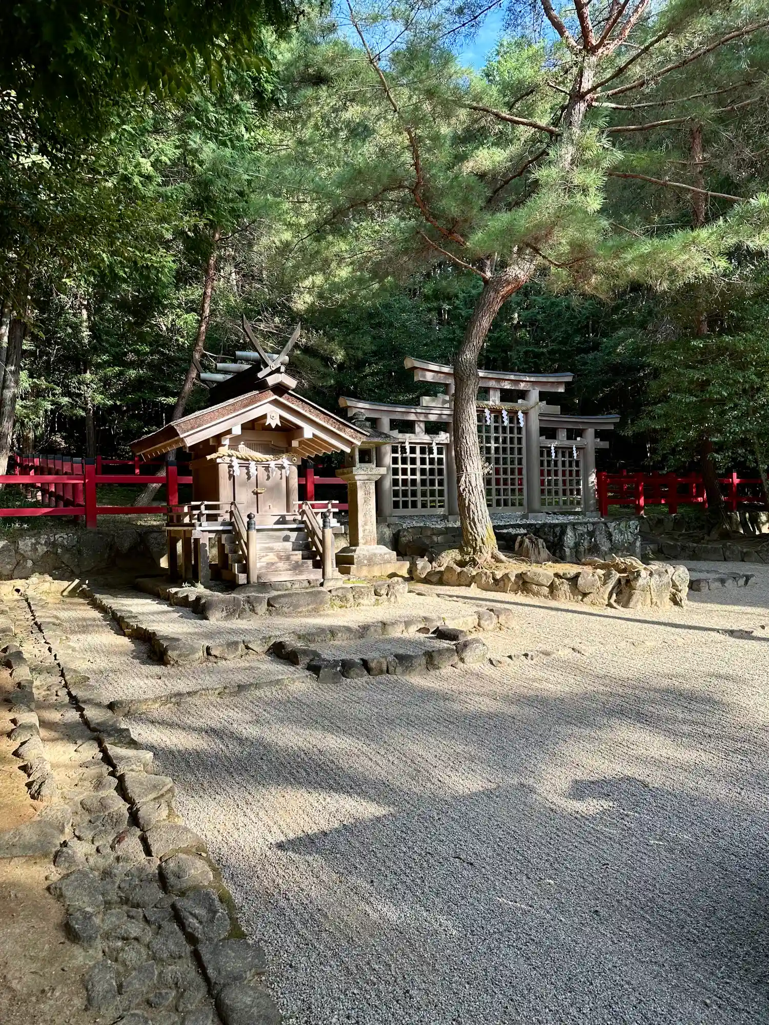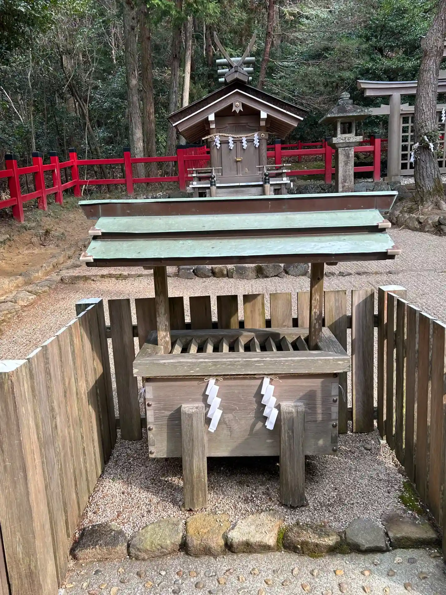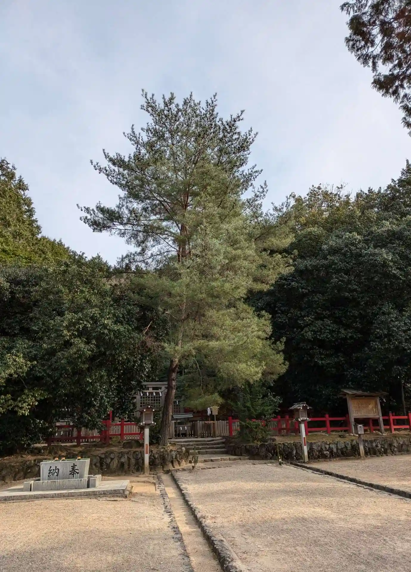 大神神社と同じく社殿はなく遥拝所として三輪鳥居が置かれており、その後ろには神籬となっている樹木が植ってるだけの庭上祭祀の一番原始的な形をとっています。