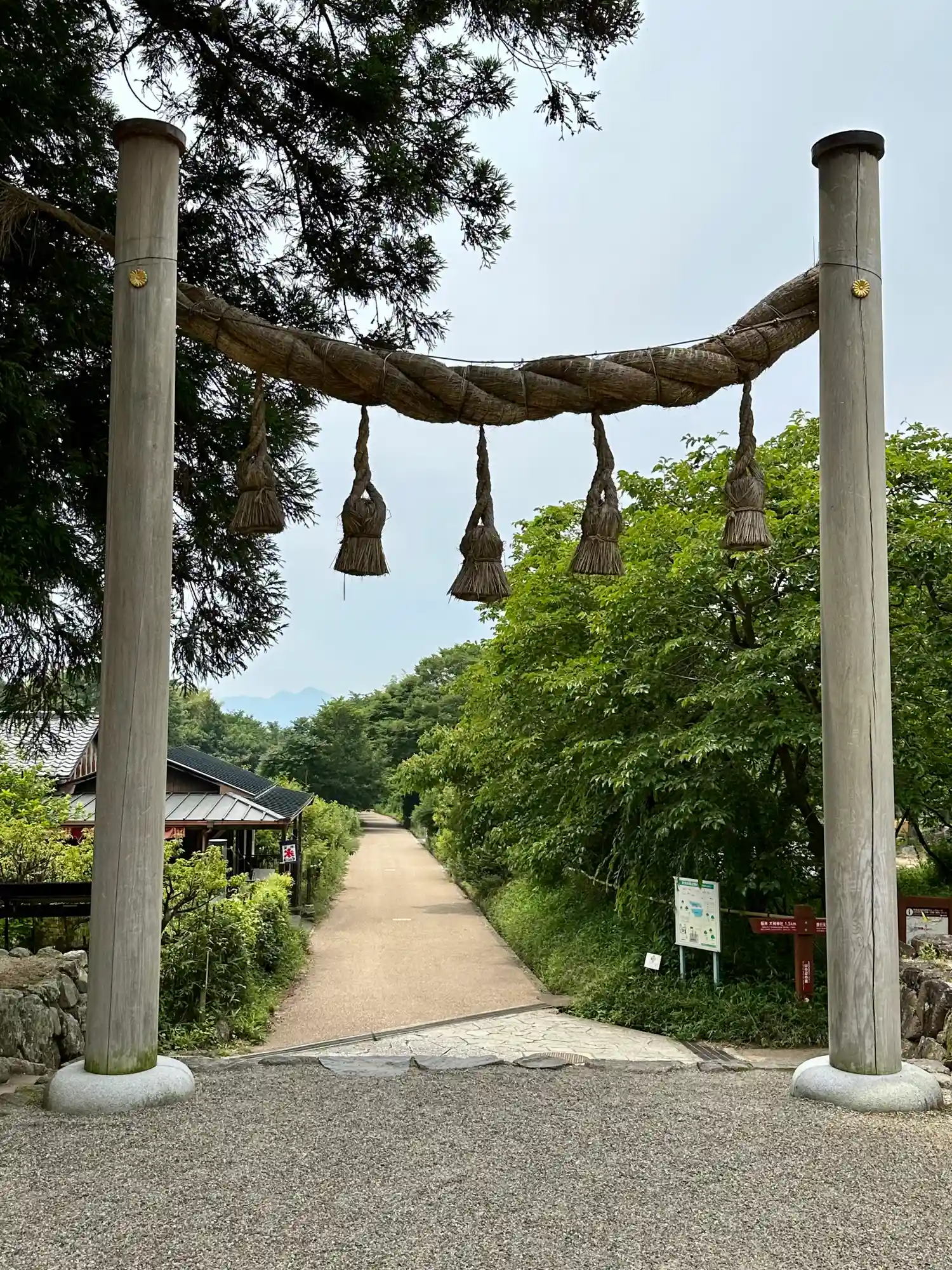 注連柱の向こうに二上山が見えます。春分・秋分の日の頃にはこの二上山に夕日が沈むそうです。