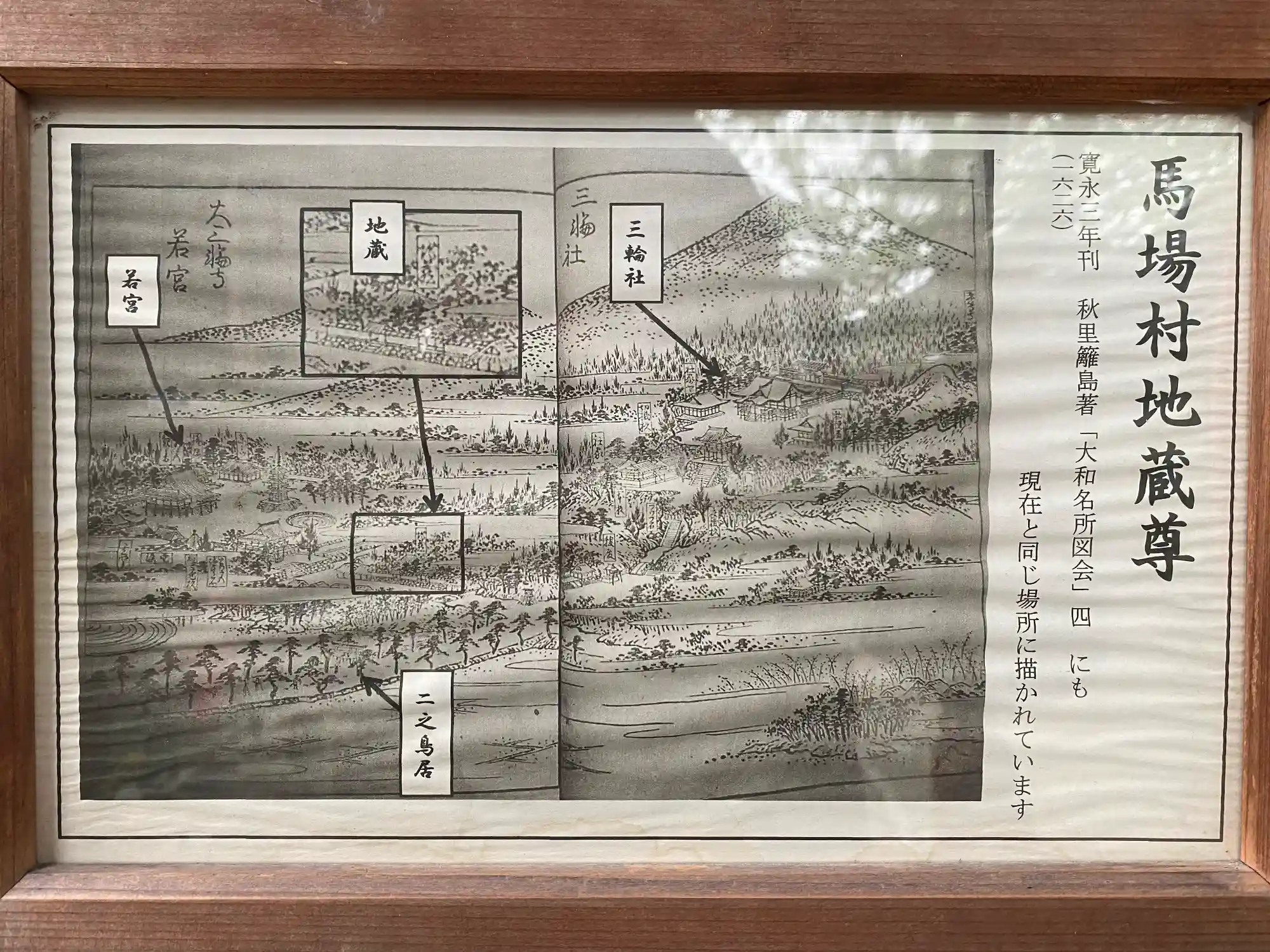 堂の表に掲げてある<大和名所図会・四>。右手に三輪明神、左手に<若宮>と<地蔵>とある。