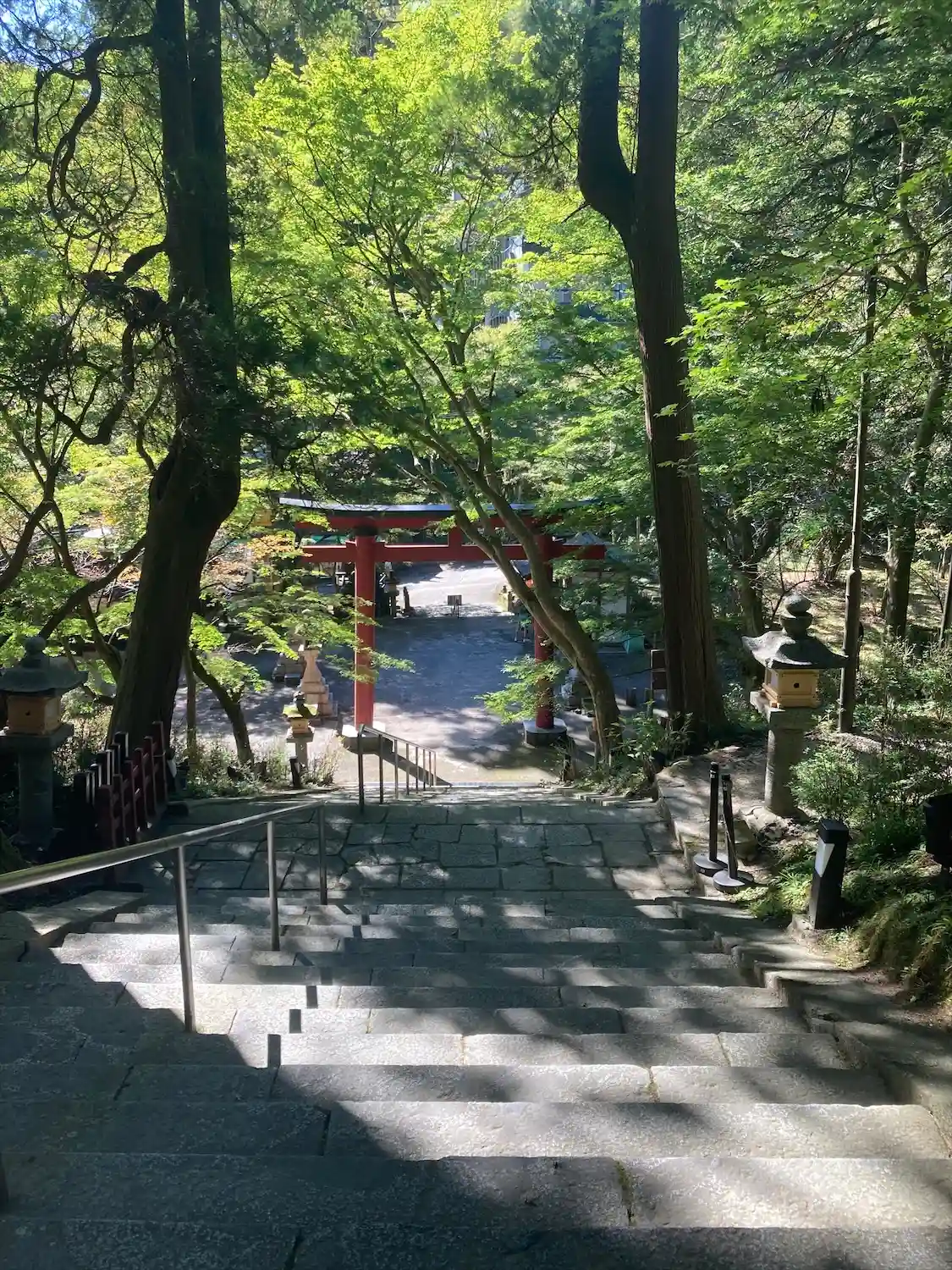 まずは鳥居から神域へ。朱と緑が鮮やか。