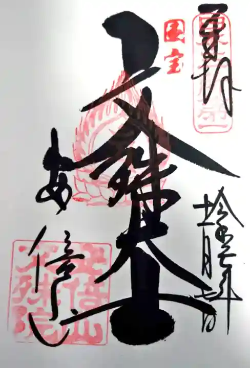 真ん中に文殊大士と書かれ、右上に日本三所第一の印、その左に国宝の印、真ん中に蓮華座に梵字(文殊菩薩)の火焔宝珠印、左下に安倍山の文字、安倍山文殊院の印が押されています。