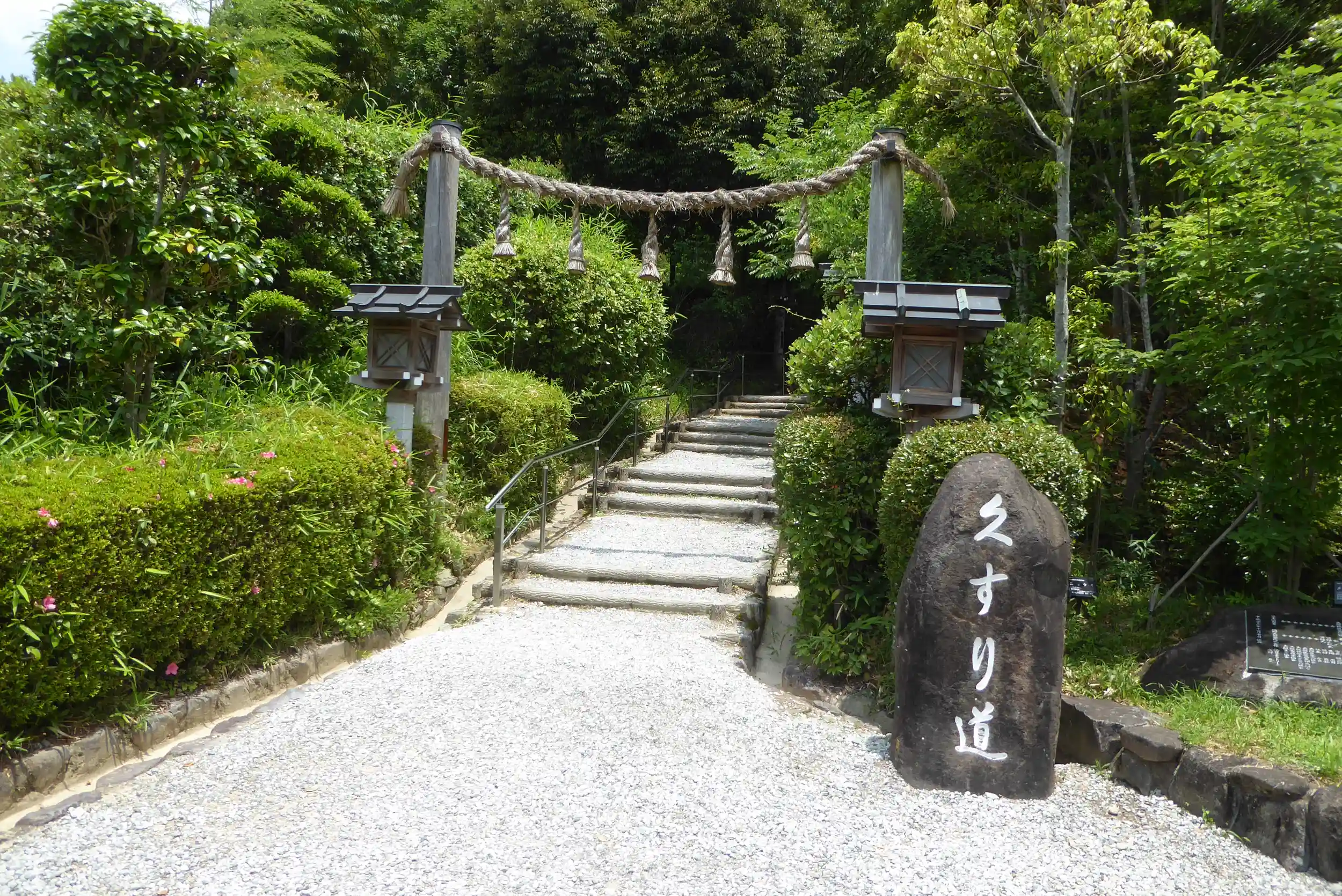 病気平癒の御利益で知られる狭井神社へと続き、製薬会社が奉納した燈籠が立ち並んでいる。歩道には多くの植物が育ちます。