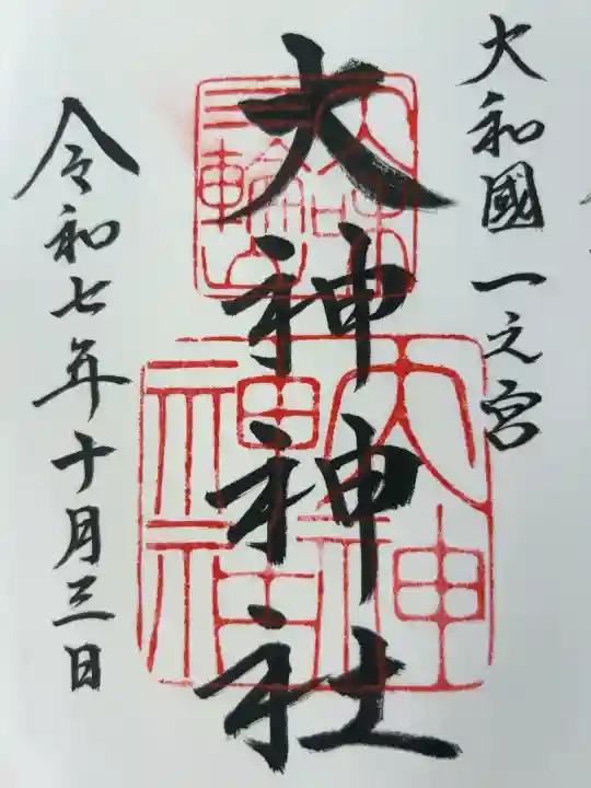 御朱印を書いてくださる方が御朱印帳の隣に書いてある村屋坐弥冨都比売神社の御朱印を見てその達筆に驚かれていました。この御朱印の隣に書くのは緊張すると言われていましたが、書いて頂いた大神神社の御朱印もとても綺麗で素晴らしかったです。ありがとうございました。