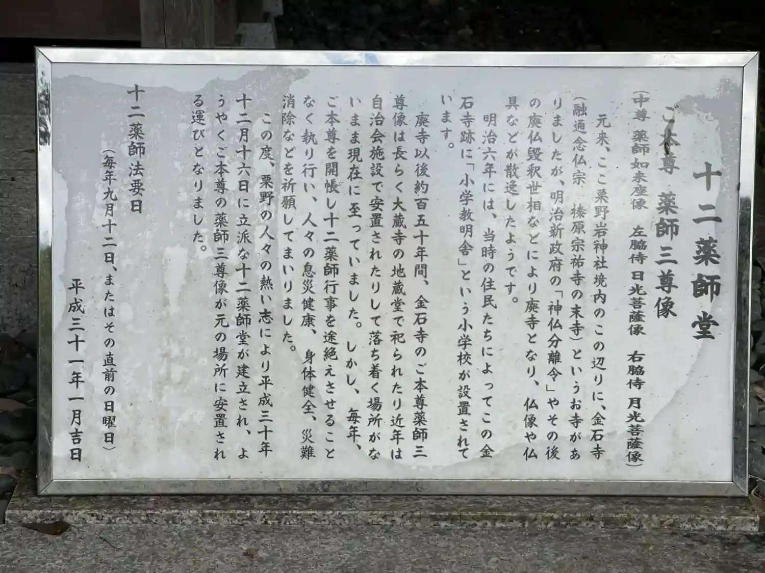 廃寺以後約150年間、金石寺のご本尊薬師三尊像は長らく大蔵寺の地蔵堂で祀られたり、自治会施設で安置されたりして現在に至っていました。しかし、毎年、ご本尊を開帳し十二薬師行事を途絶えさせることなく執り行い、人々の息災健康、身体健全、災難消除などを祈願してきました。