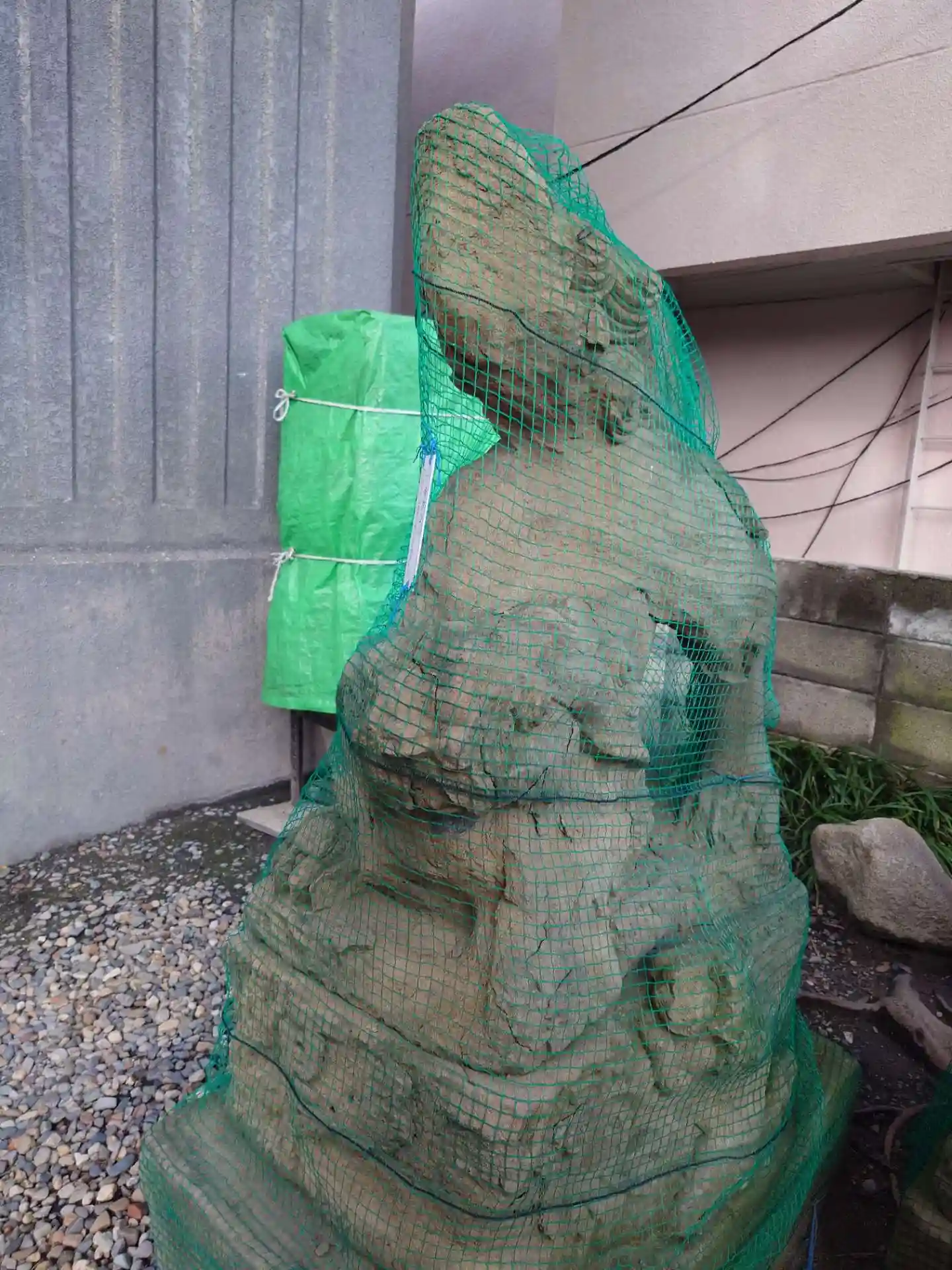 左右の狛犬さんが、緑のネットで縛り上げられています。