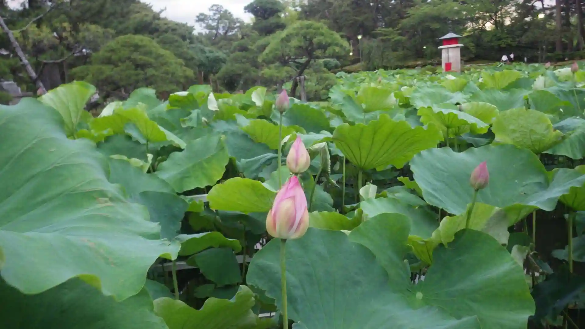 「蓮池」と「ラジオ塔」です。もう少しで蓮の花が咲きそうです。