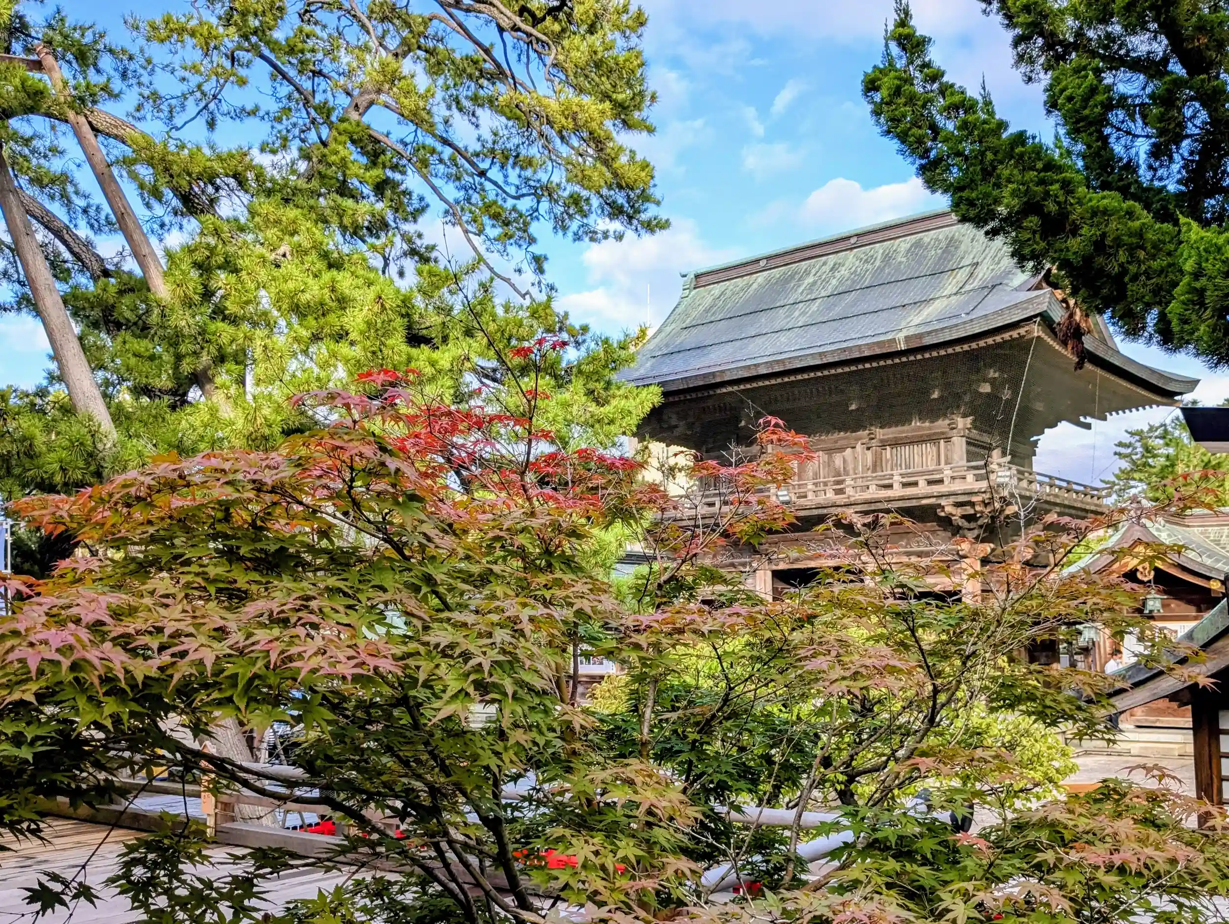 社殿脇、モミジ越しの随神門