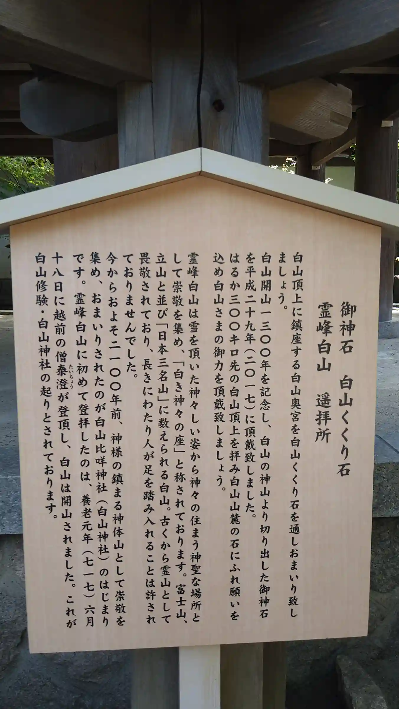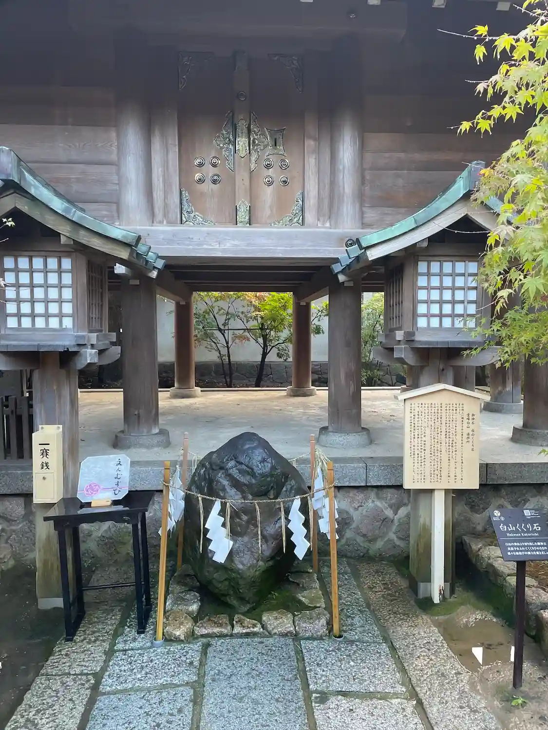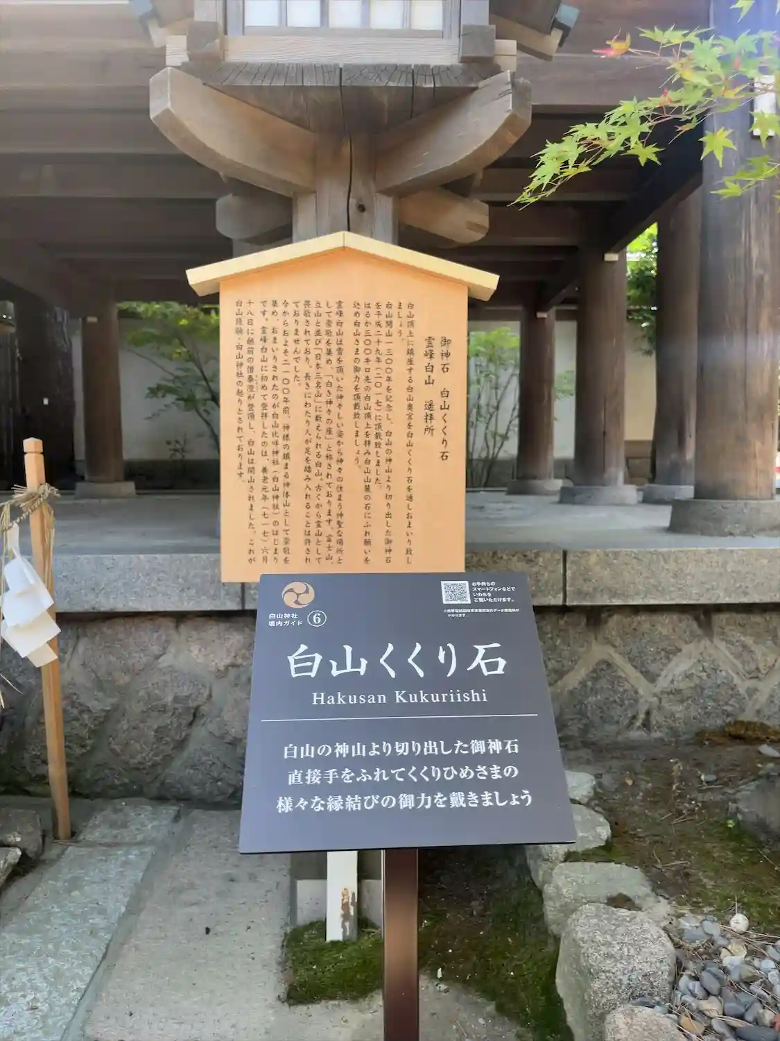 【白山くくり石】 「白山開山1300年を記念し、白山の神山より切り出した御神石」、「白山山麓の石に触れ願いを込め白山さまの御力を頂戴いたしましょう」と説明板に書いてありました。僕も菊理媛神の御神石に触れて白山を思いました。
