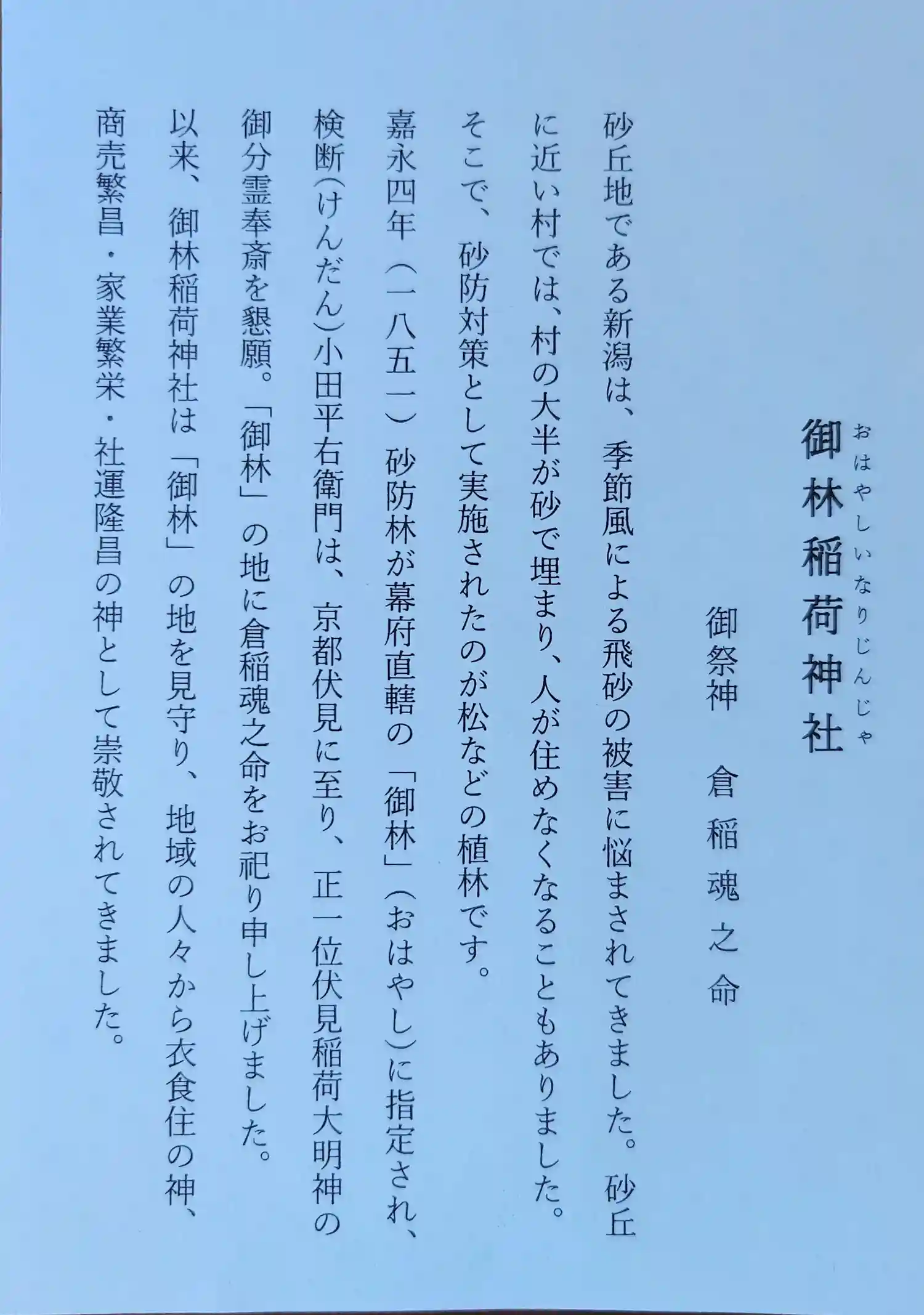 御林稲荷神社の由緒書