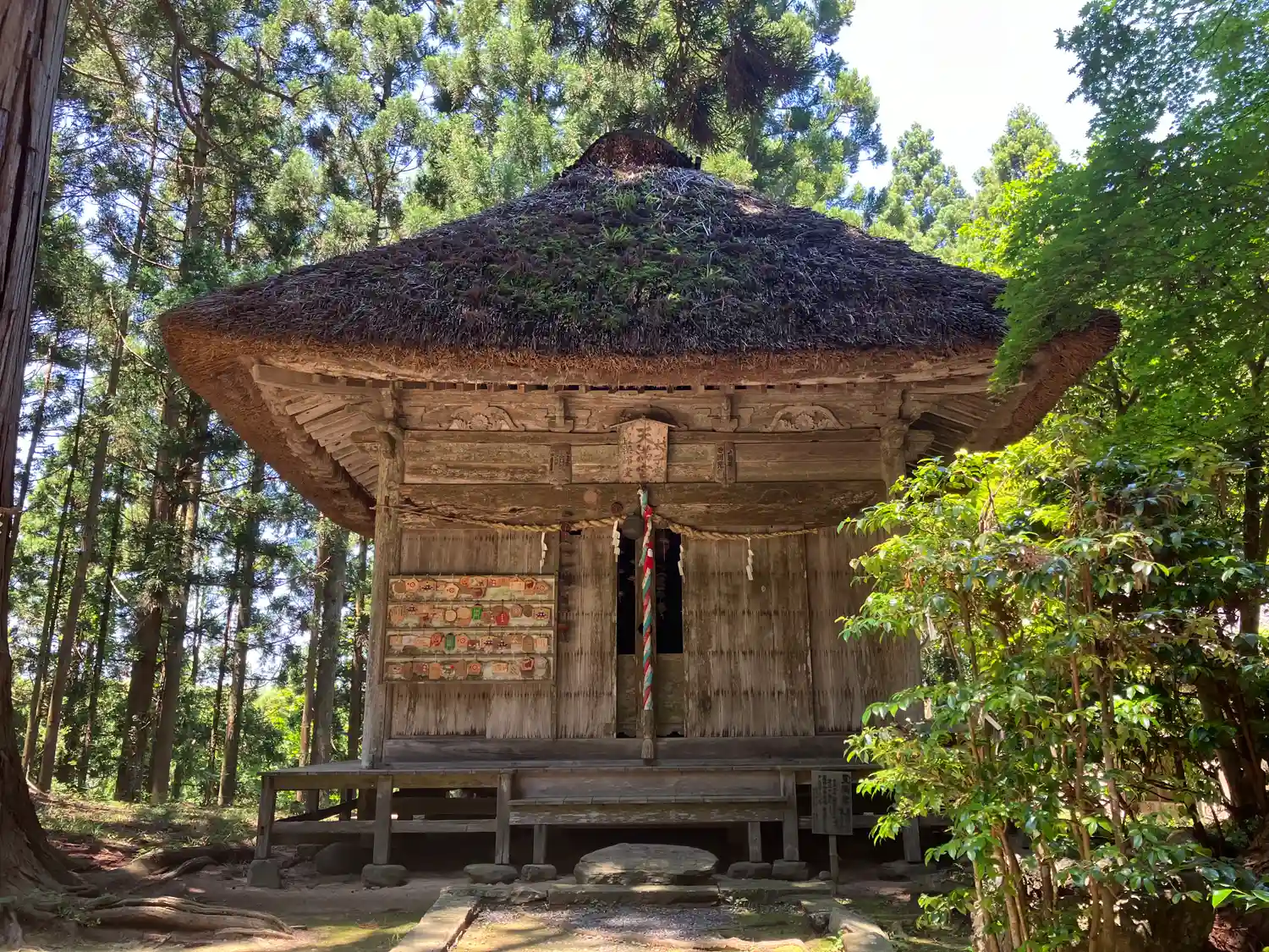 山の中にある神社で所蔵の能面と境内に建てられた能舞台は県指定文化財に…