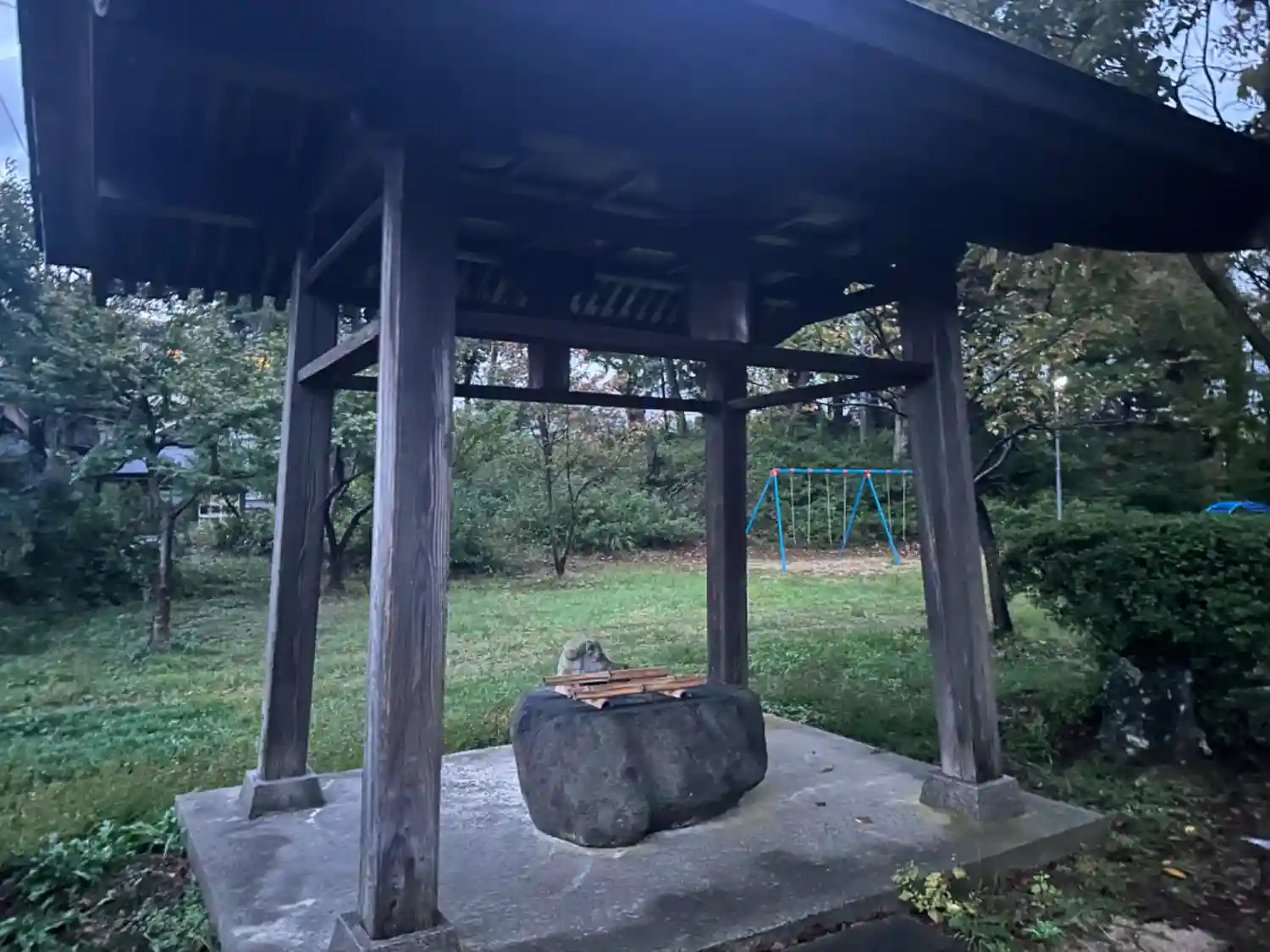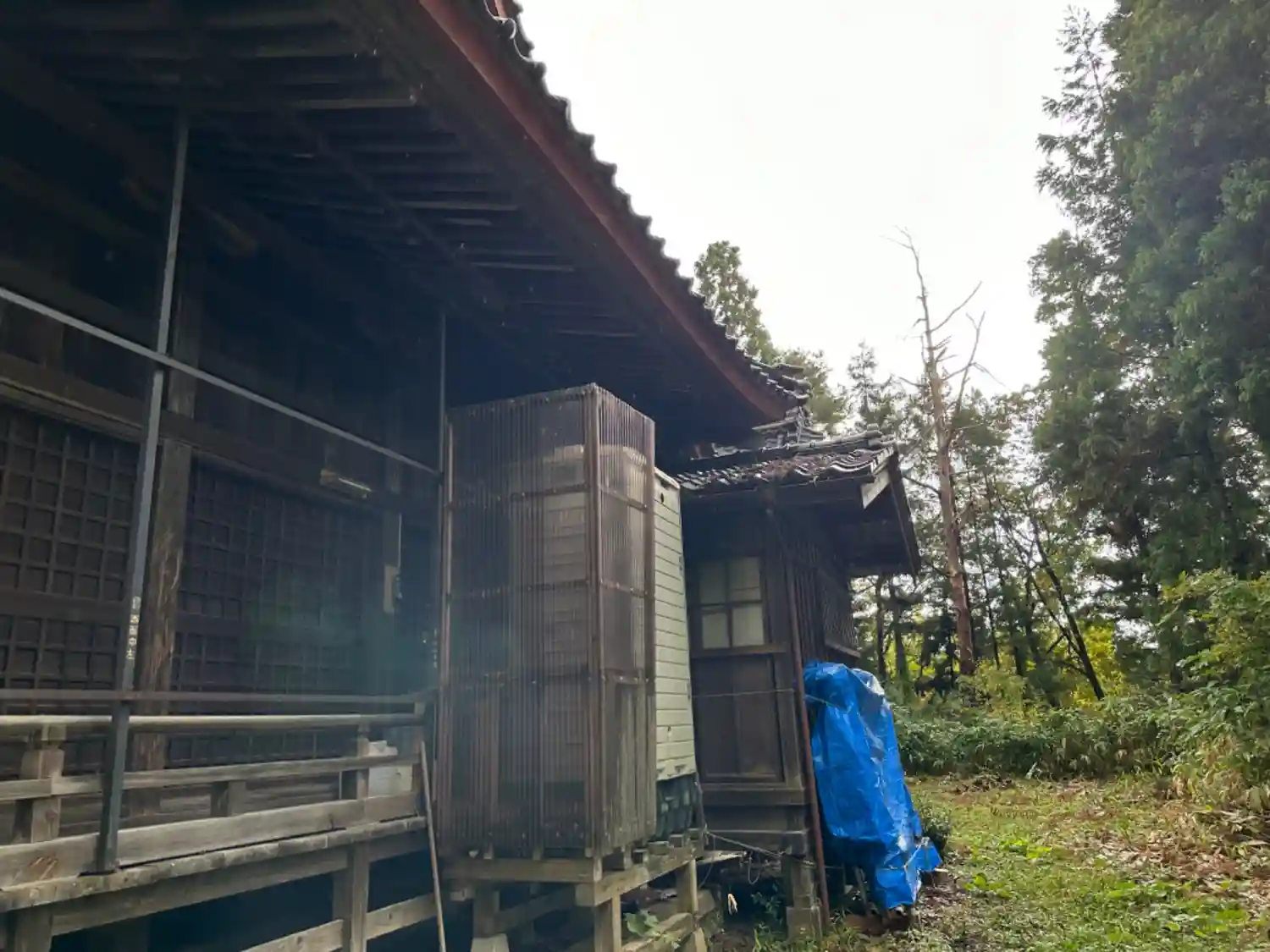 正面手前が新しい屋根と鉄骨の骨組みで囲まれています。新しく建てたっぽいですね。