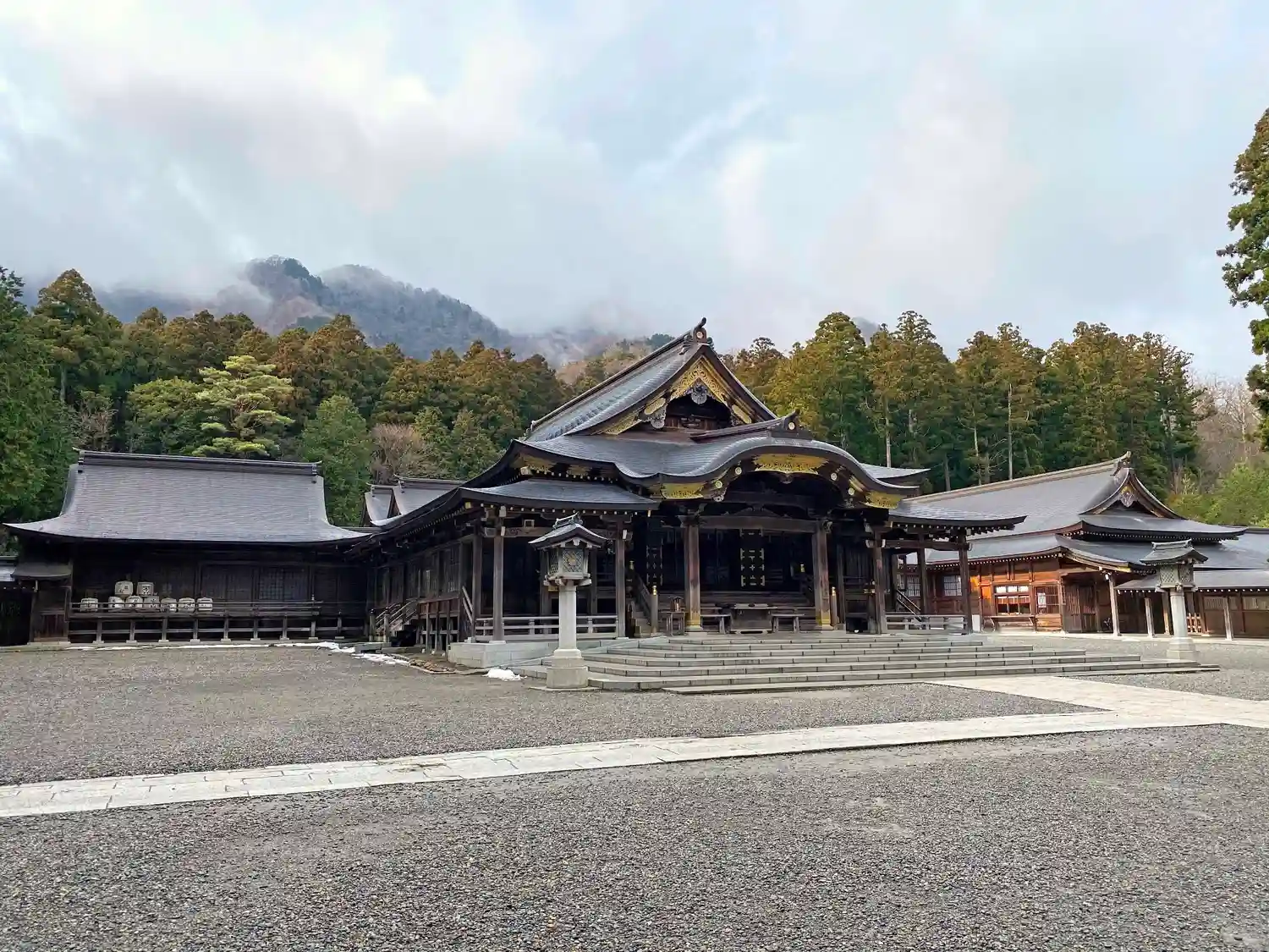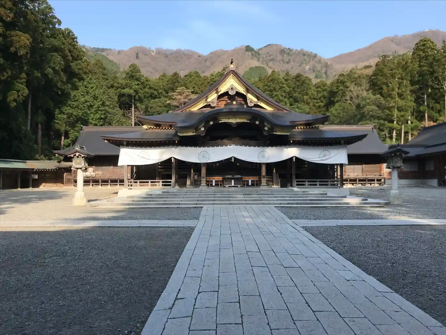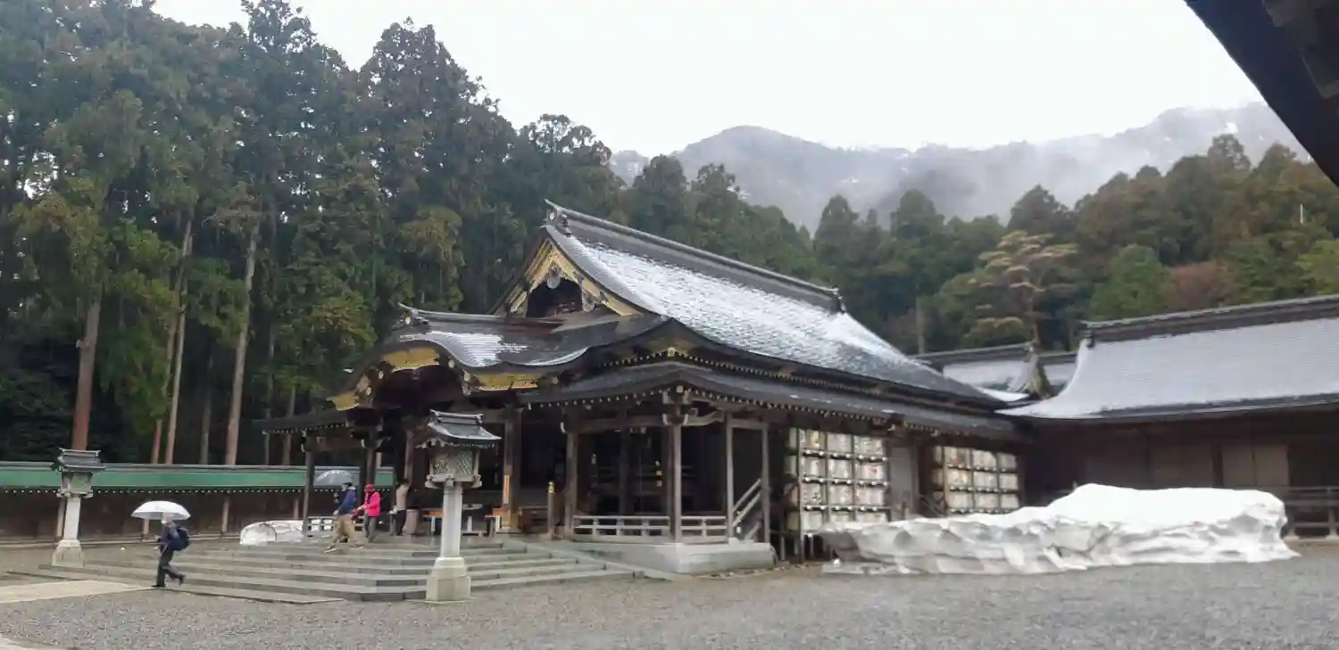 授与所から見た社殿。大きな拝殿が両側に翼を広げたような外観。