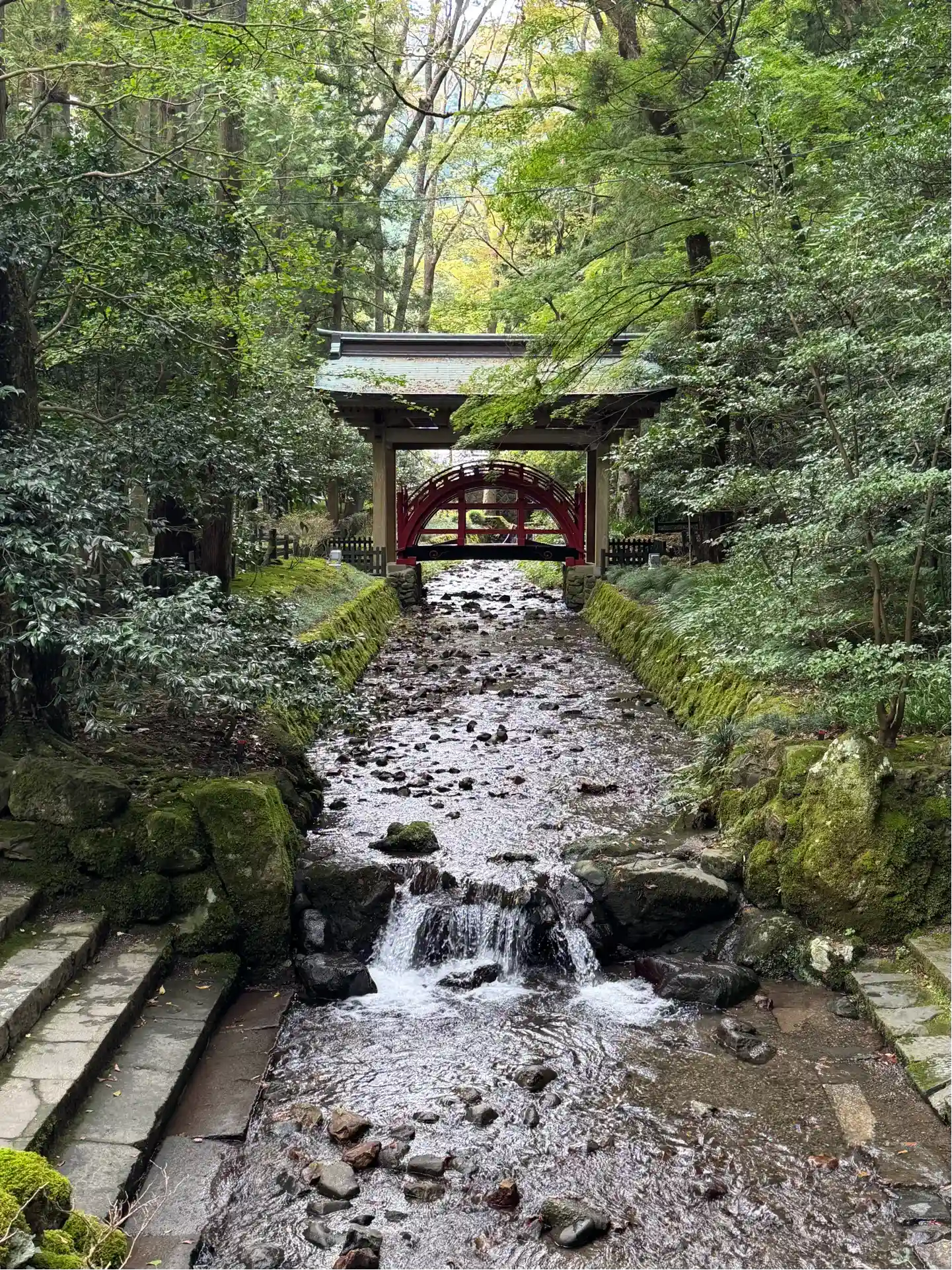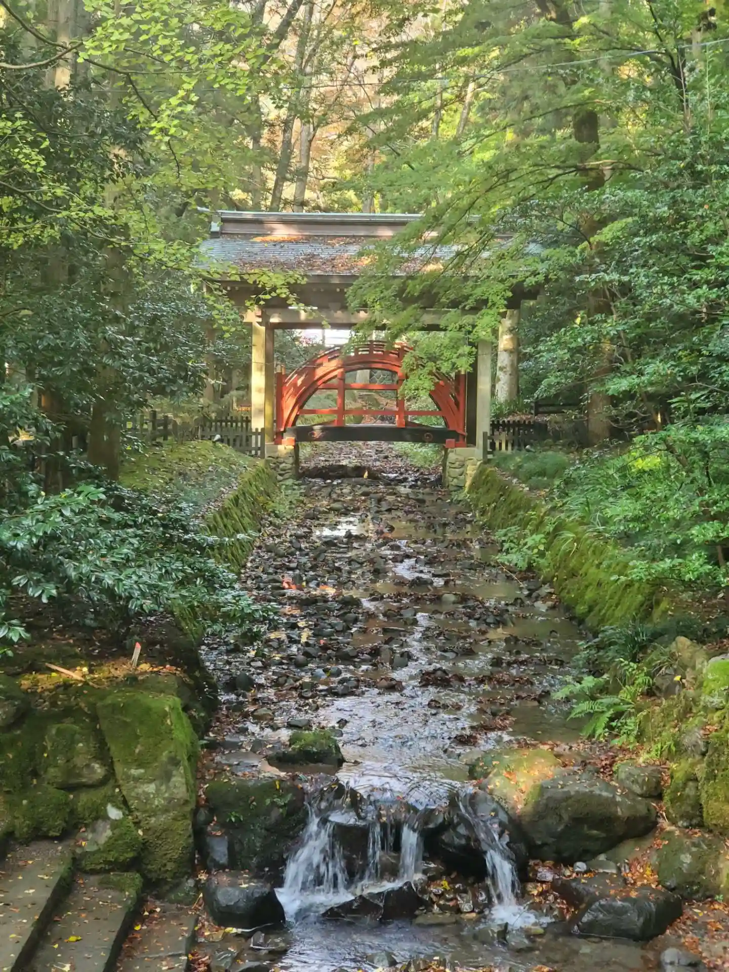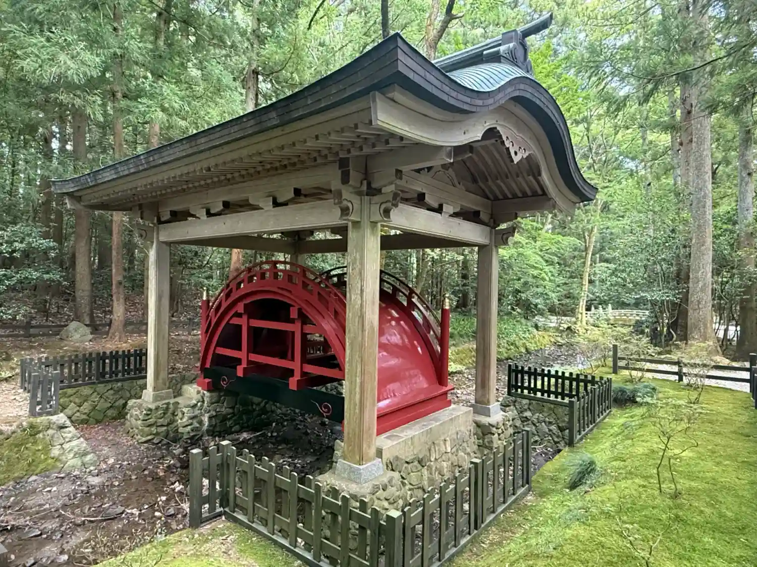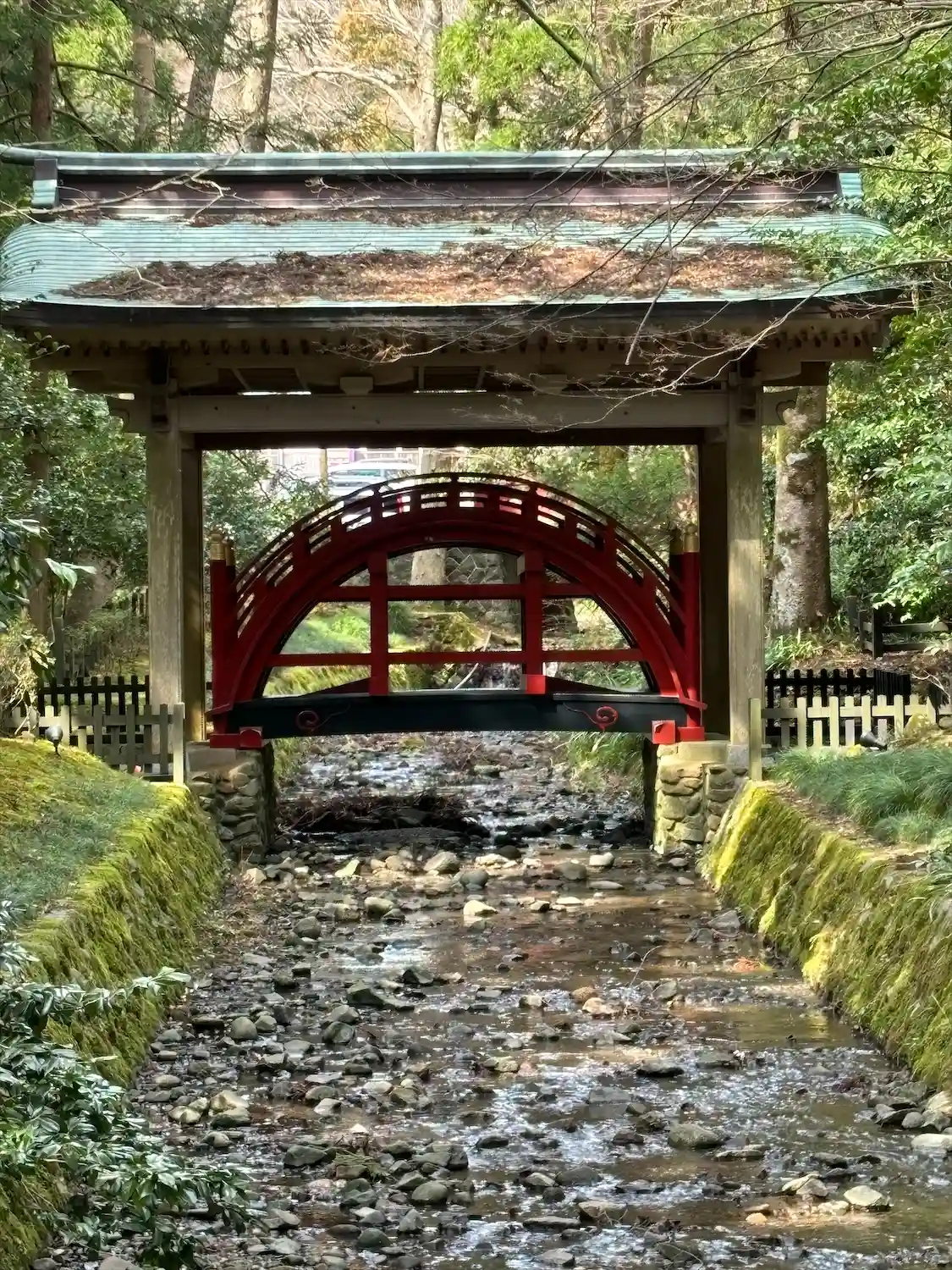 弥彦神社の⛩を入ってスグ左手に真っ赤な太鼓橋があります。