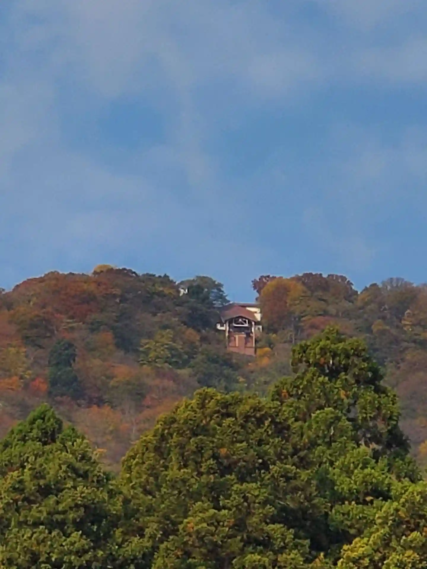 弥彦スカイライン山頂から、展望台に登るクライミングカーとパノラマタワー
