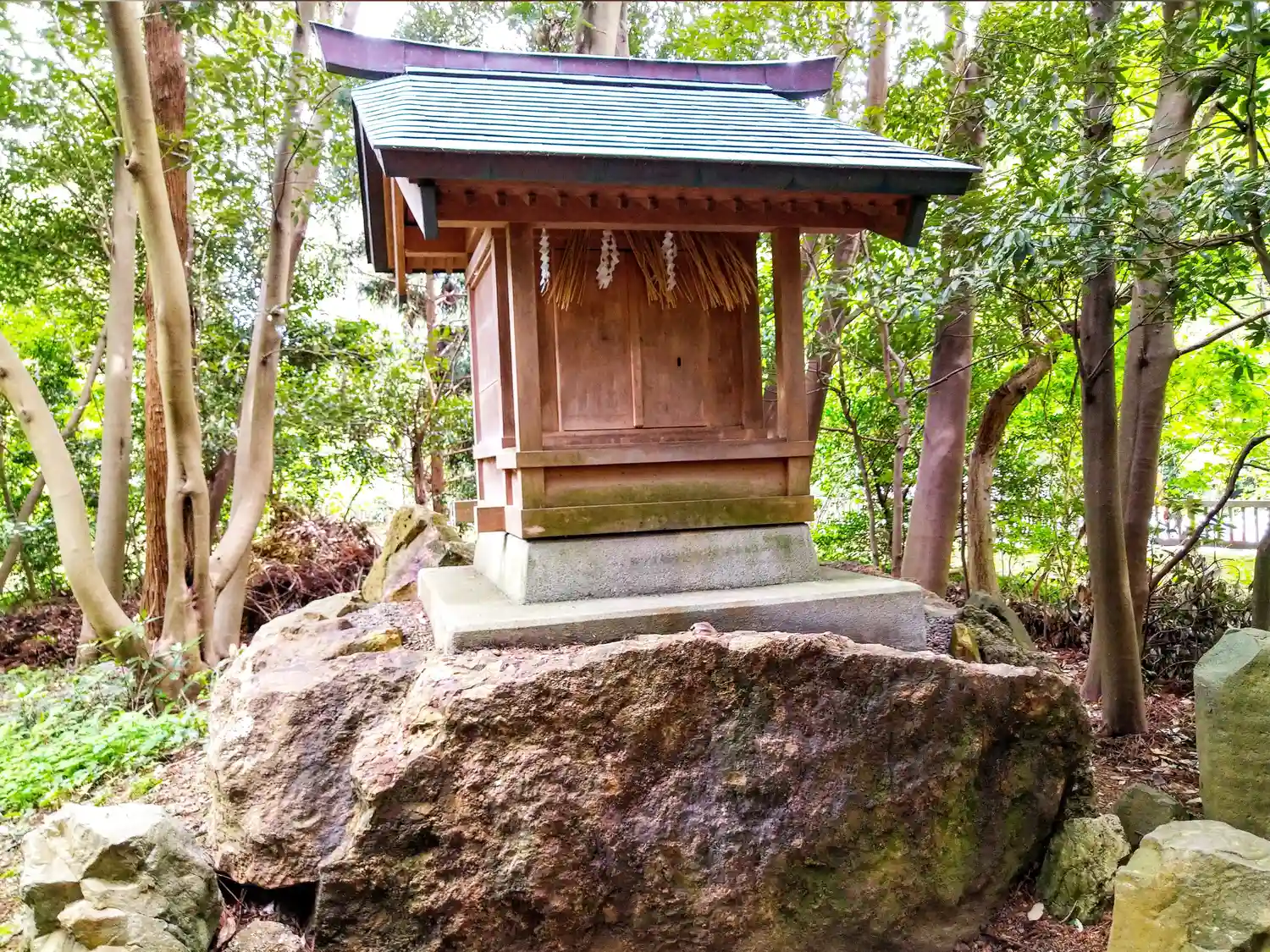 鳥居は変わっていて両側で支える型で太い柱は地面から6㎝ほど浮いている。
