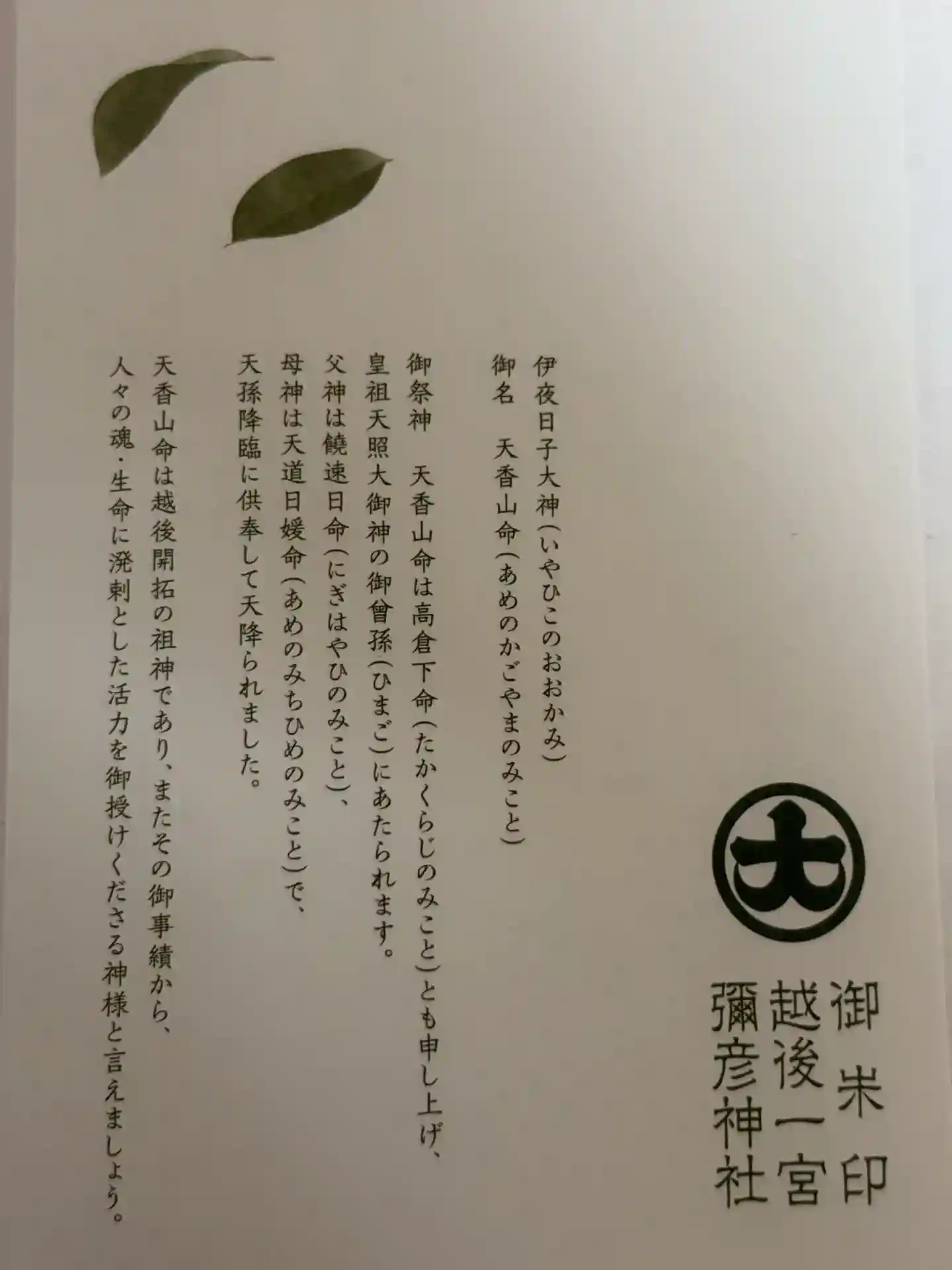 いわずとした越後一宮。御祭神は天香山命「アメノカゴヤマノミコト」で神武天皇の命を受け、住民に海水か…
