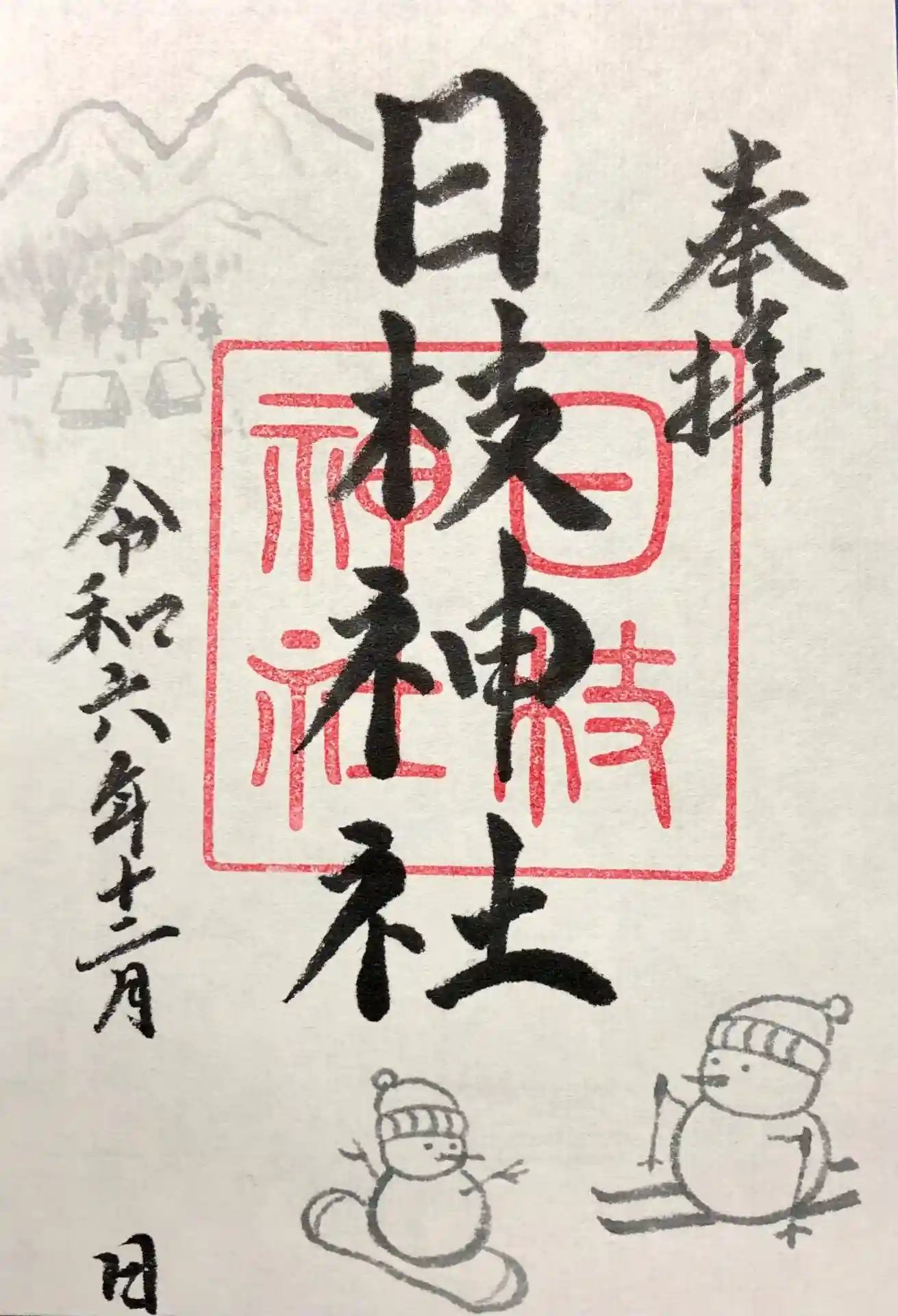 12月の御朱印は、雪山を楽しむ雪だるまさんです。