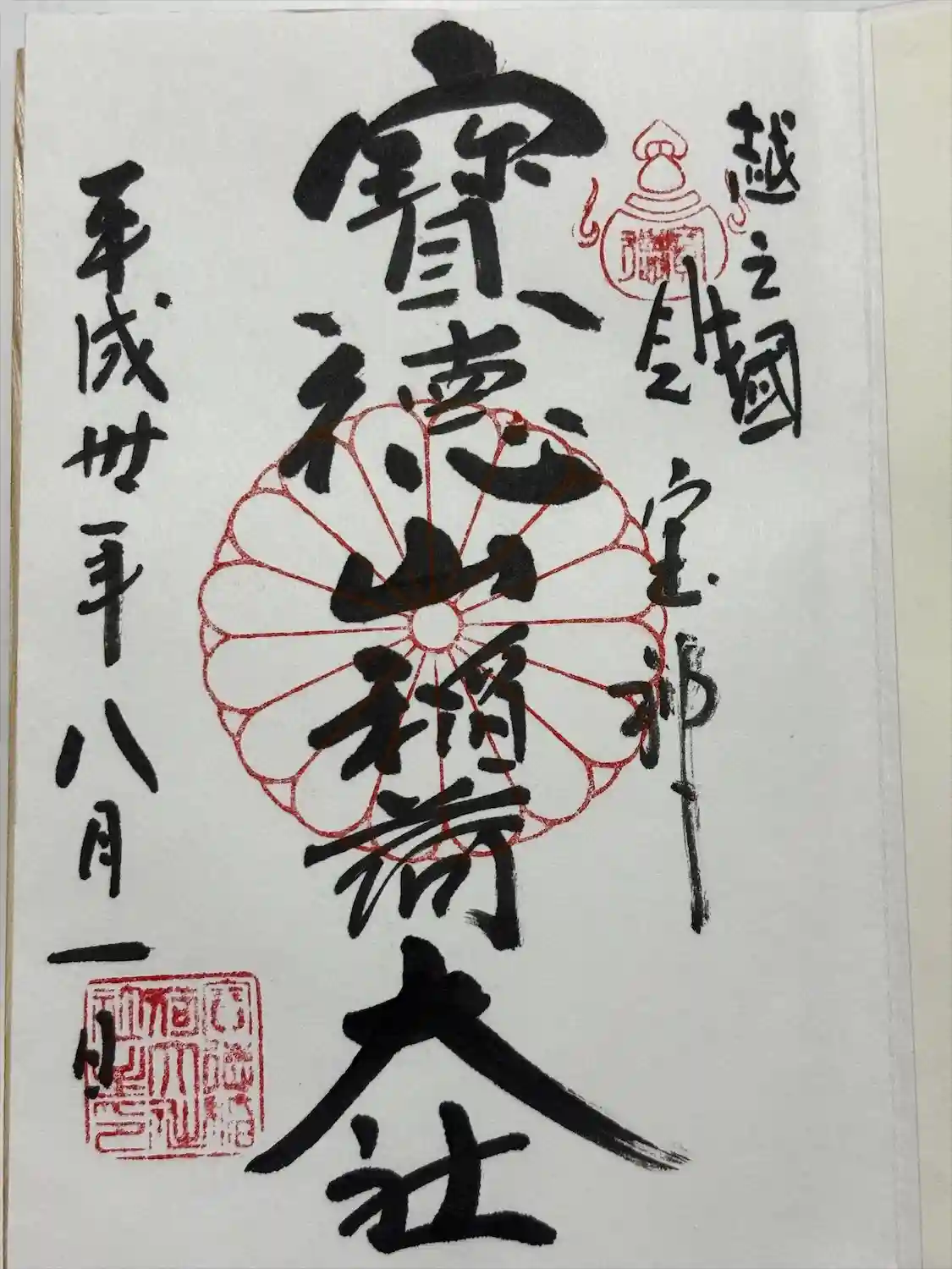 | 御朱印 | あり 真ん中に寶徳山稲荷神社、その右に財宝神と書かれ、右上に宝珠、真ん中に菊紋の印が押されています。 |