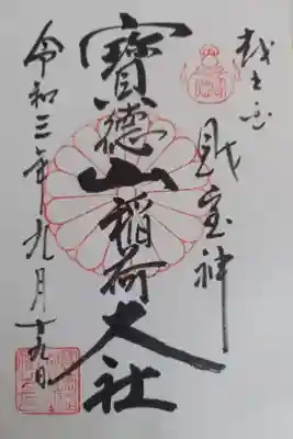 真ん中に寶徳山稲荷神社、その右に財宝神と書かれ、右上に宝珠、真ん中に菊紋の印が押されています。 | |||