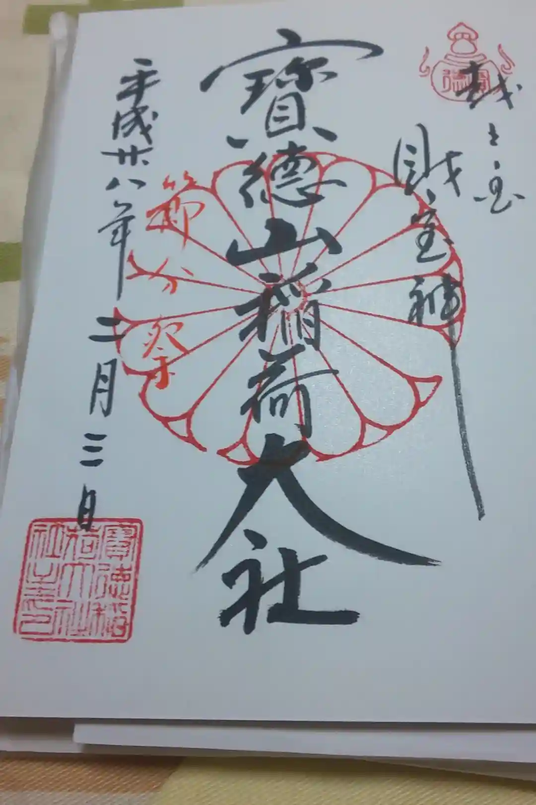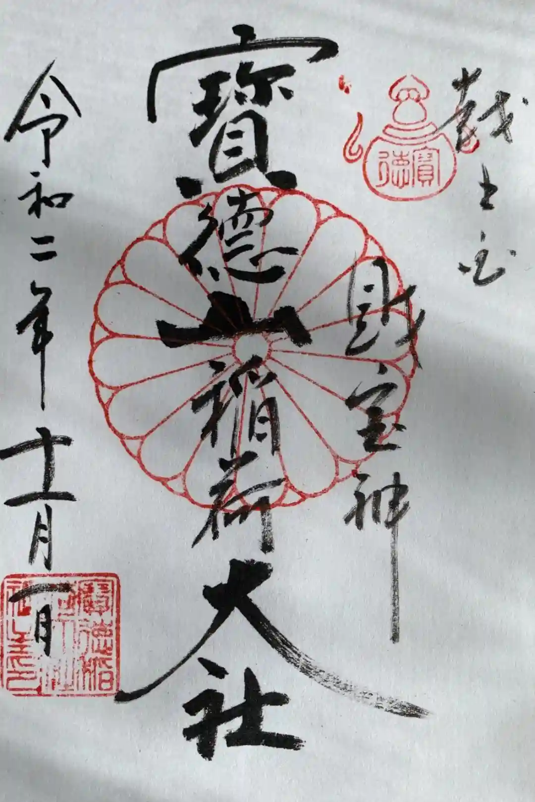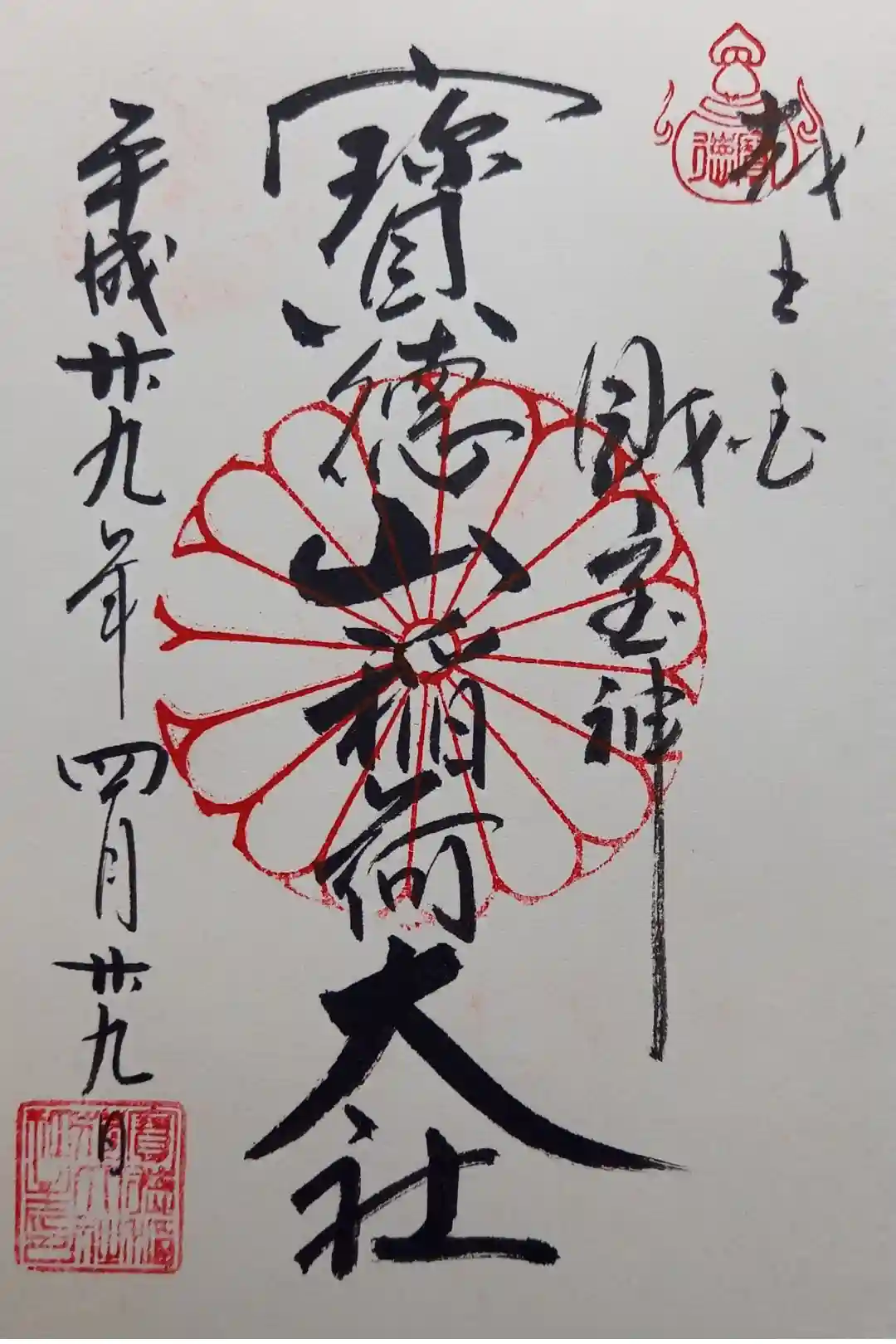 真ん中に寶徳山稲荷神社、その右に財宝神と書かれ、右上に宝珠、真ん中に菊紋の印が押されています。 | |||