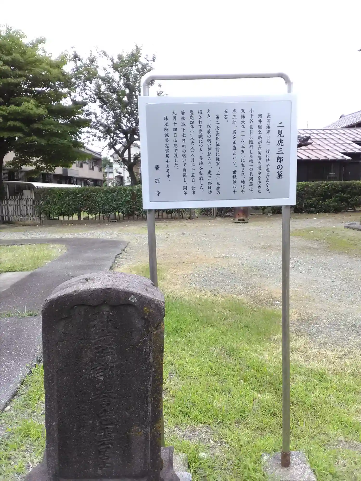 大目付二見虎三郎の墓です。小千谷談判に唯一同席した長岡藩士で、剣の腕前も藩随一だったとされています。小千谷談判での交渉決裂後、小千谷市内にある東忠にて、河井継之助と遅い昼食を取り、詩を吟じながら酒を嗜んだ逸話もあります。河井継之助亡き後は、会津に舞台を移し奮戦するも七日町口の戦いで負傷しその傷がもとで、山形にて亡くなっています。近年発見された肖像は、長州征伐時に撮影されたものと言われている。(慶応2(1866)年、撮影時31歳)