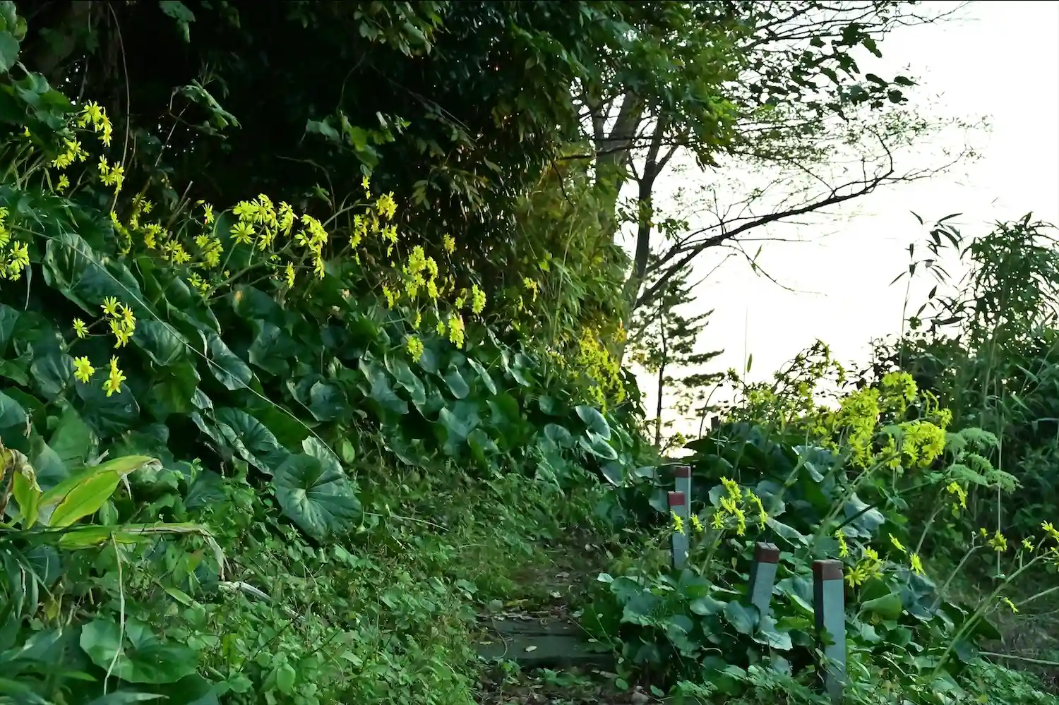 画像の 夕日とつわぶきの花 鳥居から境内の間に、つわぶき坂展望台入口があり、展望台下を つわぶき坂 と言います。つわぶきの花満開でした🌼