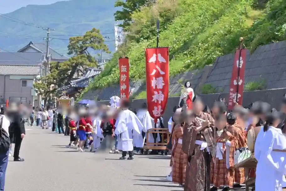 鳥居の前の旧北国街道を大名行列、お神輿が練り歩きます