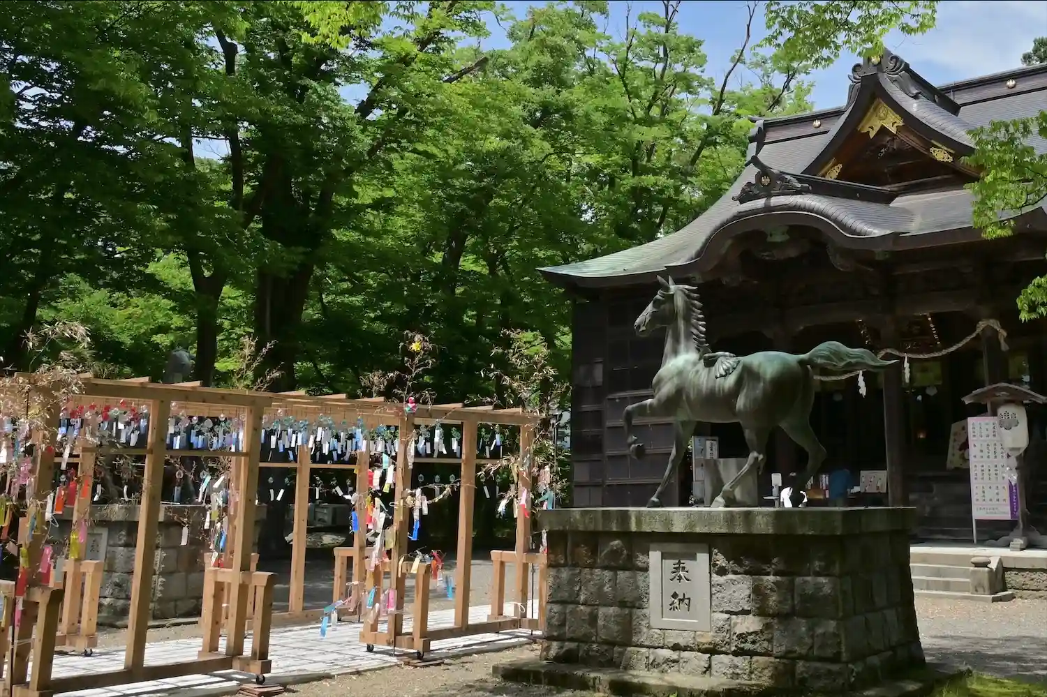 手水舎、風鈴参道に笹があり、短冊いっぱいでした。