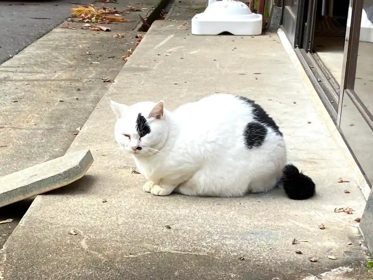 神社の猫ではなく、麓のカフェ「喫茶去」からご飯をもらいに来るのだとか😅