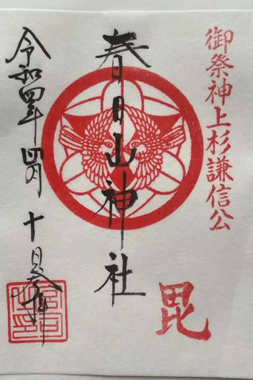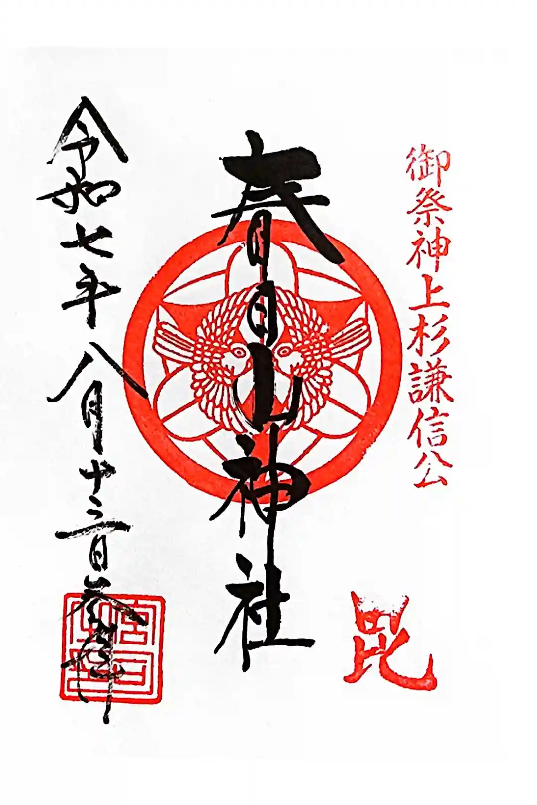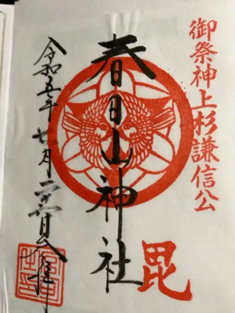 真ん中に春日山神社と書かれ、右上に御祭神上杉謙信公、真ん中には上杉家の家紋「竹に雀」、下に毘の印が押されています。