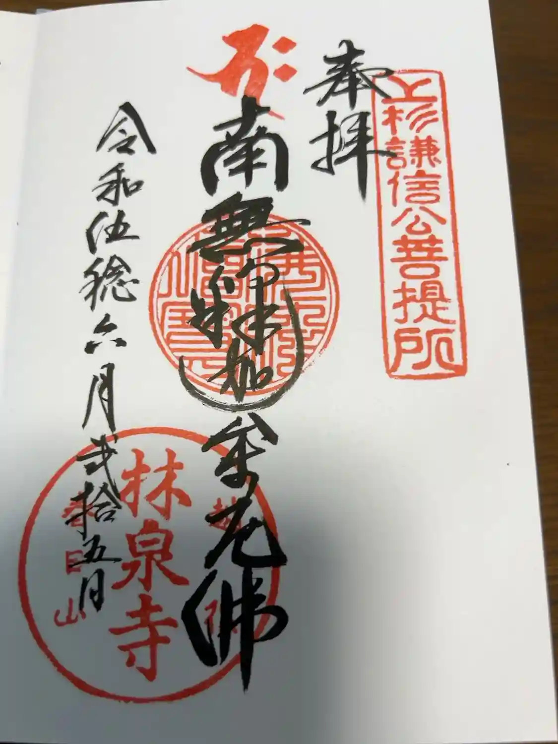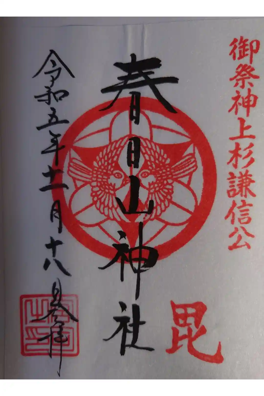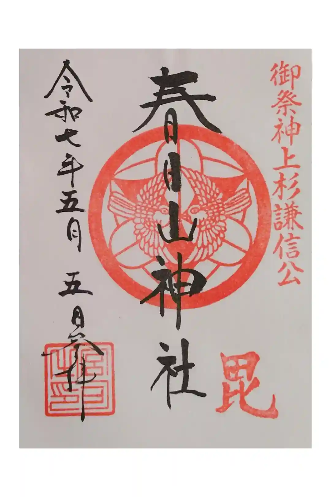 真ん中に春日山神社と書かれ、右上に御祭神上杉謙信公、真ん中には上杉家の家紋「竹に雀」、下に毘の印が押されています。