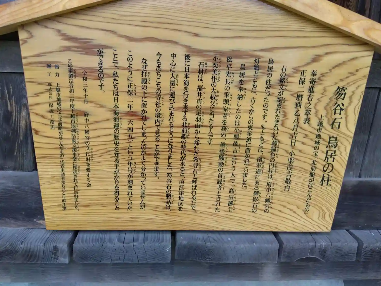 北前船で運ばれた福井市足羽山から採掘された薄緑色の笏谷石の鳥居(正保二年六四五年刻印)古くから拝殿下に置かれていた。
