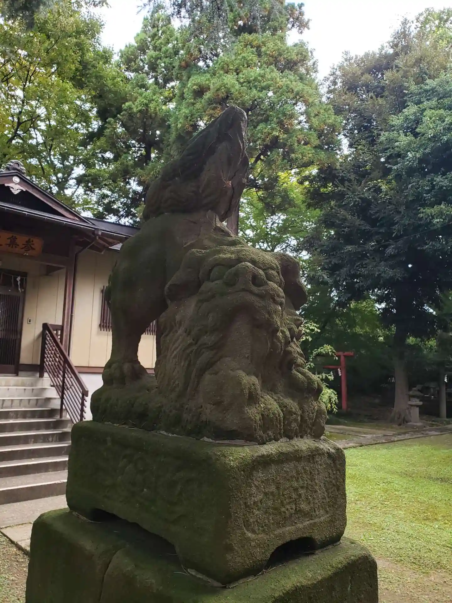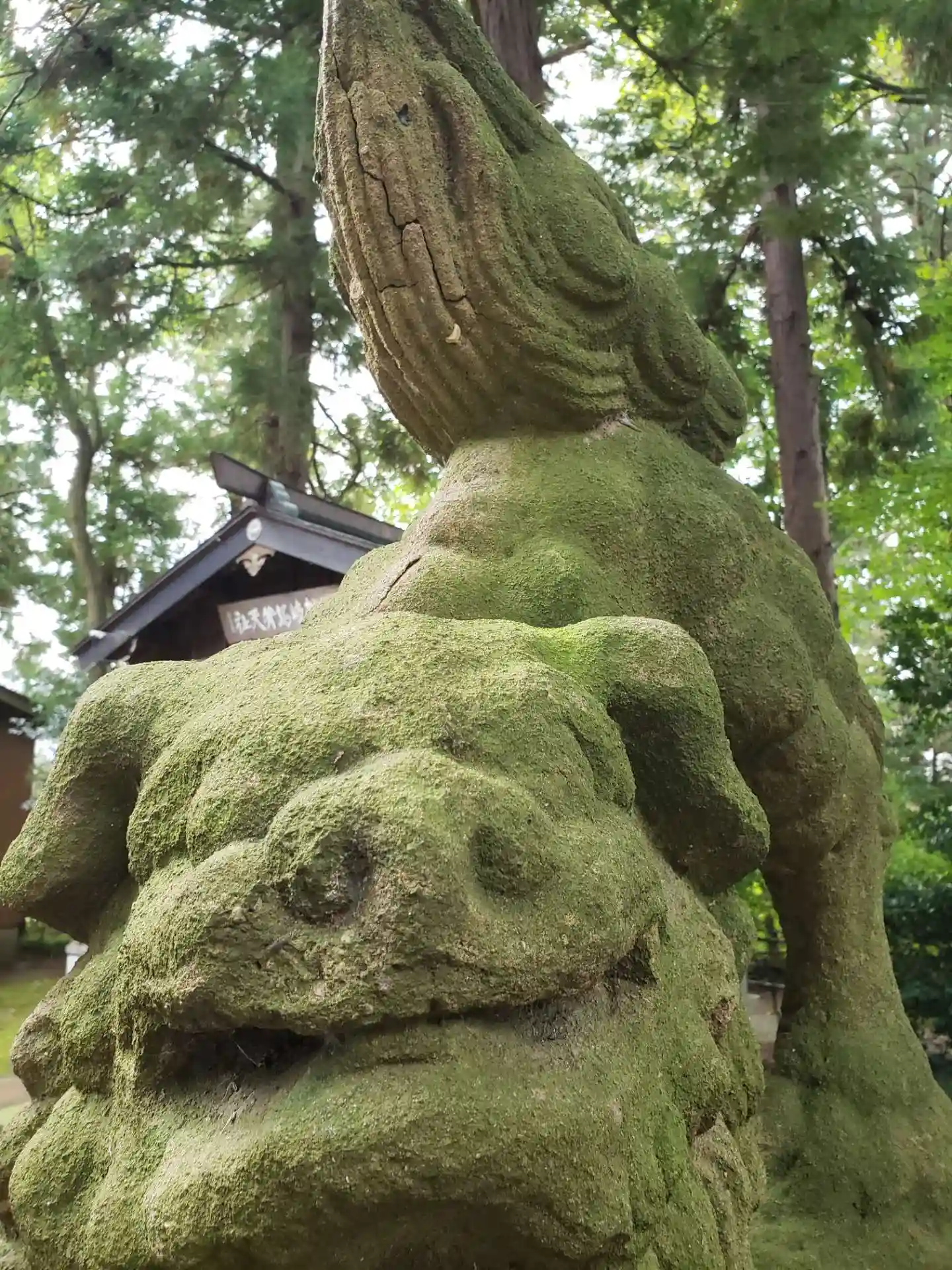 苔に覆われた狛犬さんがいらっしゃいます。