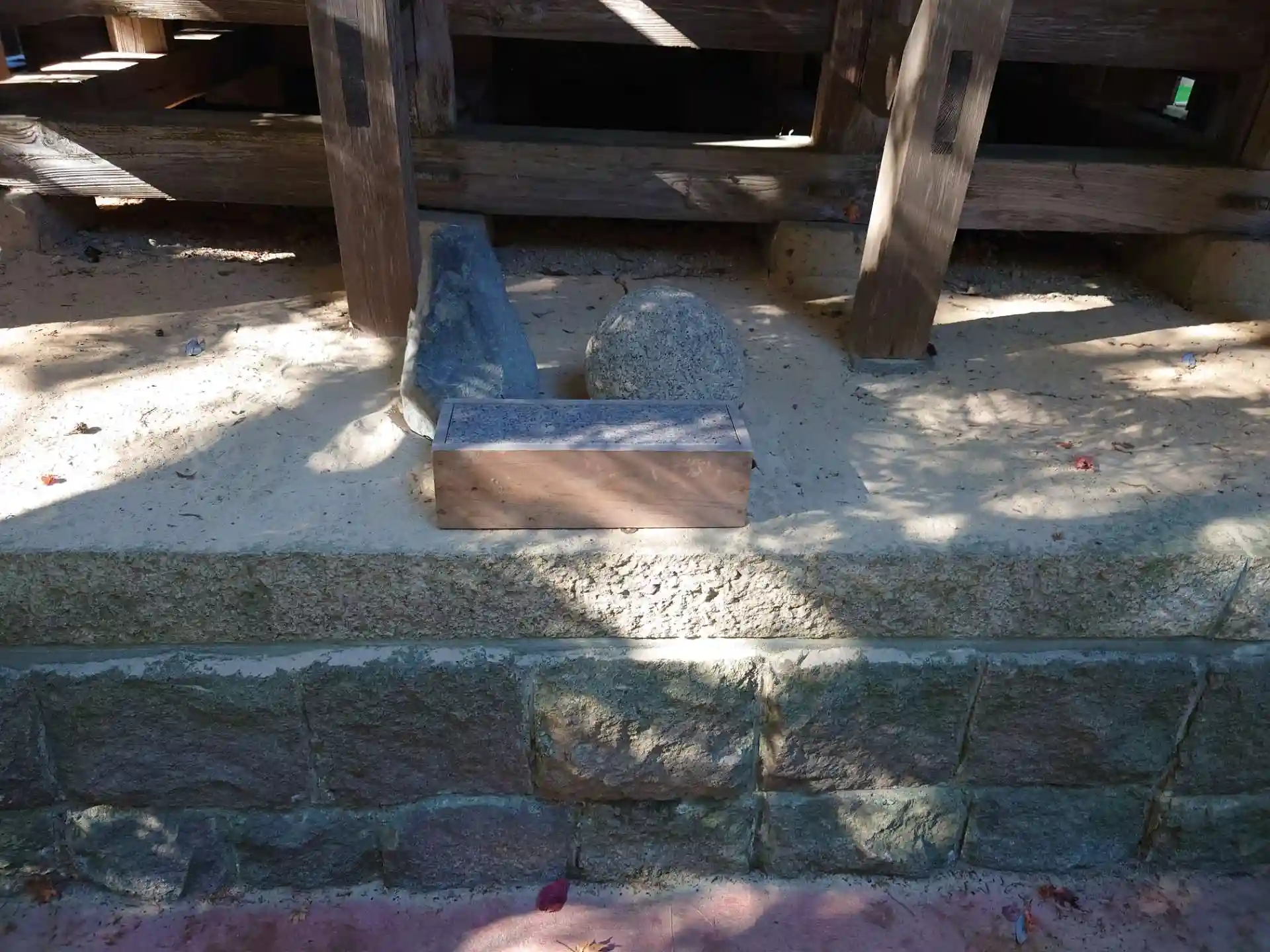 とんがり石と丸石 左手をとんがり石に右手を丸石の上に置くと、負の力をとんがり石が吸い込み、正の力を丸石がもたらすといわれています