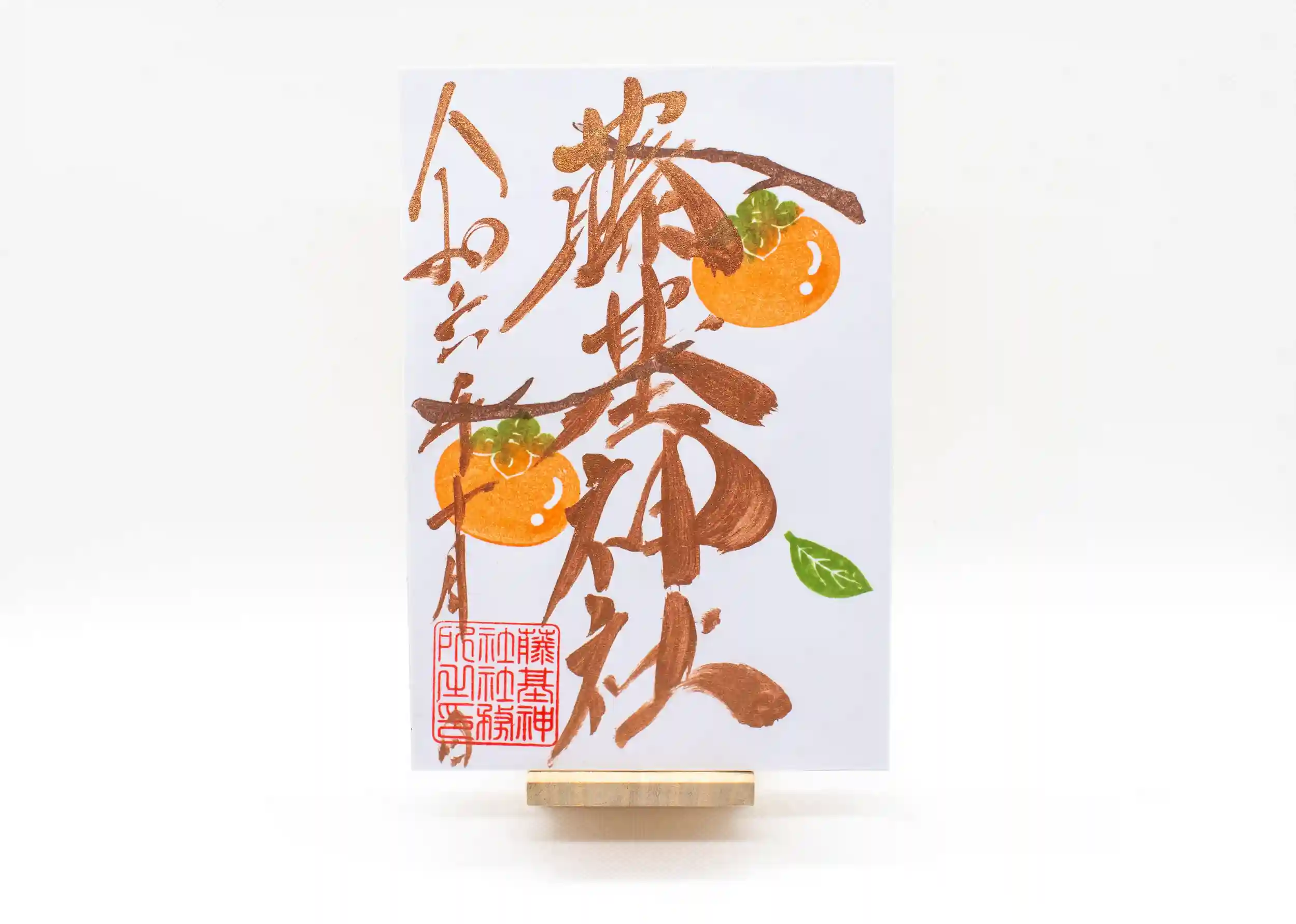 甘い果実が数多く実る、鮮やかな朱色の柿を配した御朱印です。