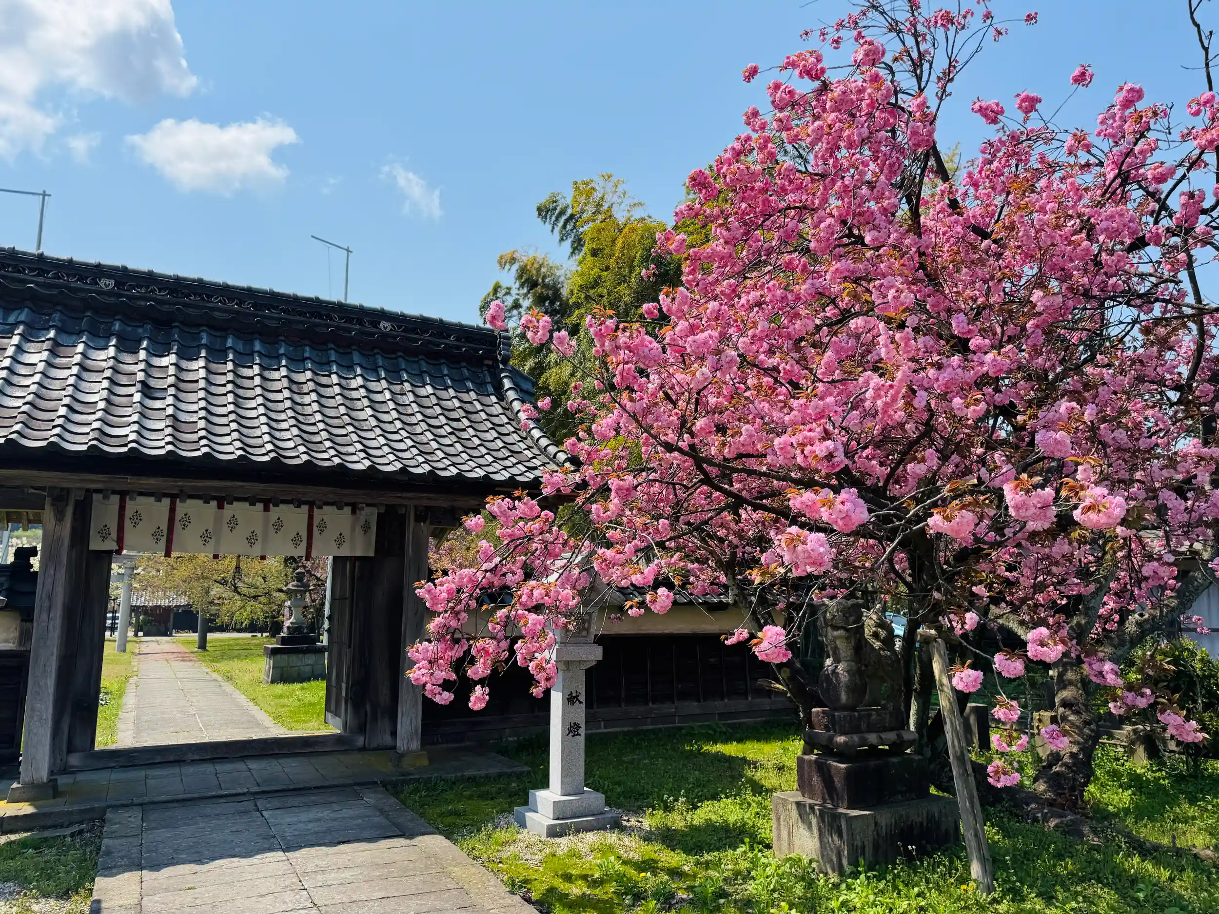 藤基神社の境内では、今まさに八重桜と御衣黄(ぎょいこう)が見頃を迎えています。