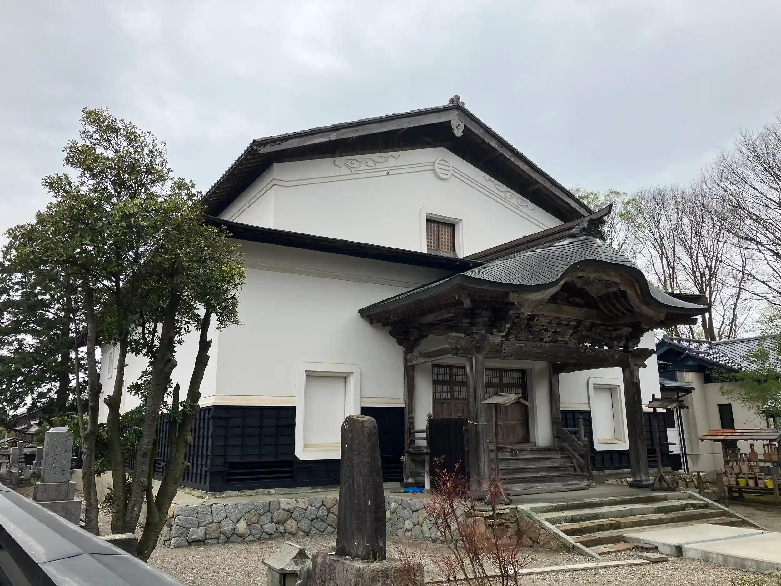 白壁土蔵造りの本堂は1818年建築で重文指定されている。