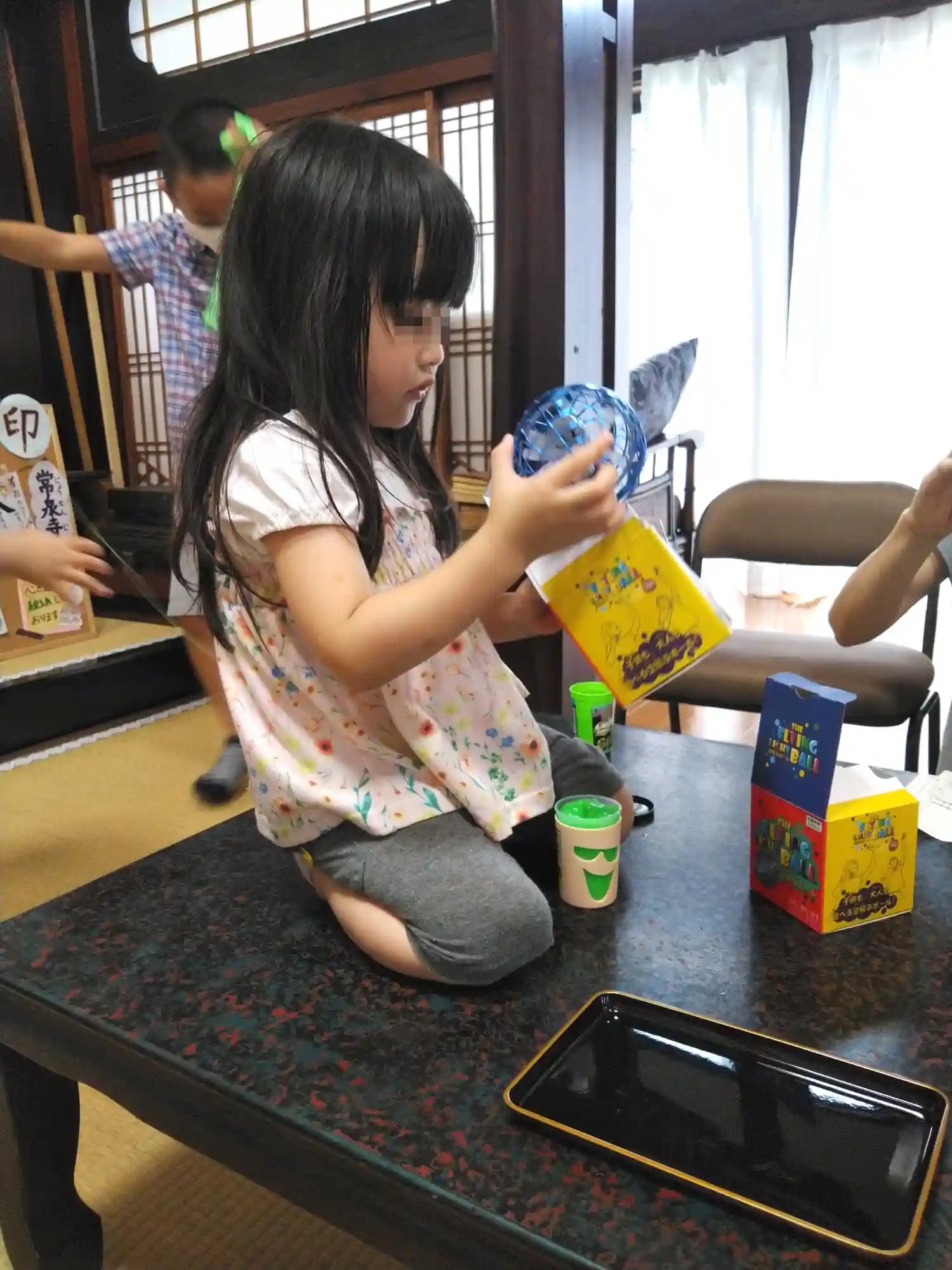 ドローンボールに興奮してテーブルの上で正座の次女ちゃん😮