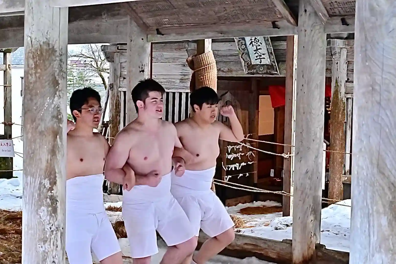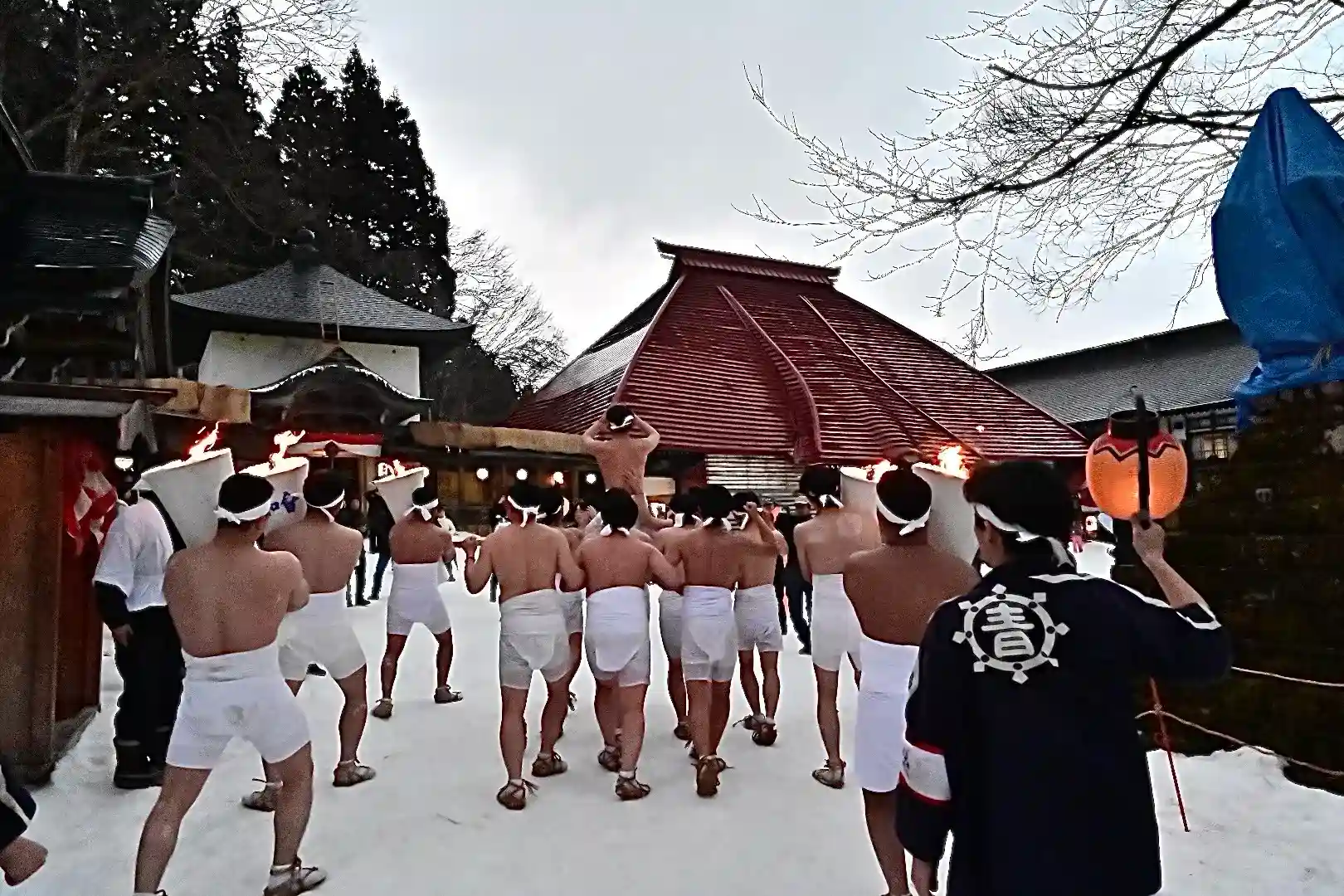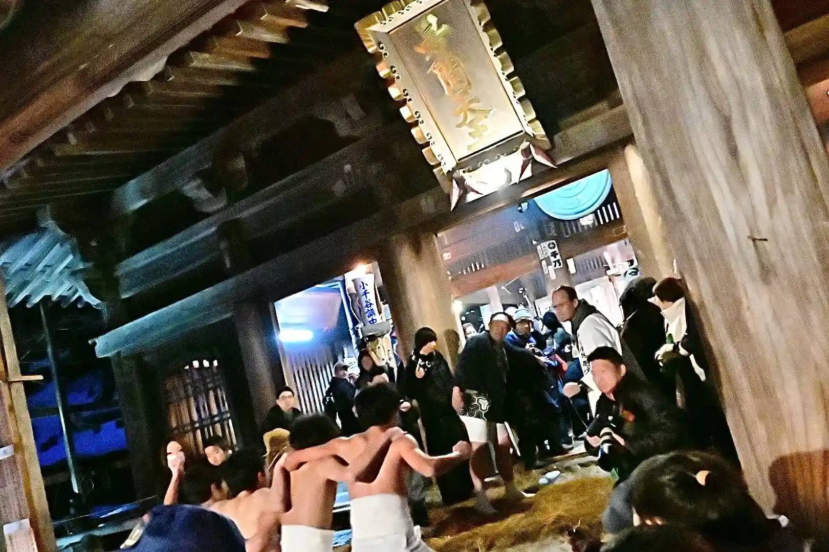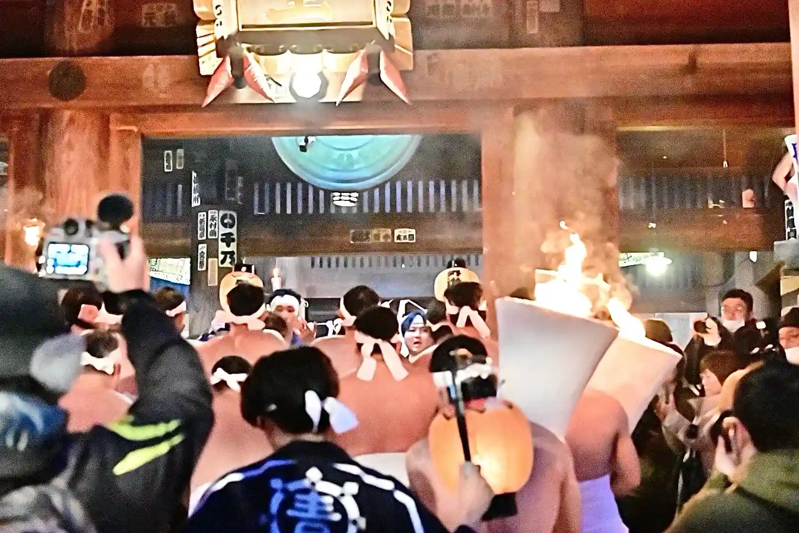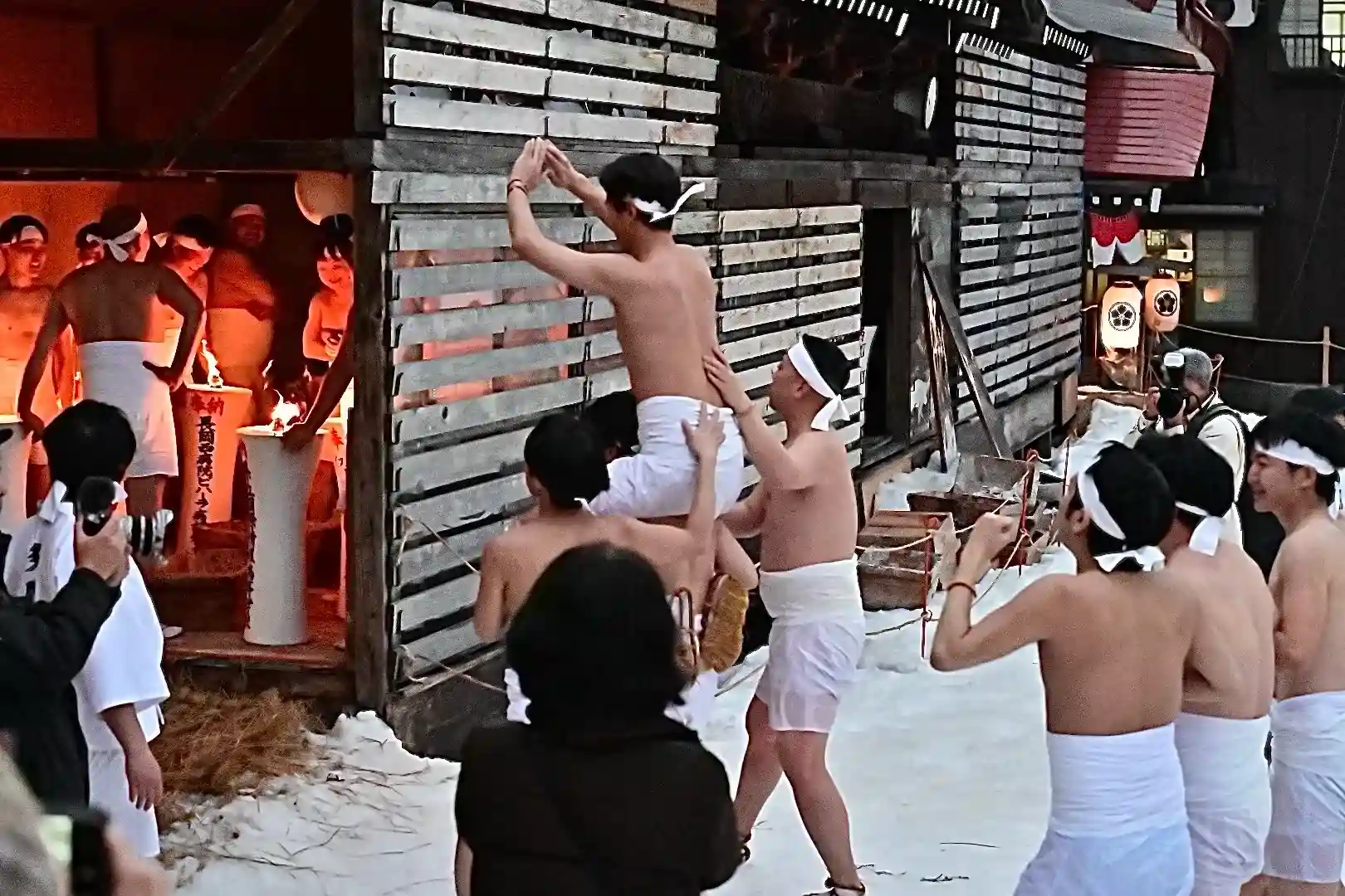 お正月の3日の御開帳で我先に毘沙門天を拝もうと、服を脱ぐほど多くの民衆が集まり押合い始めたのが今の形になって行ったと聞きました 現在、上半身裸の漢衆が「サンヨー サンヨ!」の掛け声(漢字だと撒与)と共に押合い、一段高い所に祀られる毘沙門天を誰よりも早く参拝しようと押し合う姿は圧倒されます(ちな、見る方は、コーイ! コーイ)