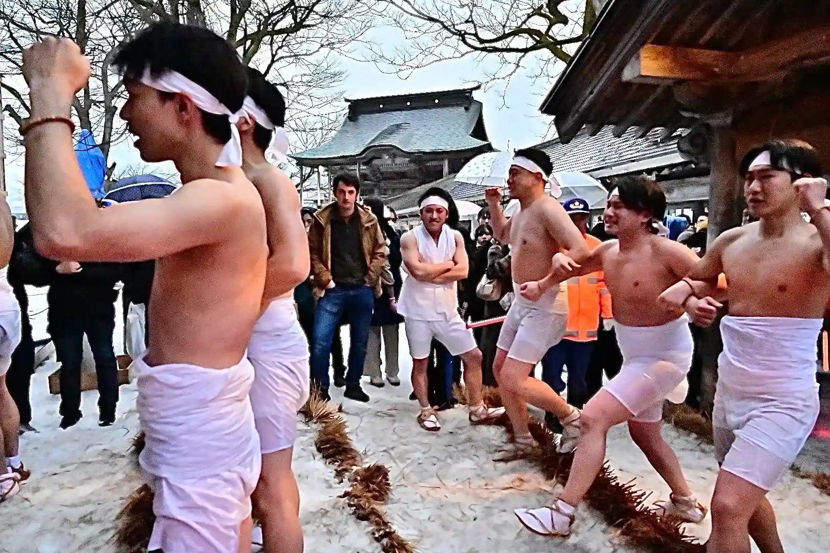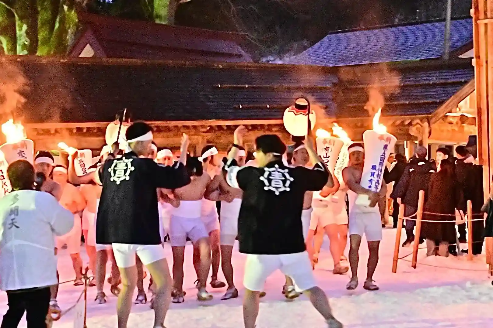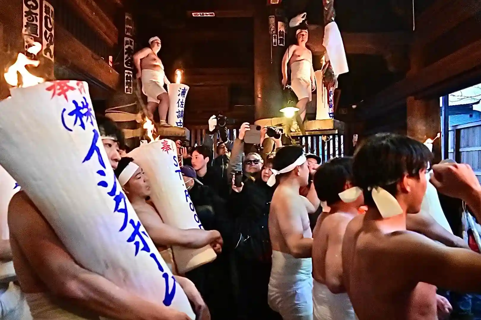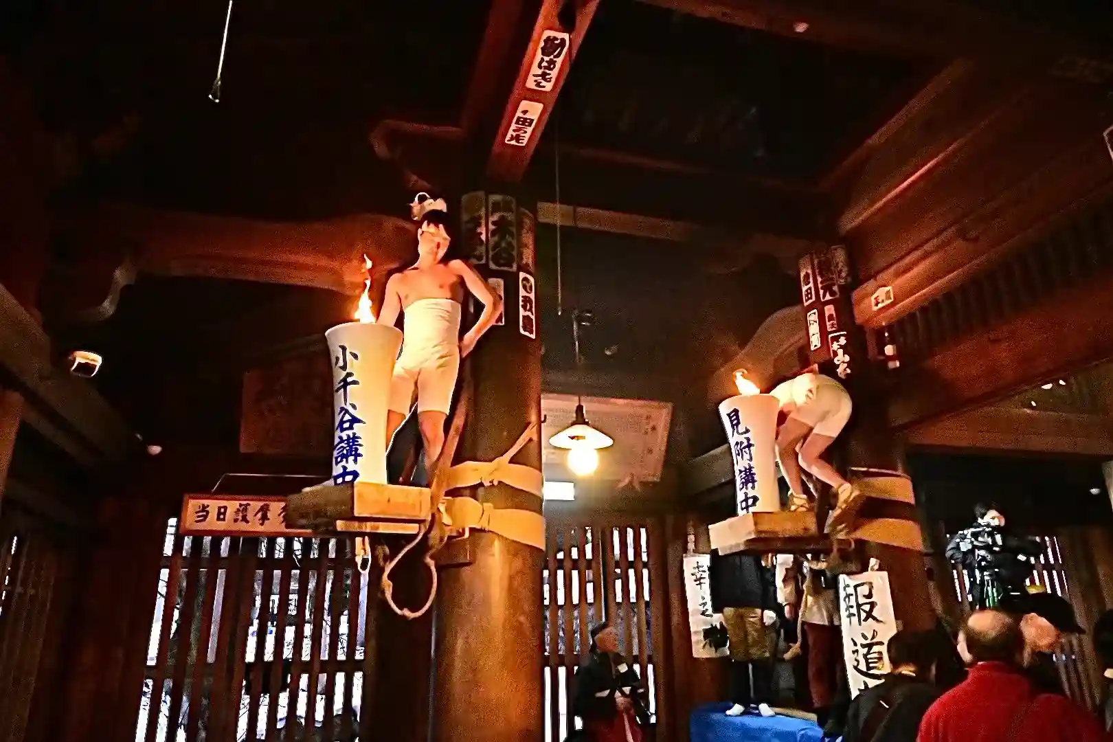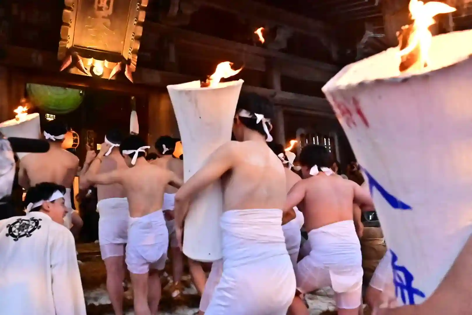 お正月の3日の御開帳で我先に毘沙門天を拝もうと、服を脱ぐほど多くの民衆が集まり押合い始めたのが今の形になって行ったと聞きました 現在、上半身裸の漢衆が「サンヨー サンヨ!」の掛け声(漢字だと撒与)と共に押合い、一段高い所に祀られる毘沙門天を誰よりも早く参拝しようと押し合う姿は圧倒されます(ちな、見る方は、コーイ! コーイ)