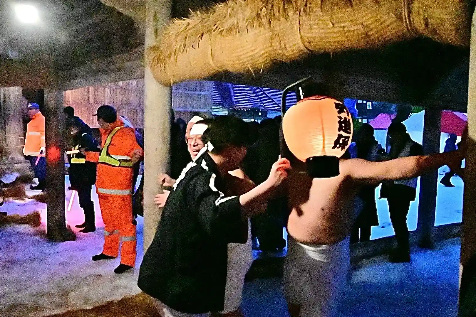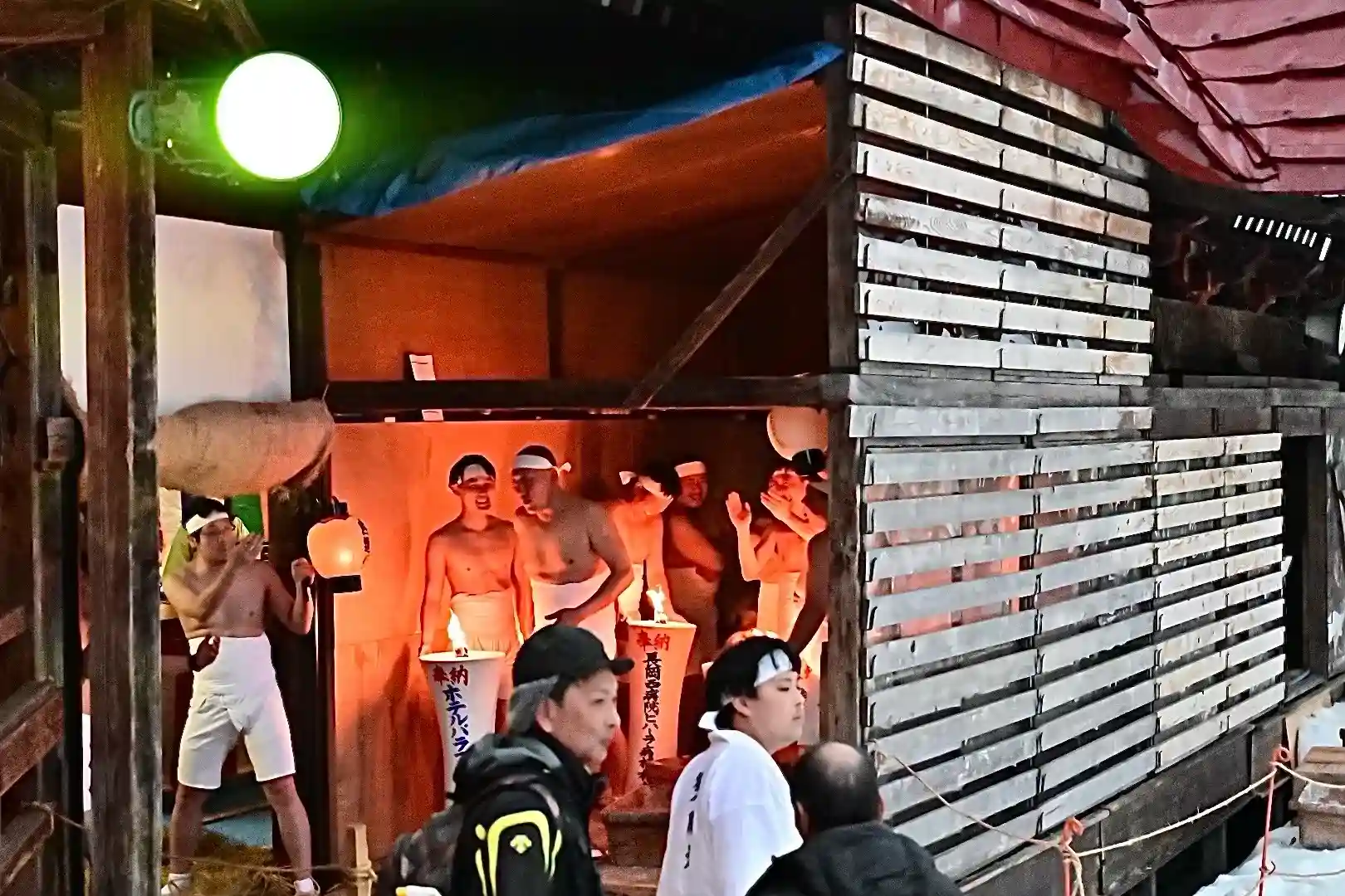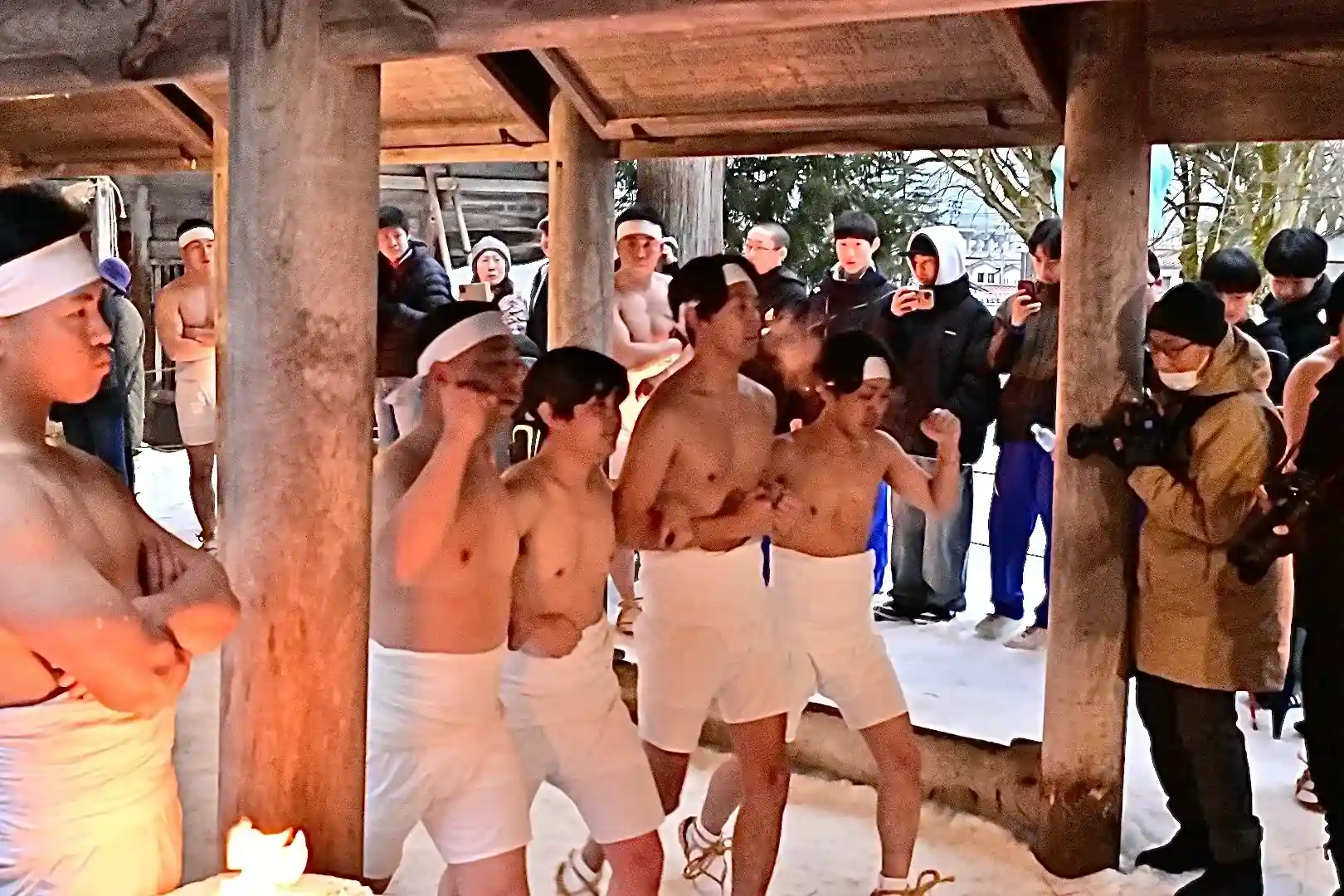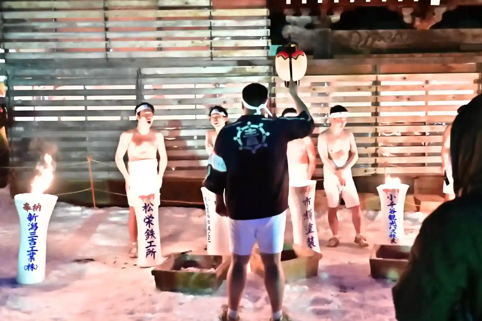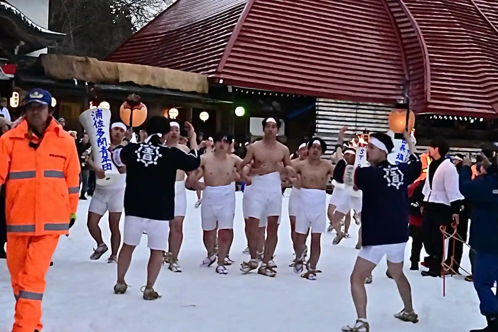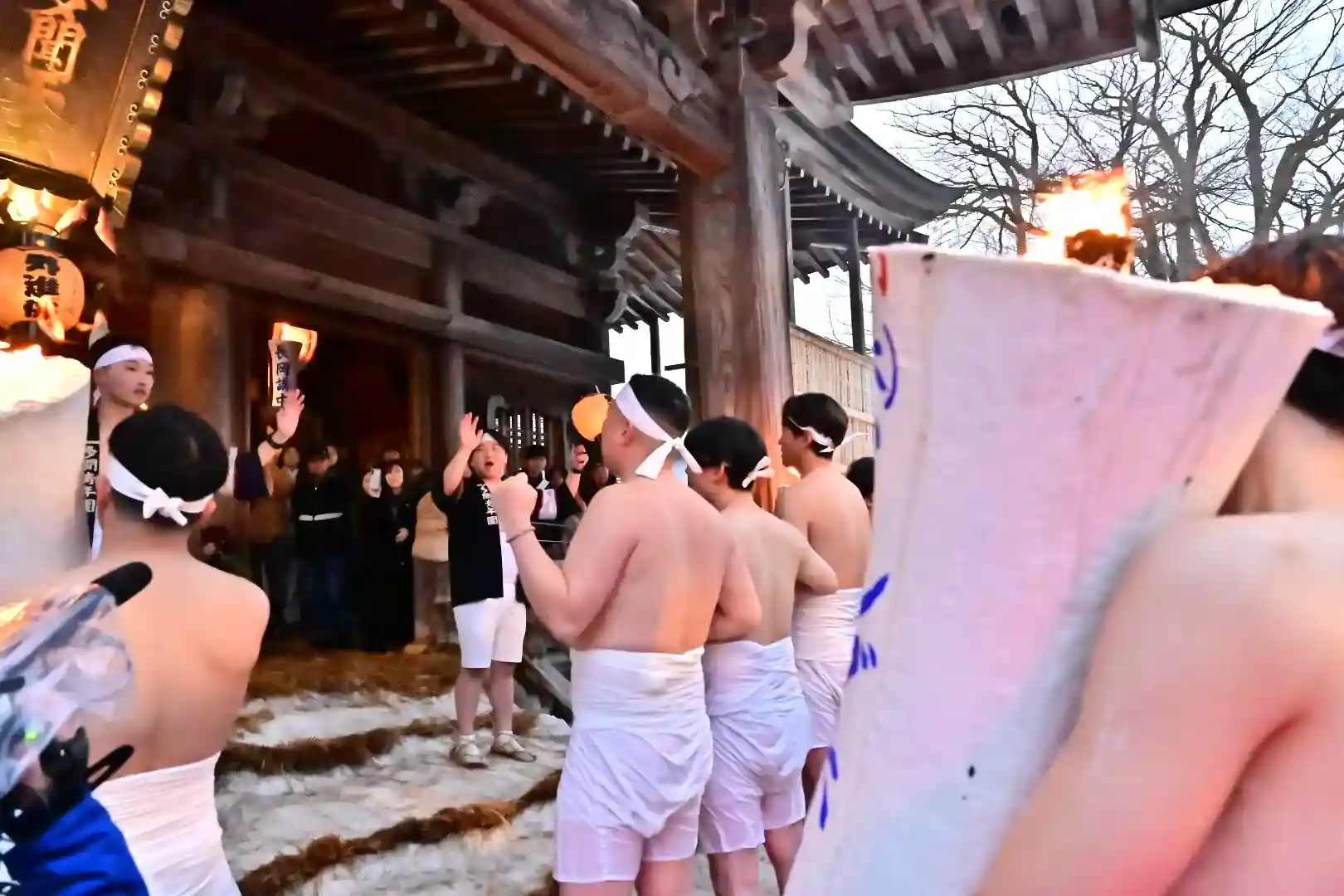 お正月の3日の御開帳で我先に毘沙門天を拝もうと、服を脱ぐほど多くの民衆が集まり押合い始めたのが今の形になって行ったと聞きました 現在、上半身裸の漢衆が「サンヨー サンヨ!」の掛け声(漢字だと撒与)と共に押合い、一段高い所に祀られる毘沙門天を誰よりも早く参拝しようと押し合う姿は圧倒されます(ちな、見る方は、コーイ! コーイ)