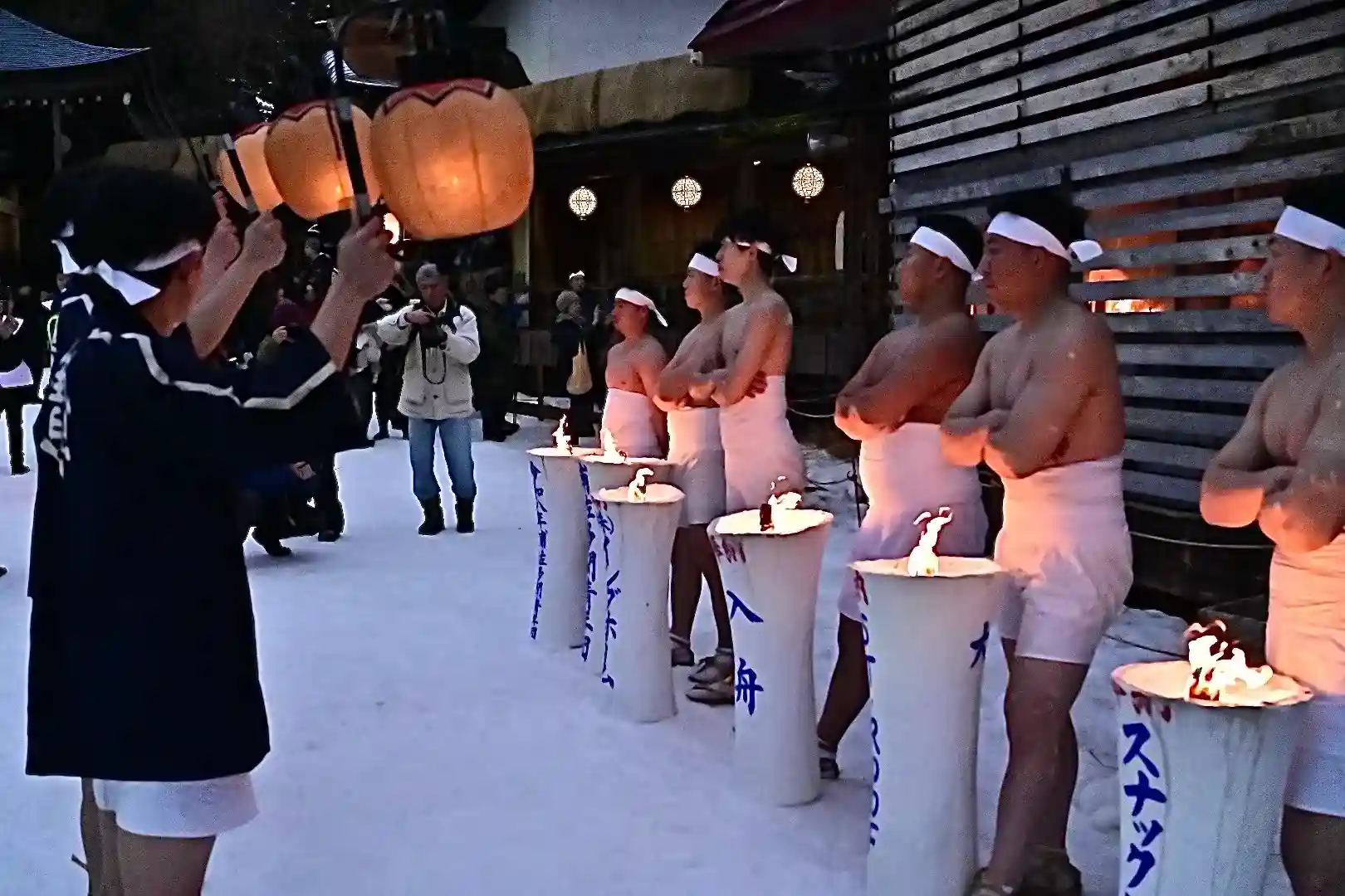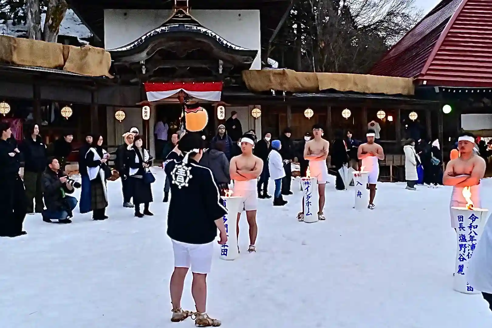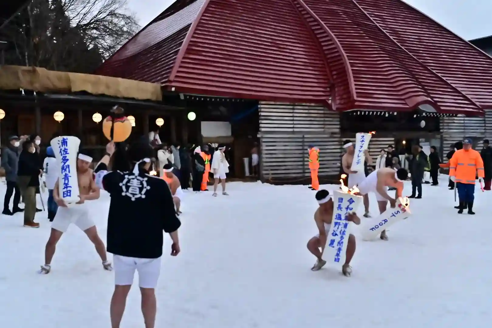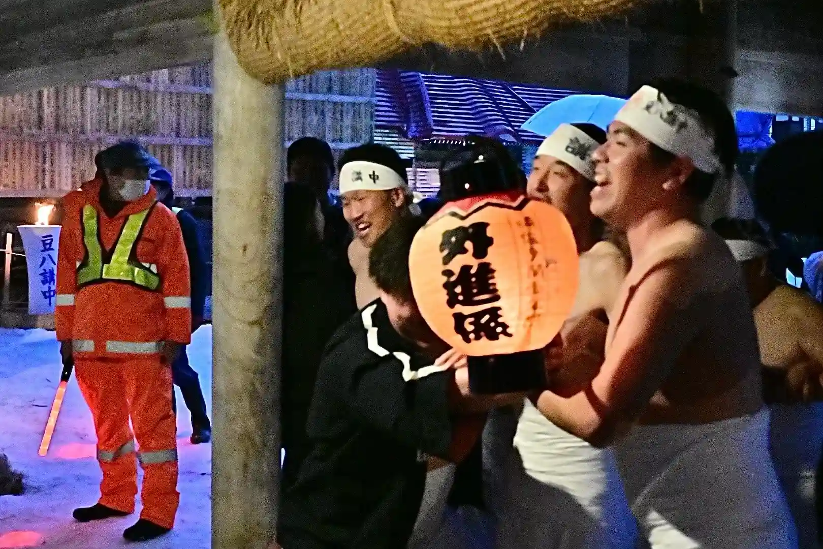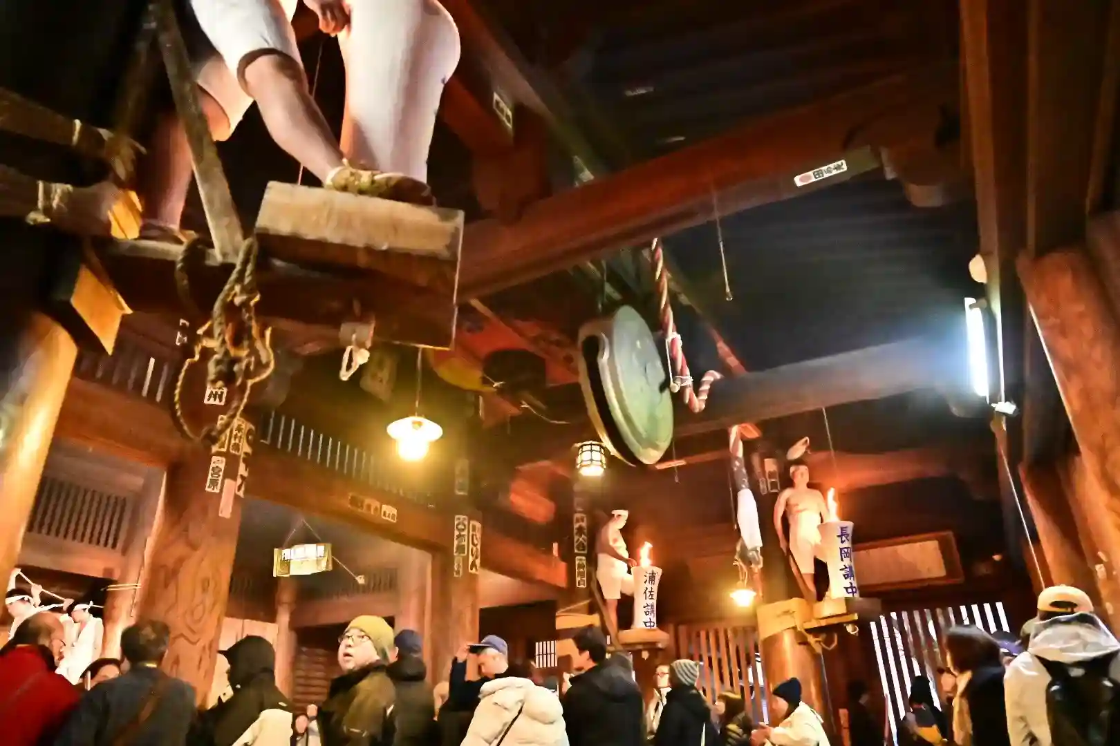 お正月の3日の御開帳で我先に毘沙門天を拝もうと、服を脱ぐほど多くの民衆が集まり押合い始めたのが今の形になって行ったと聞きました 現在、上半身裸の漢衆が「サンヨー サンヨ!」の掛け声(漢字だと撒与)と共に押合い、一段高い所に祀られる毘沙門天を誰よりも早く参拝しようと押し合う姿は圧倒されます(ちな、見る方は、コーイ! コーイ)