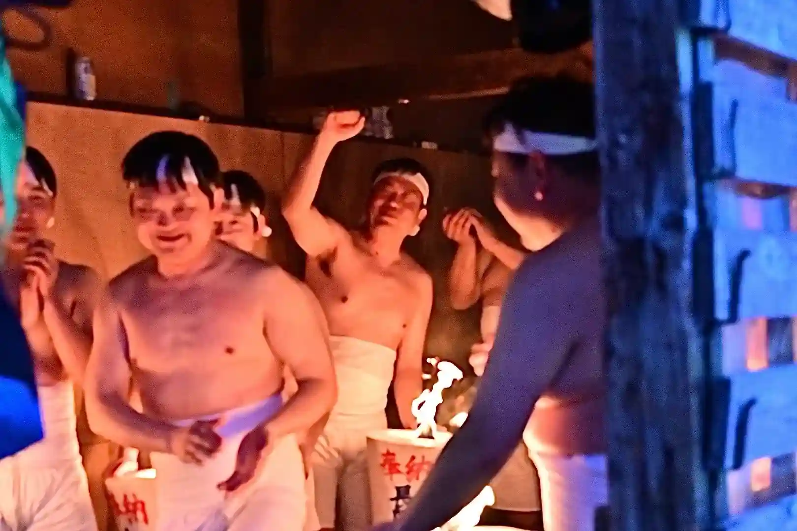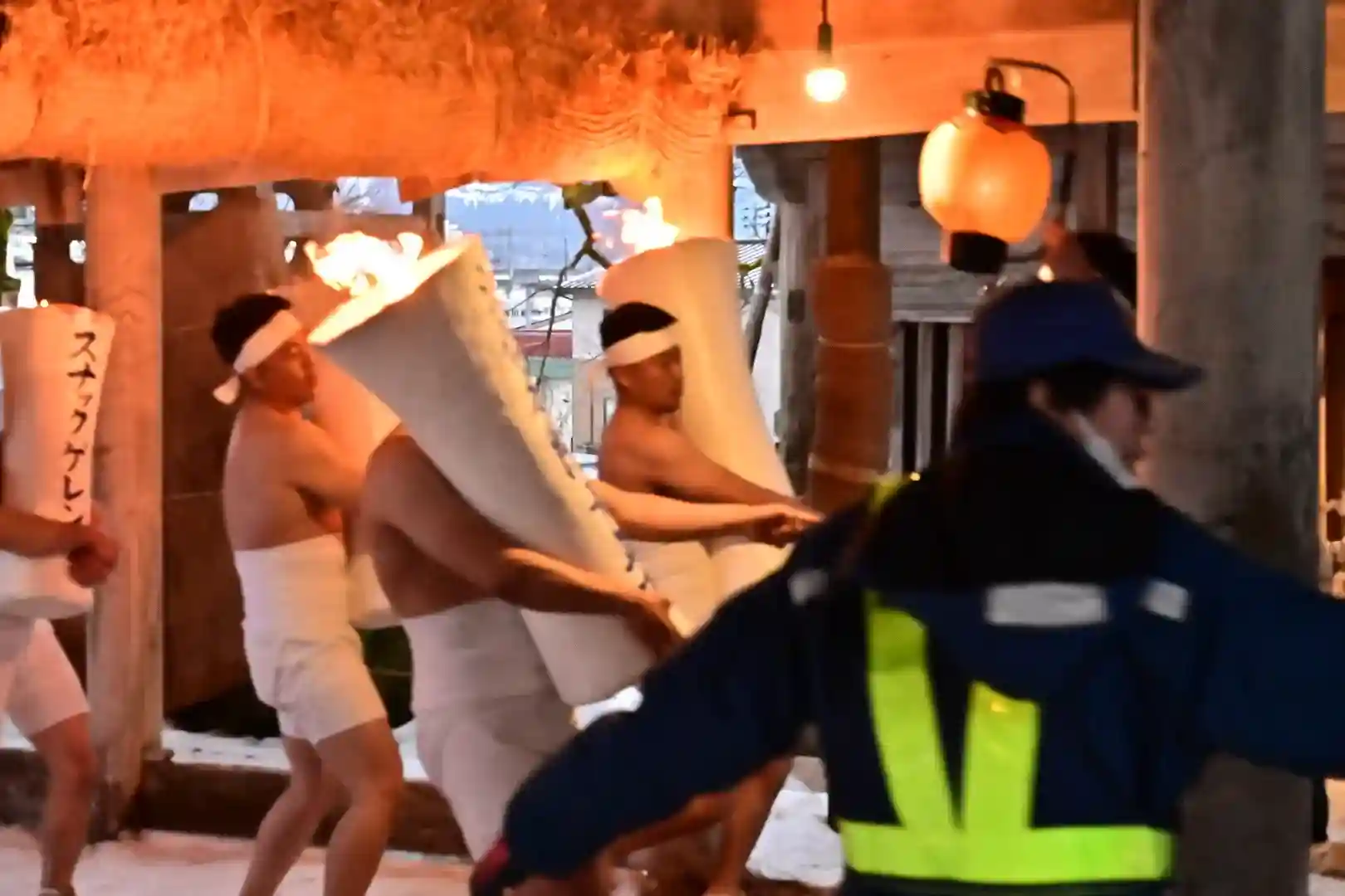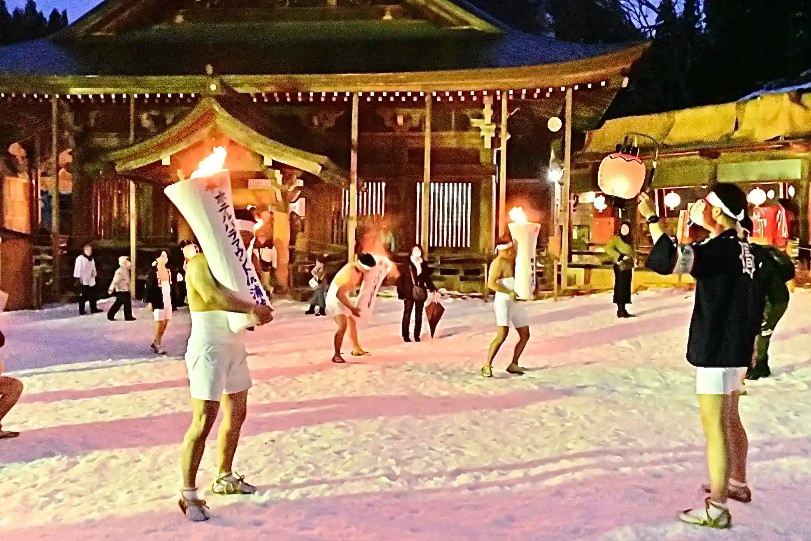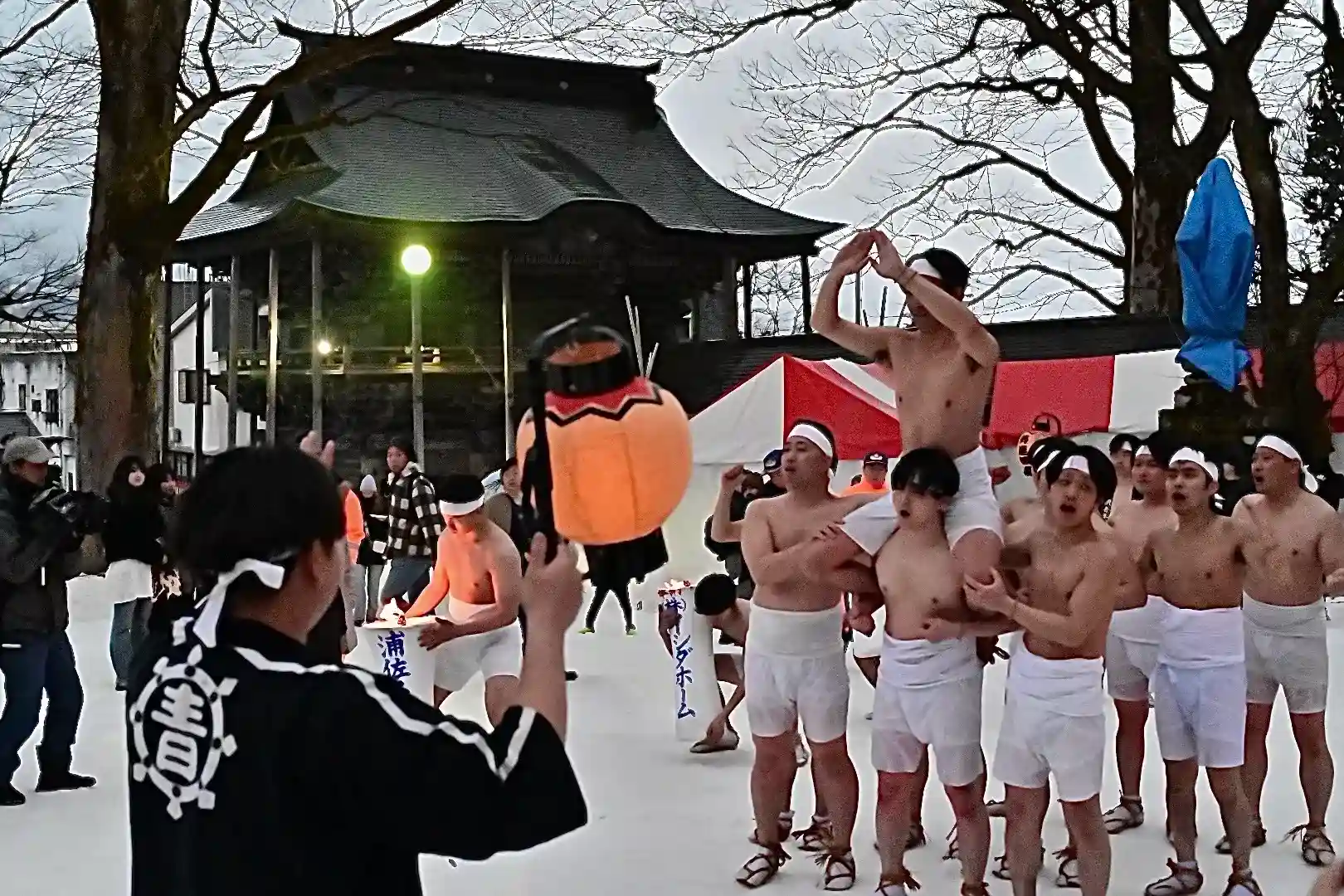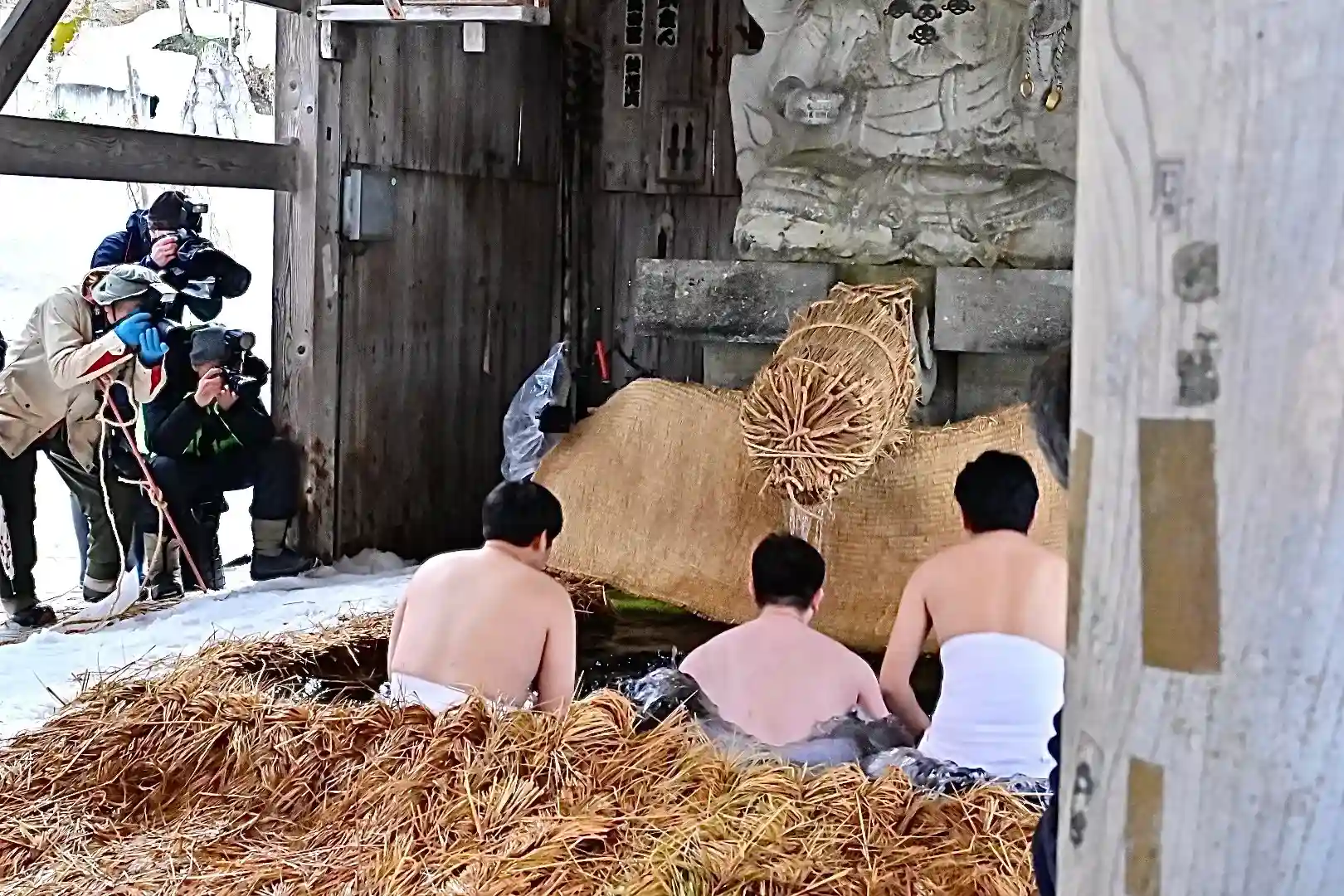 お正月の3日の御開帳で我先に毘沙門天を拝もうと、服を脱ぐほど多くの民衆が集まり押合い始めたのが今の形になって行ったと聞きました 現在、上半身裸の漢衆が「サンヨー サンヨ!」の掛け声(漢字だと撒与)と共に押合い、一段高い所に祀られる毘沙門天を誰よりも早く参拝しようと押し合う姿は圧倒されます(ちな、見る方は、コーイ! コーイ)